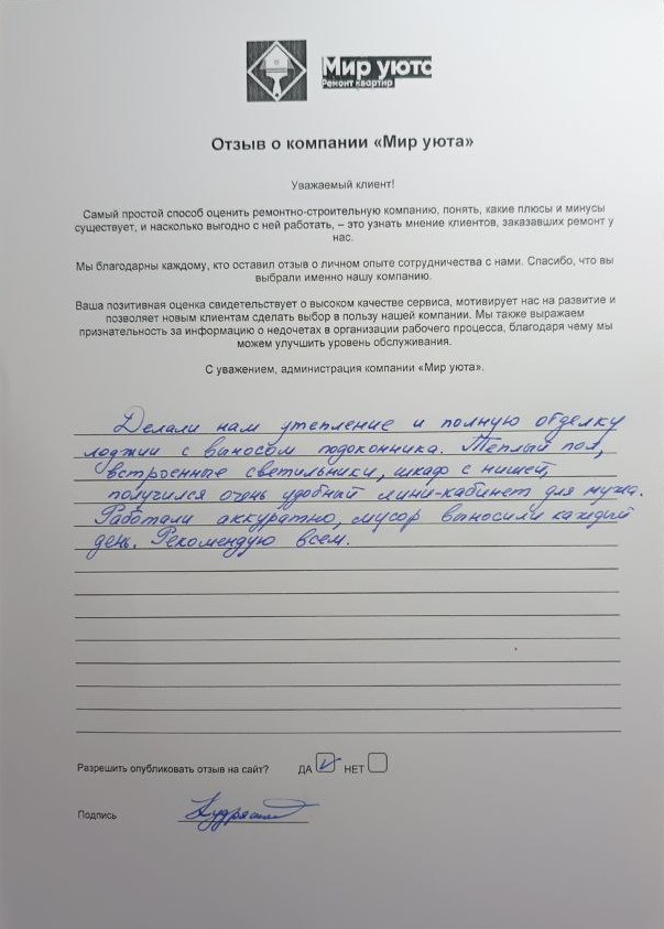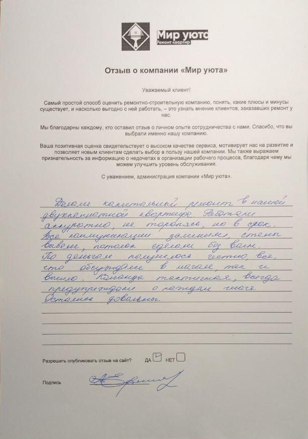 В данном разделе размещены отзывы наших клиентов, пожелавшим поделиться своими впечатлениями о качестве ремонта, профессионализме мастеров компании и уровне обслуживания. Мы еженедельно проводим опросы заказчиков, измеряя Индекс Удовлетворенности. Для нас важно мнение каждого, кто выбрал нашу ремонтно-строительную организацию в качестве исполнителя. Отзывы будут интересны и потенциальным заказчикам. Возможно, именно ваша оценка деятельности компании поможет потенциальным клиентам выбрать нас для выполнения будущего ремонта.