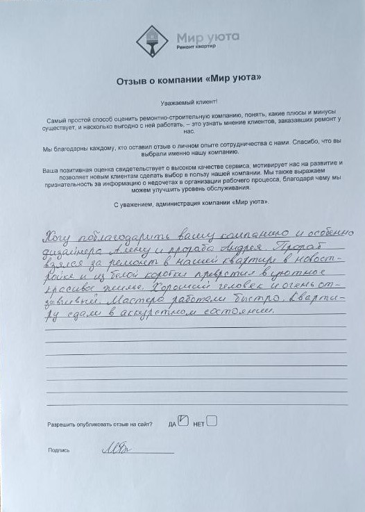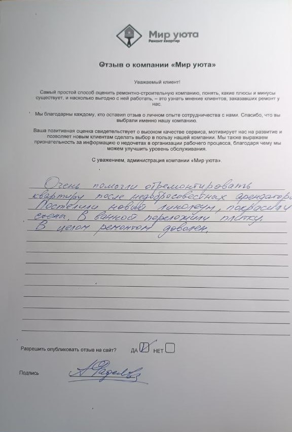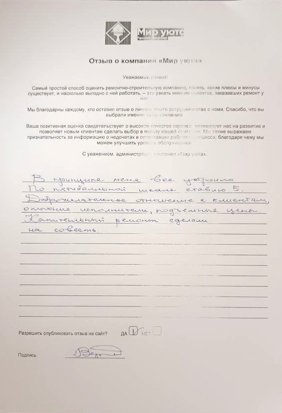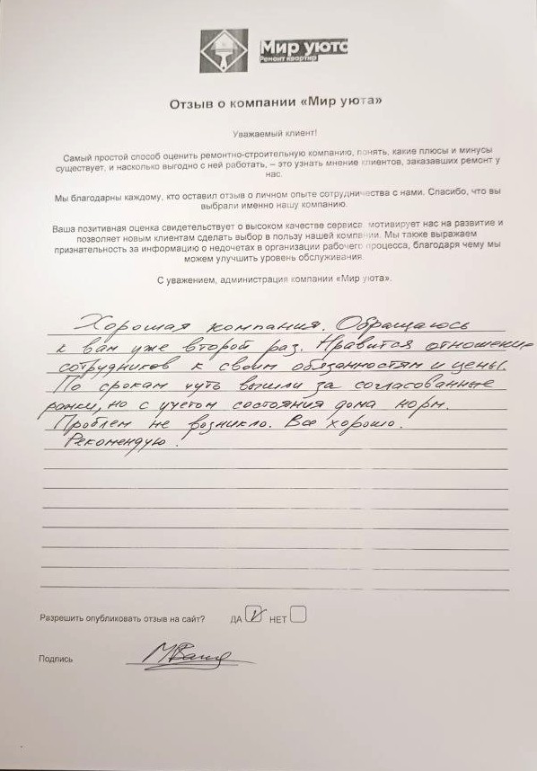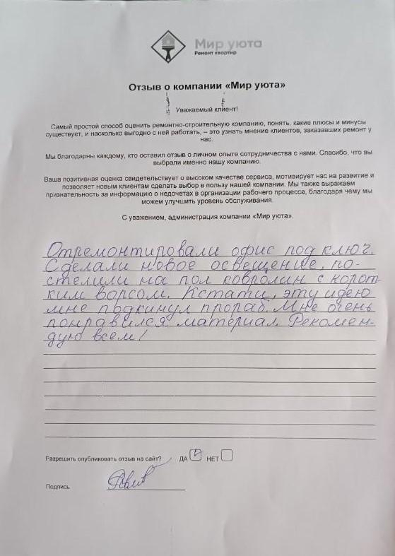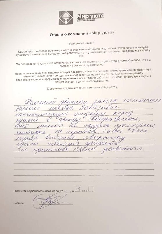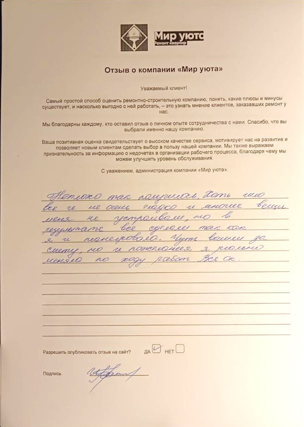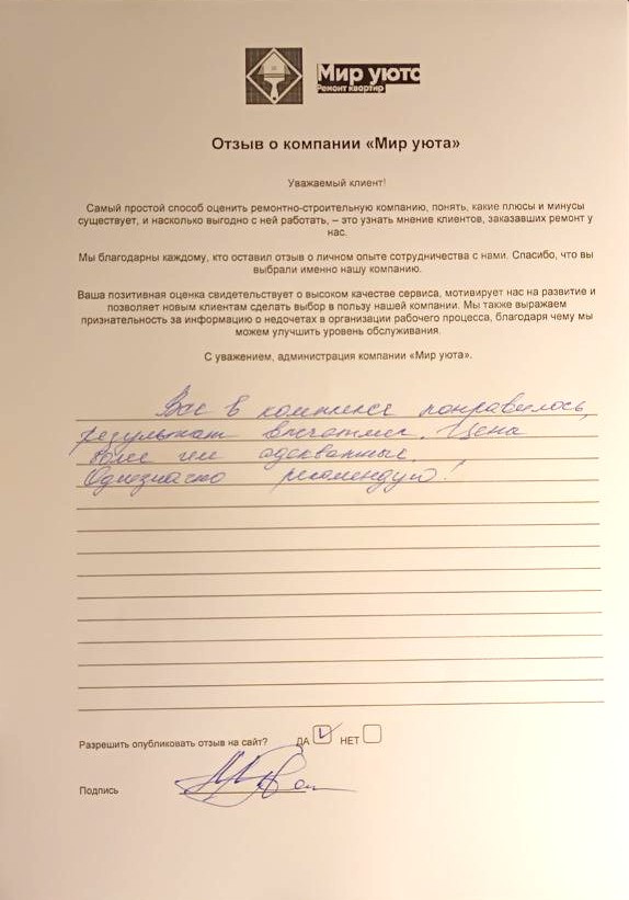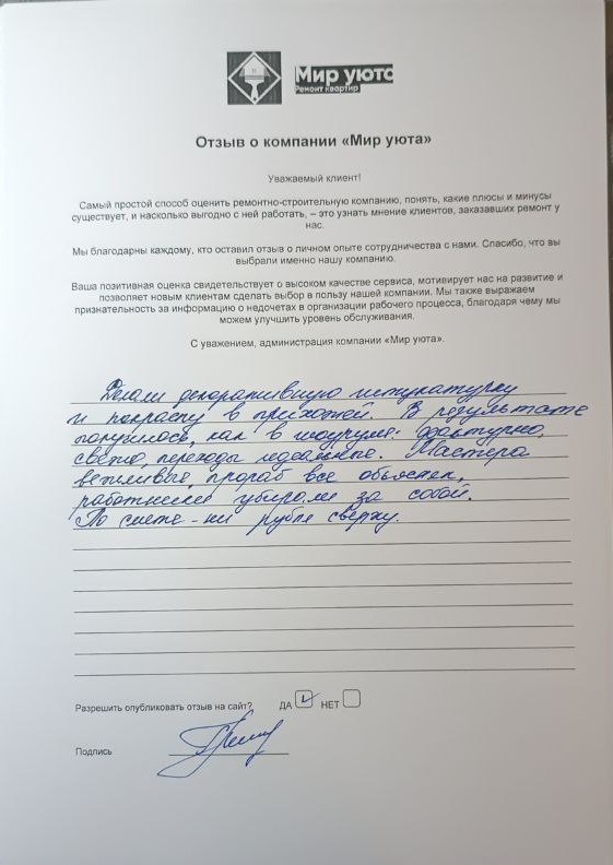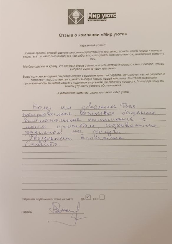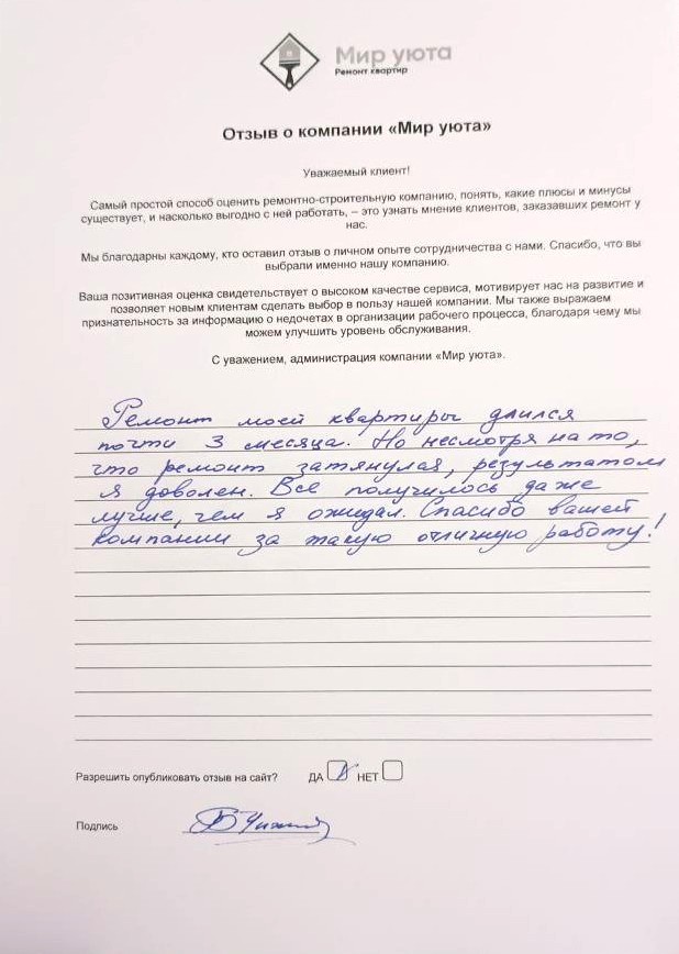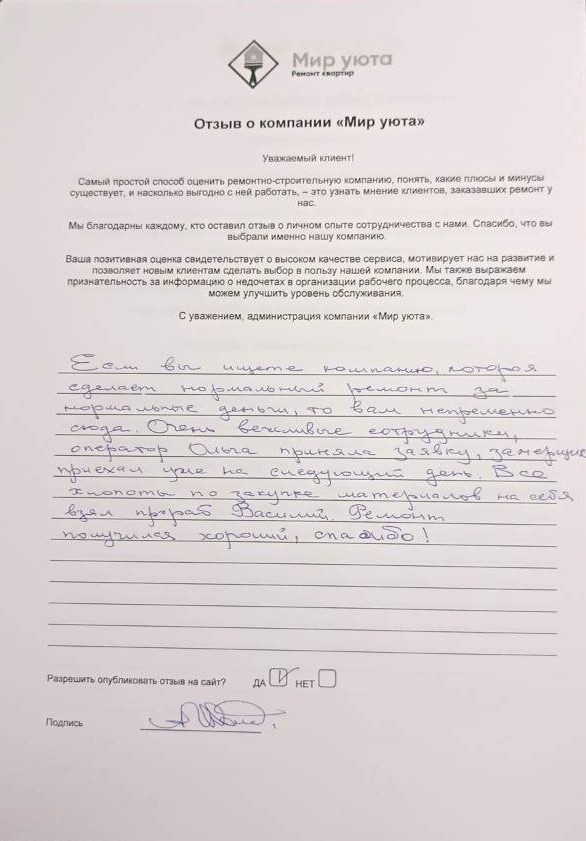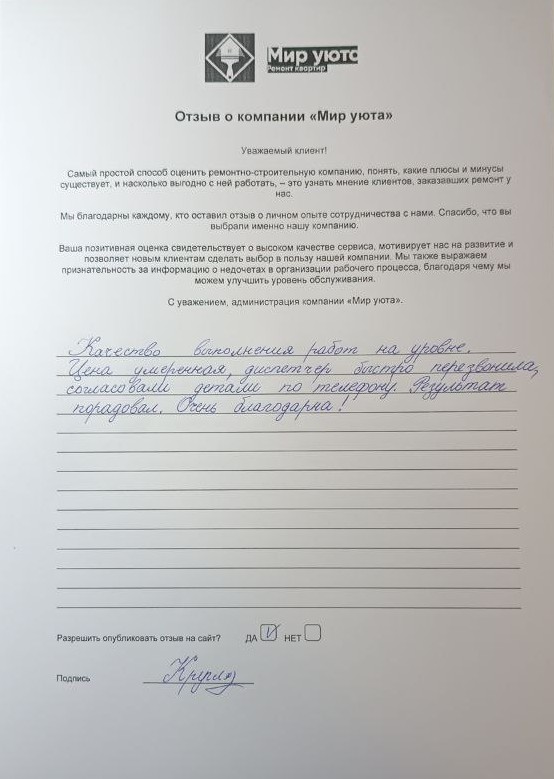 В данном разделе размещены отзывы наших клиентов, пожелавшим поделиться своими впечатлениями о качестве ремонта, профессионализме мастеров компании и уровне обслуживания. Мы еженедельно проводим опросы заказчиков, измеряя Индекс Удовлетворенности. Для нас важно мнение каждого, кто выбрал нашу ремонтно-строительную организацию в качестве исполнителя. Отзывы будут интересны и потенциальным заказчикам. Возможно, именно ваша оценка деятельности компании поможет потенциальным клиентам выбрать нас для выполнения будущего ремонта.