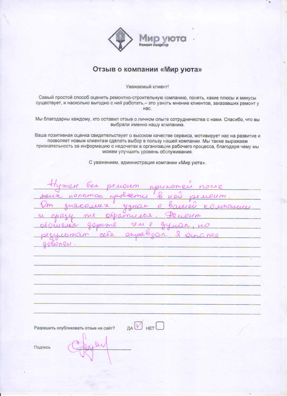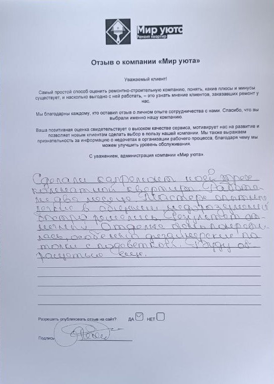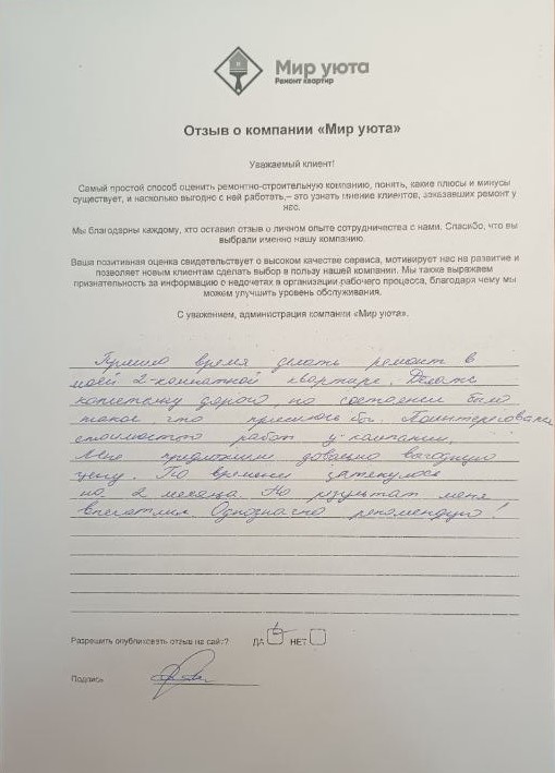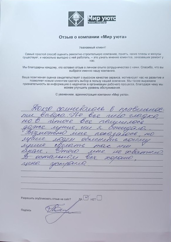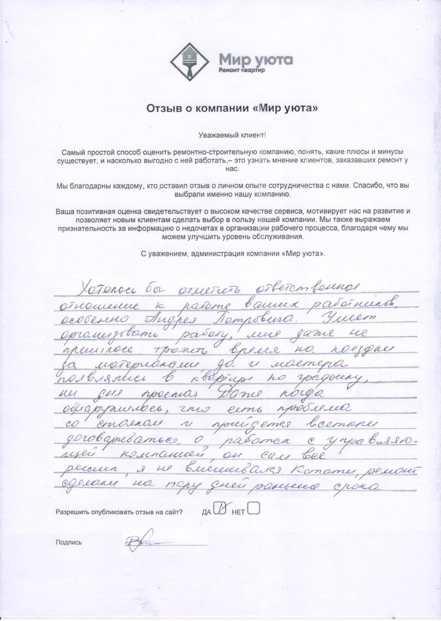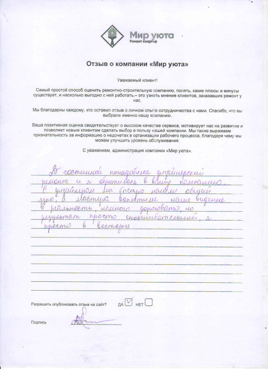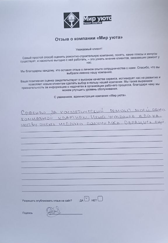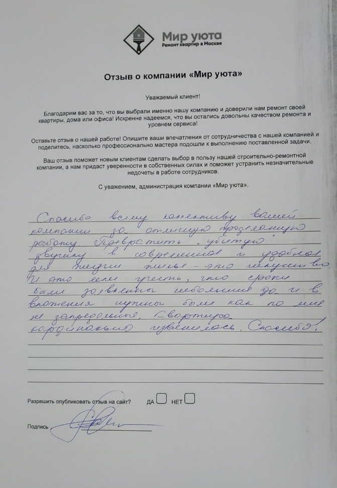 В данном разделе размещены отзывы наших клиентов, пожелавшим поделиться своими впечатлениями о качестве ремонта, профессионализме мастеров компании и уровне обслуживания. Мы еженедельно проводим опросы заказчиков, измеряя Индекс Удовлетворенности. Для нас важно мнение каждого, кто выбрал нашу ремонтно-строительную организацию в качестве исполнителя. Отзывы будут интересны и потенциальным заказчикам. Возможно, именно ваша оценка деятельности компании поможет потенциальным клиентам выбрать нас для выполнения будущего ремонта.