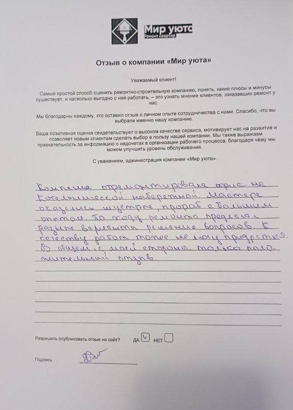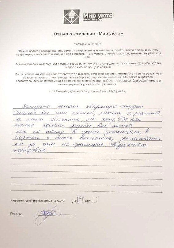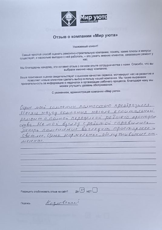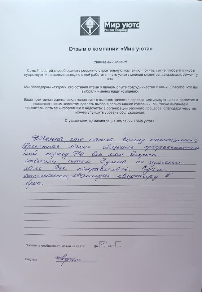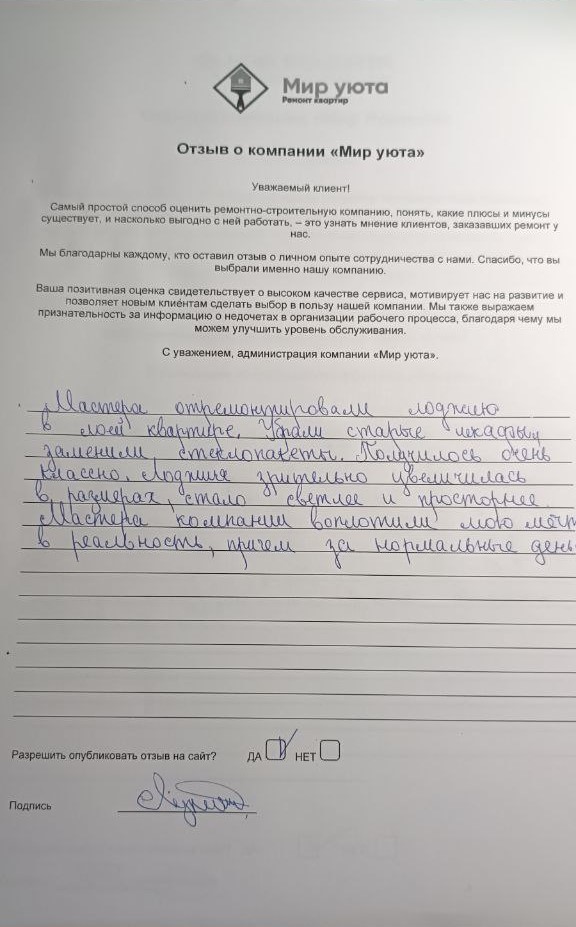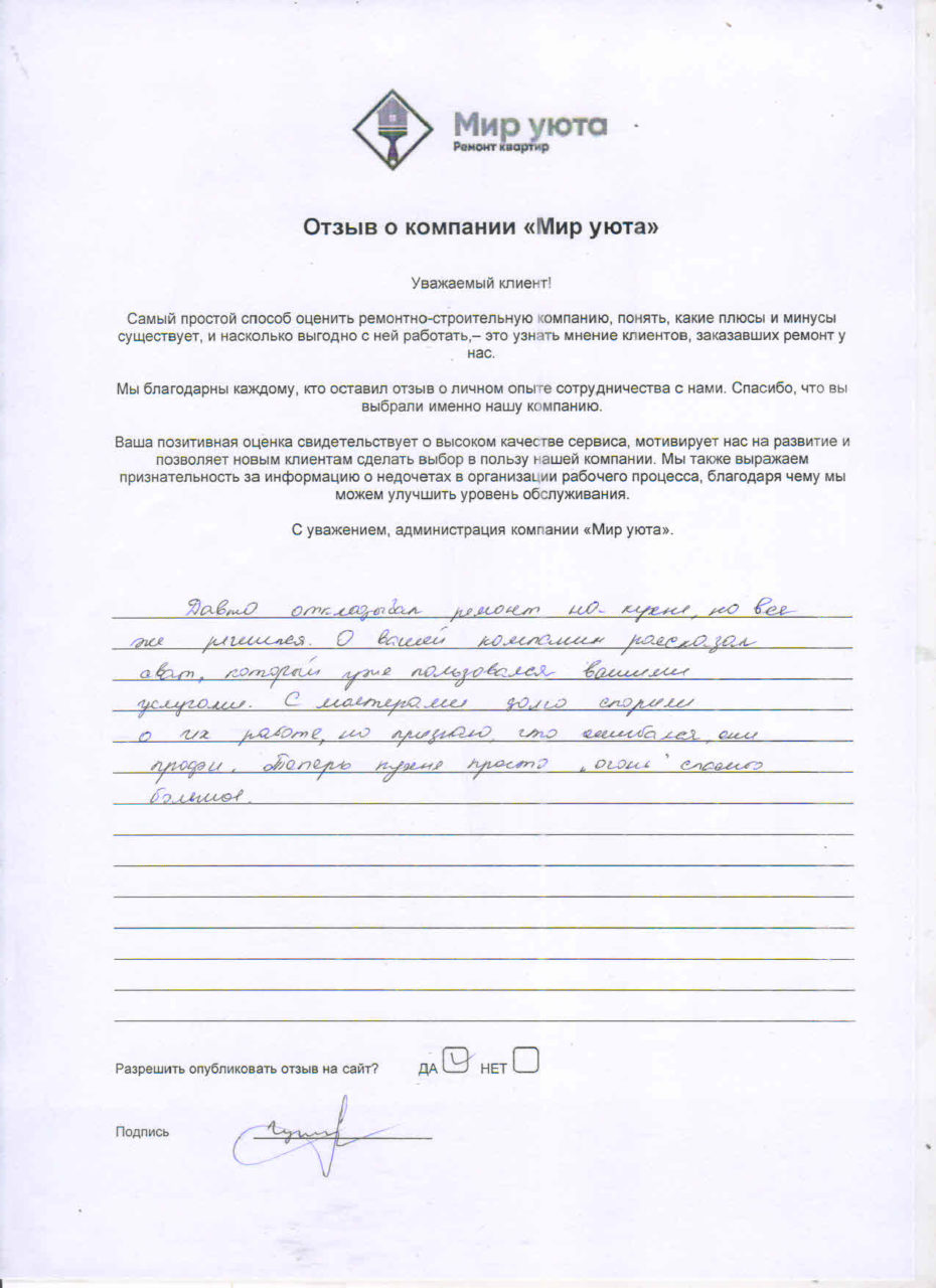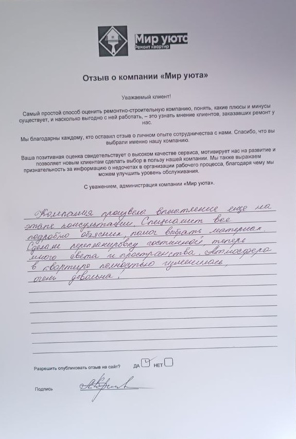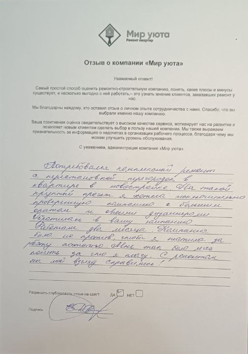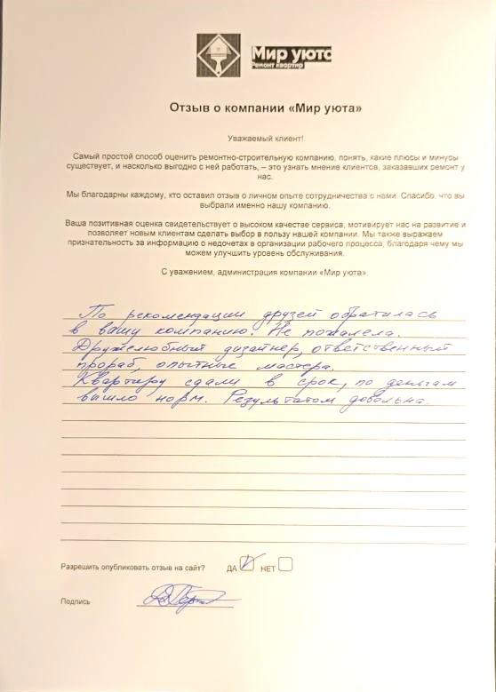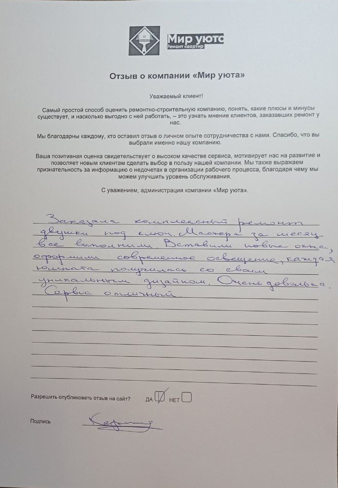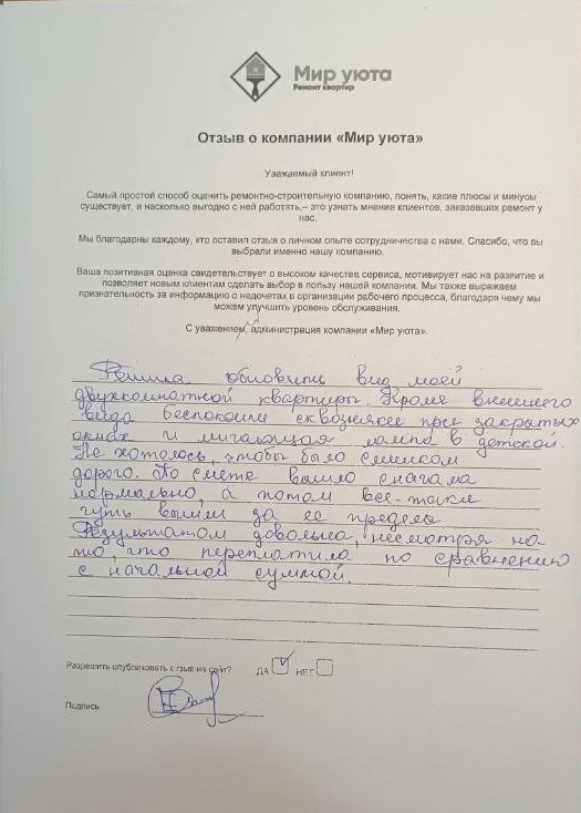 В данном разделе размещены отзывы наших клиентов, пожелавшим поделиться своими впечатлениями о качестве ремонта, профессионализме мастеров компании и уровне обслуживания. Мы еженедельно проводим опросы заказчиков, измеряя Индекс Удовлетворенности. Для нас важно мнение каждого, кто выбрал нашу ремонтно-строительную организацию в качестве исполнителя. Отзывы будут интересны и потенциальным заказчикам. Возможно, именно ваша оценка деятельности компании поможет потенциальным клиентам выбрать нас для выполнения будущего ремонта.