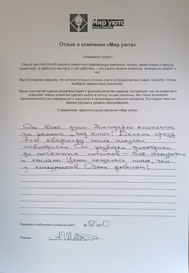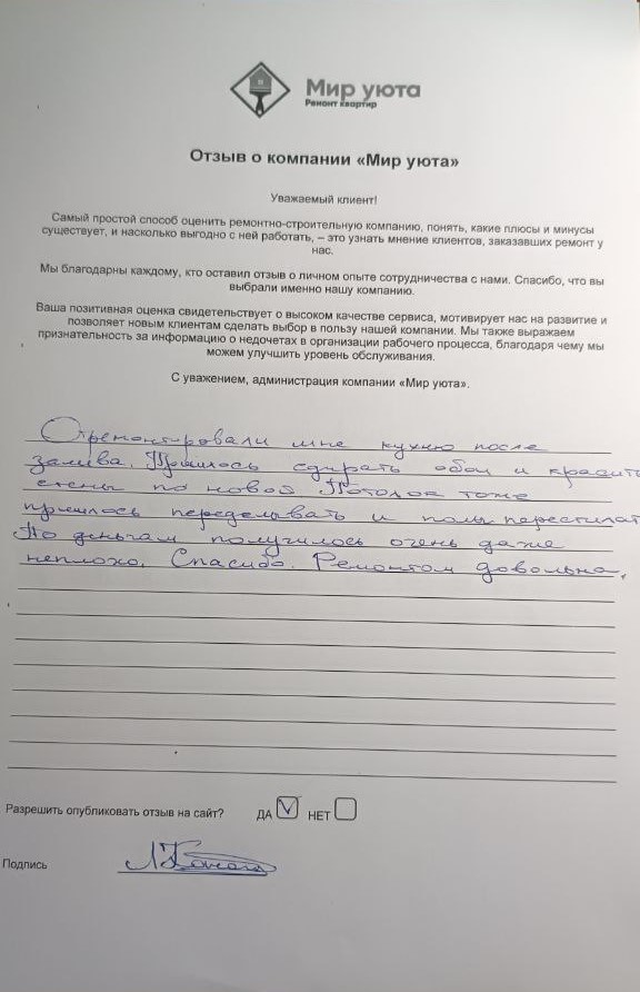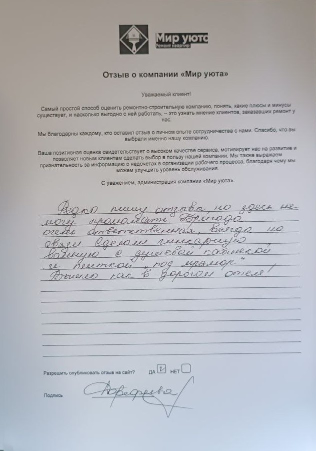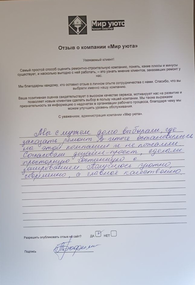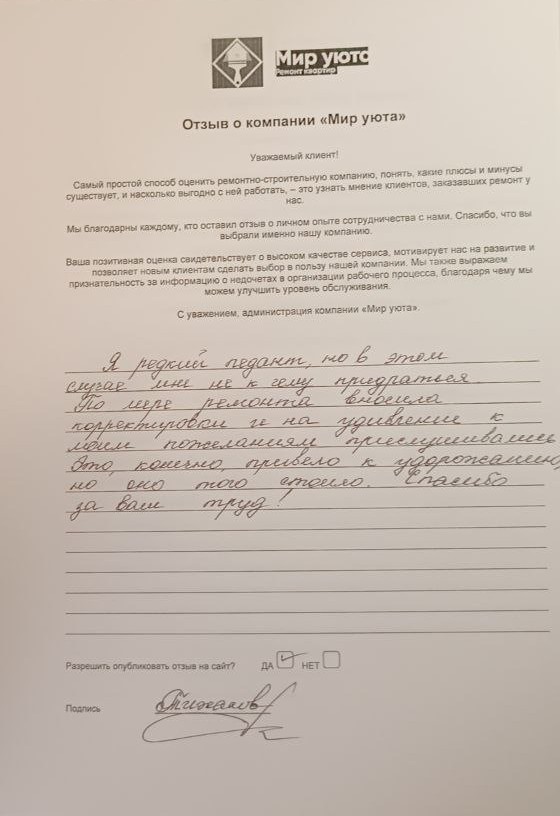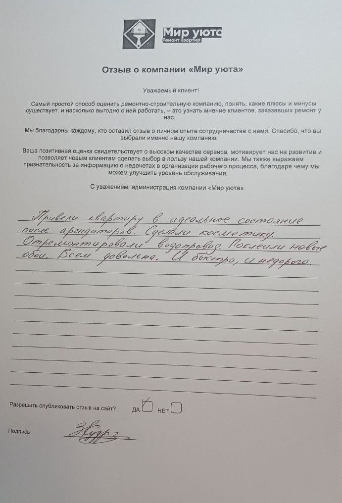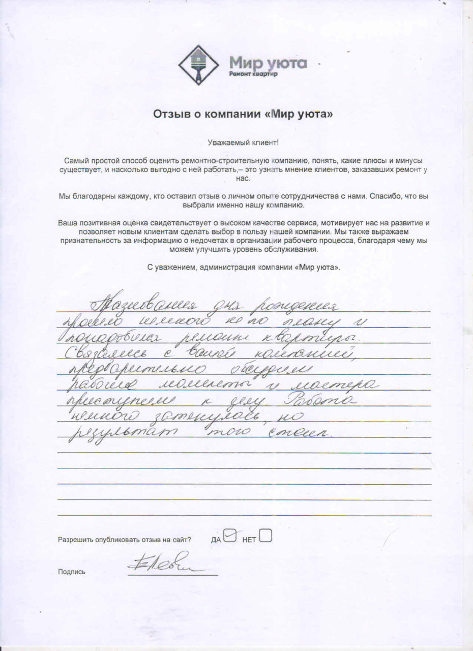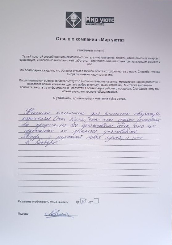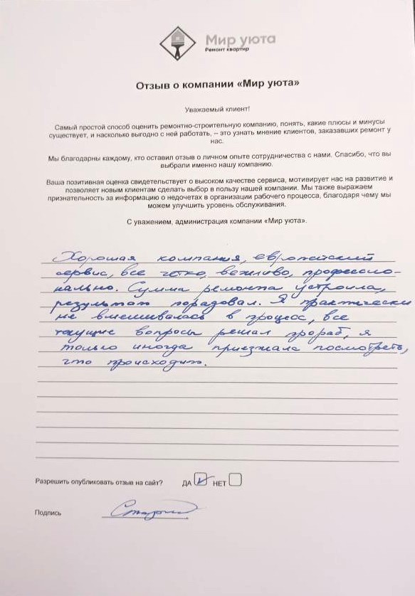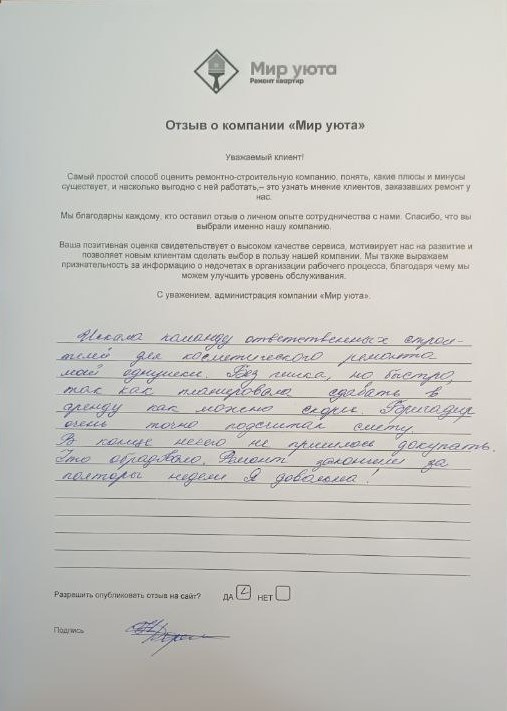 В данном разделе размещены отзывы наших клиентов, пожелавшим поделиться своими впечатлениями о качестве ремонта, профессионализме мастеров компании и уровне обслуживания. Мы еженедельно проводим опросы заказчиков, измеряя Индекс Удовлетворенности. Для нас важно мнение каждого, кто выбрал нашу ремонтно-строительную организацию в качестве исполнителя. Отзывы будут интересны и потенциальным заказчикам. Возможно, именно ваша оценка деятельности компании поможет потенциальным клиентам выбрать нас для выполнения будущего ремонта.