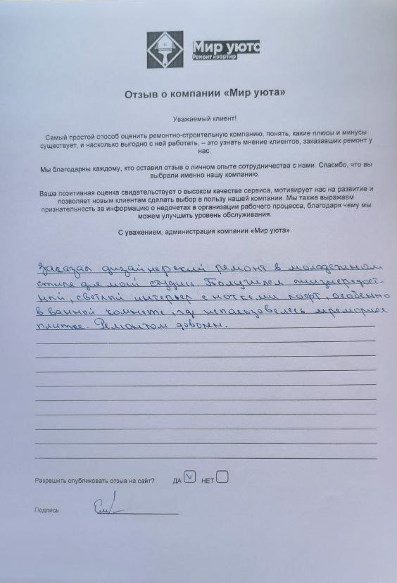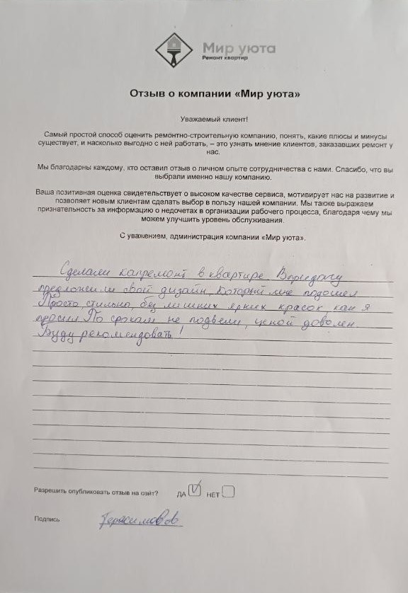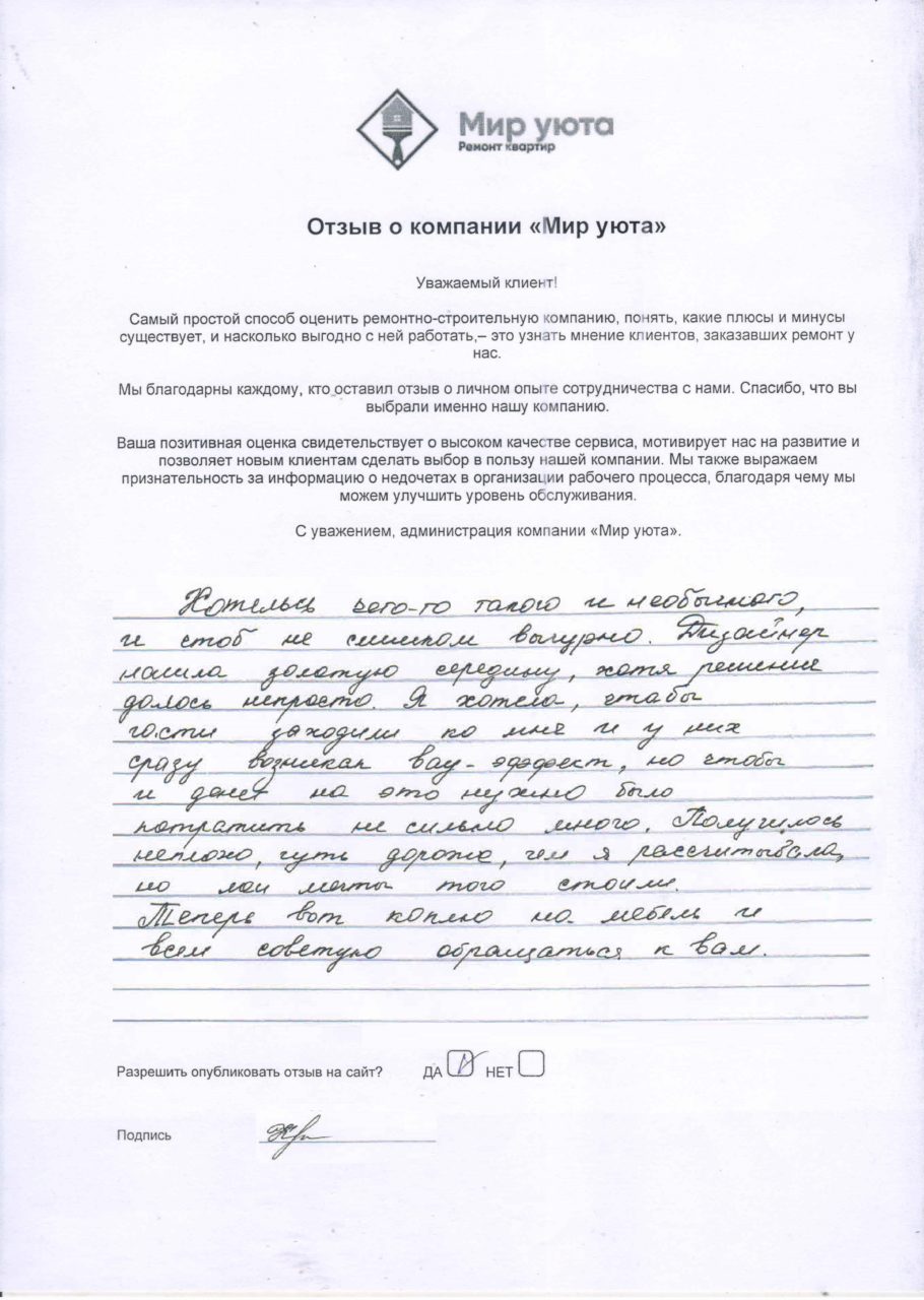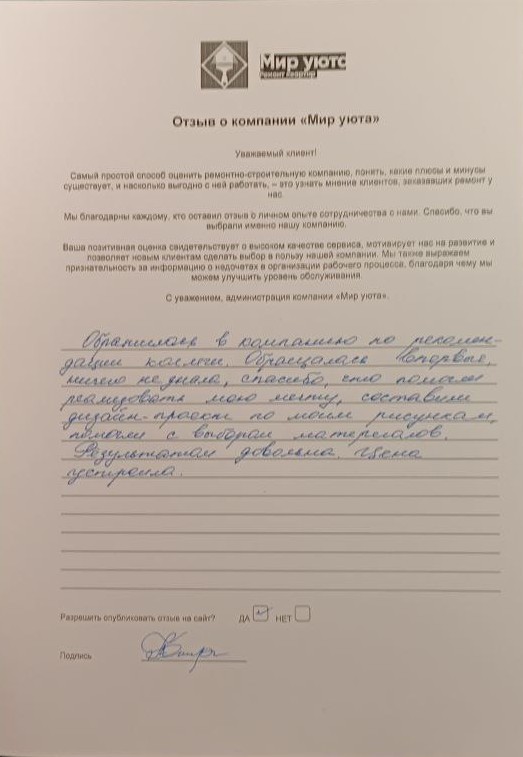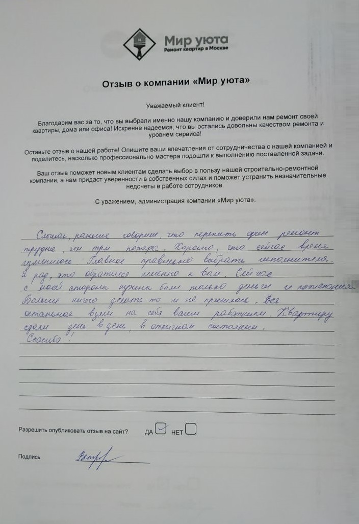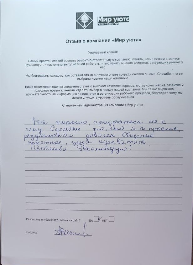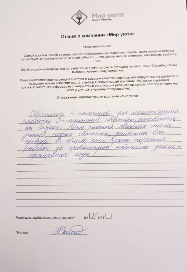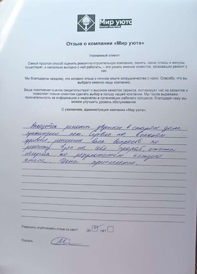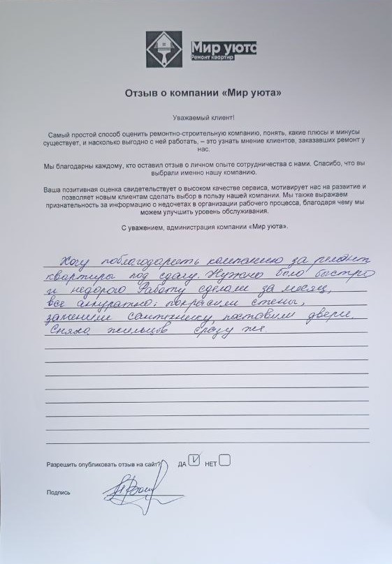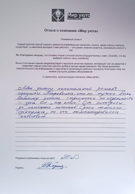В данном разделе размещены отзывы наших клиентов, пожелавшим поделиться своими впечатлениями о качестве ремонта, профессионализме мастеров компании и уровне обслуживания. Мы еженедельно проводим опросы заказчиков, измеряя Индекс Удовлетворенности. Для нас важно мнение каждого, кто выбрал нашу ремонтно-строительную организацию в качестве исполнителя. Отзывы будут интересны и потенциальным заказчикам. Возможно, именно ваша оценка деятельности компании поможет потенциальным клиентам выбрать нас для выполнения будущего ремонта.