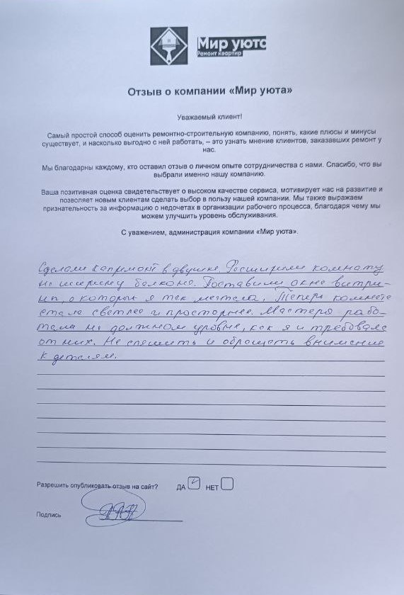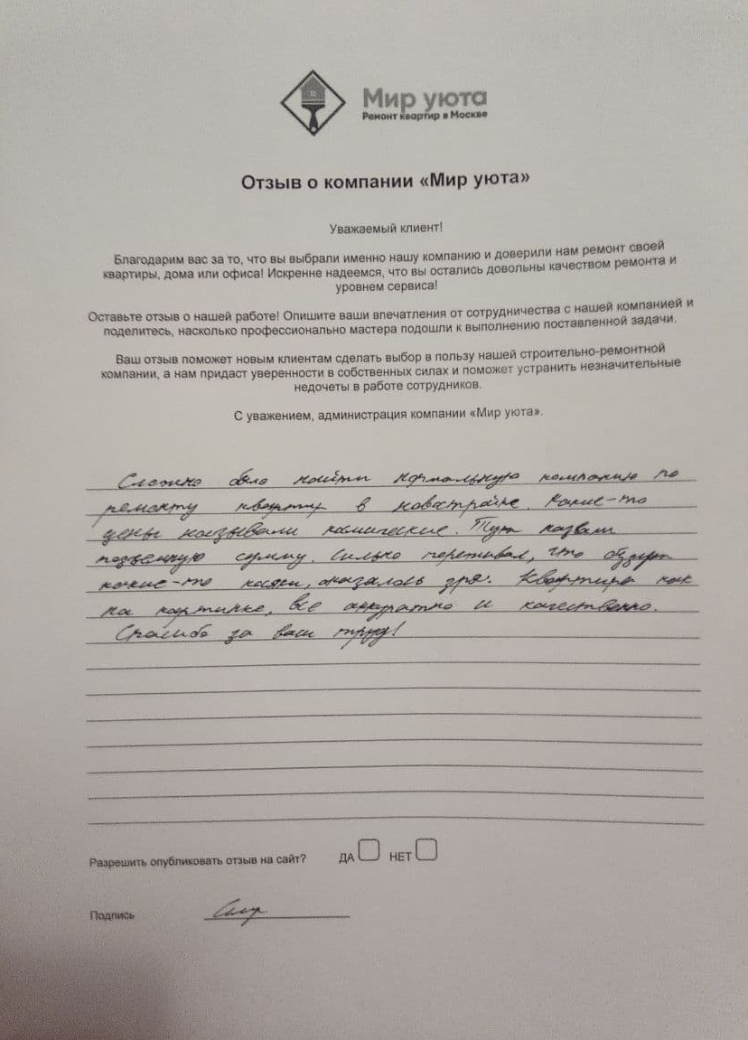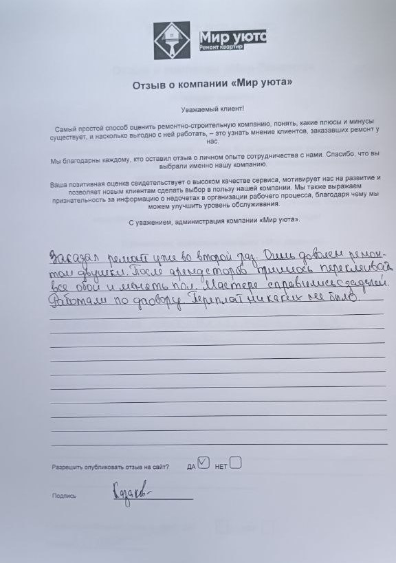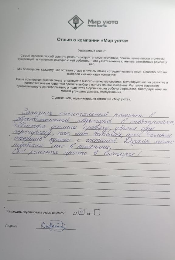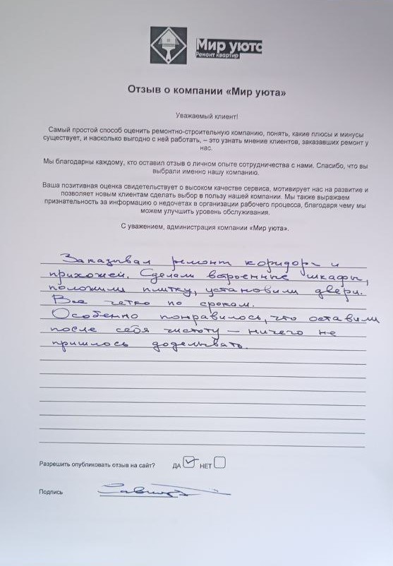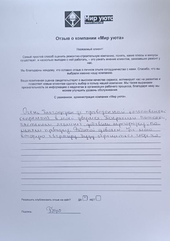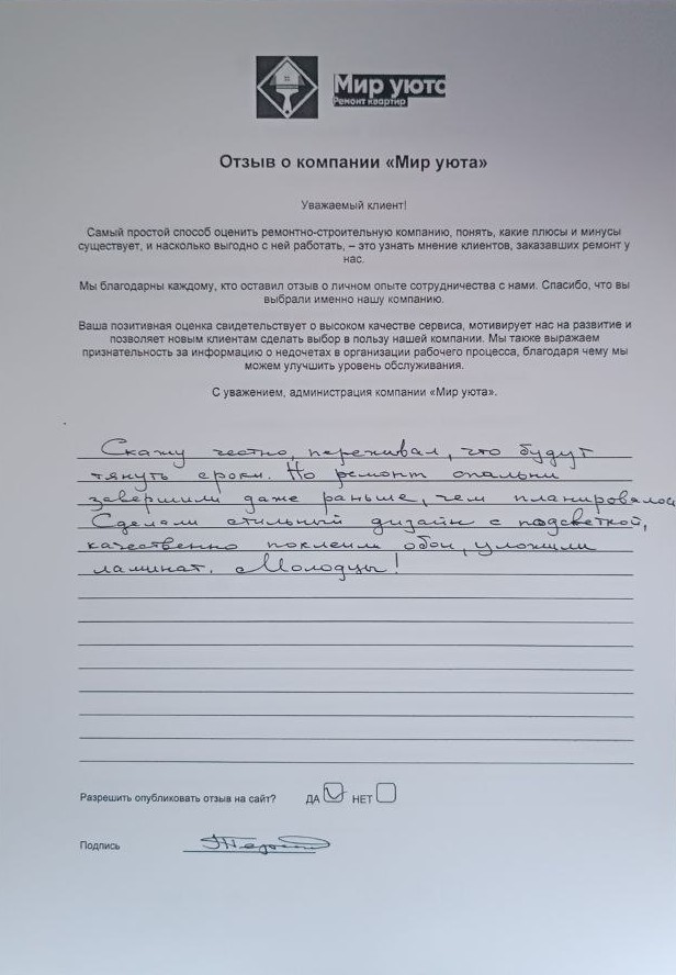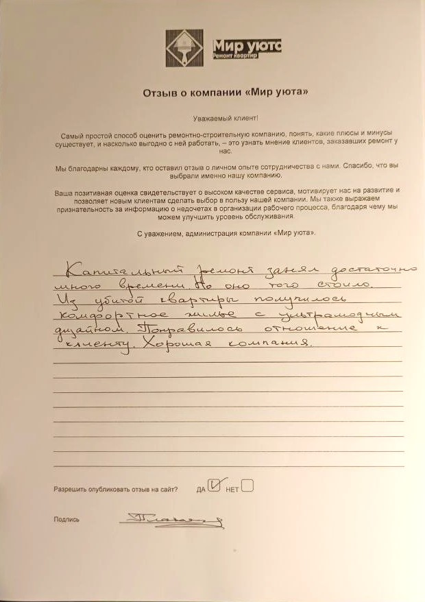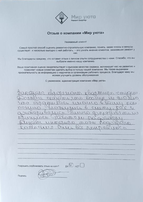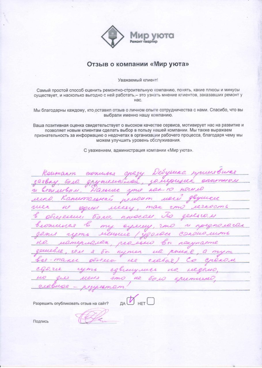 В данном разделе размещены отзывы наших клиентов, пожелавшим поделиться своими впечатлениями о качестве ремонта, профессионализме мастеров компании и уровне обслуживания. Мы еженедельно проводим опросы заказчиков, измеряя Индекс Удовлетворенности. Для нас важно мнение каждого, кто выбрал нашу ремонтно-строительную организацию в качестве исполнителя. Отзывы будут интересны и потенциальным заказчикам. Возможно, именно ваша оценка деятельности компании поможет потенциальным клиентам выбрать нас для выполнения будущего ремонта.