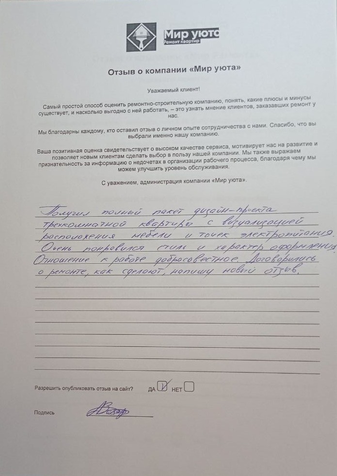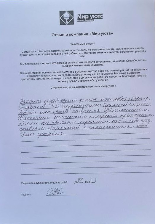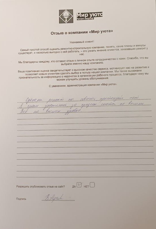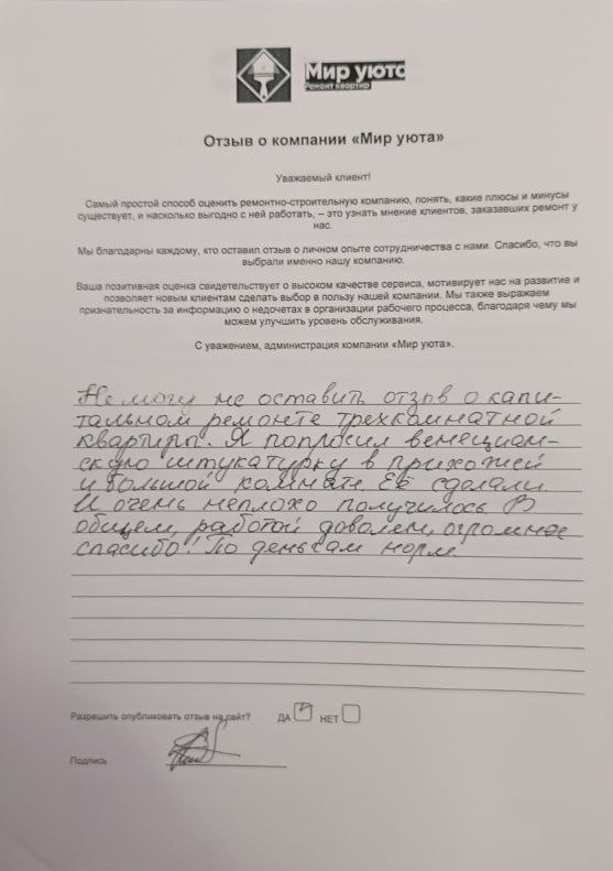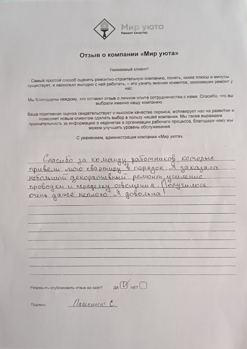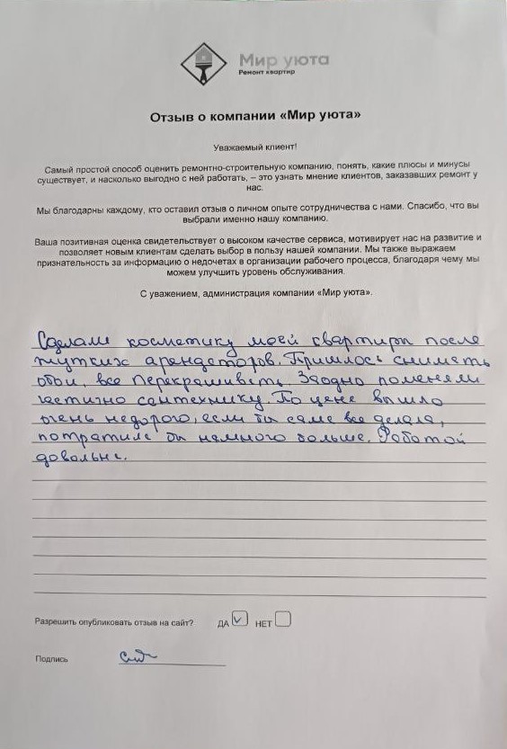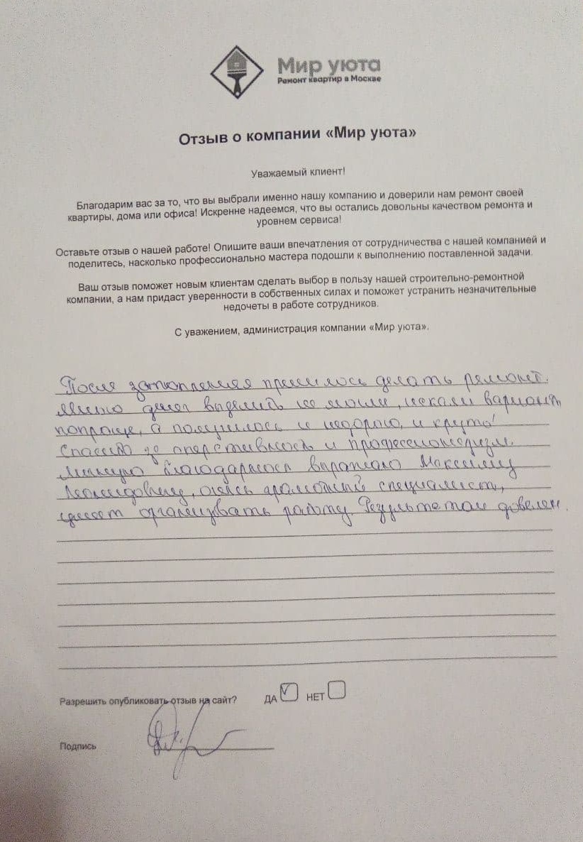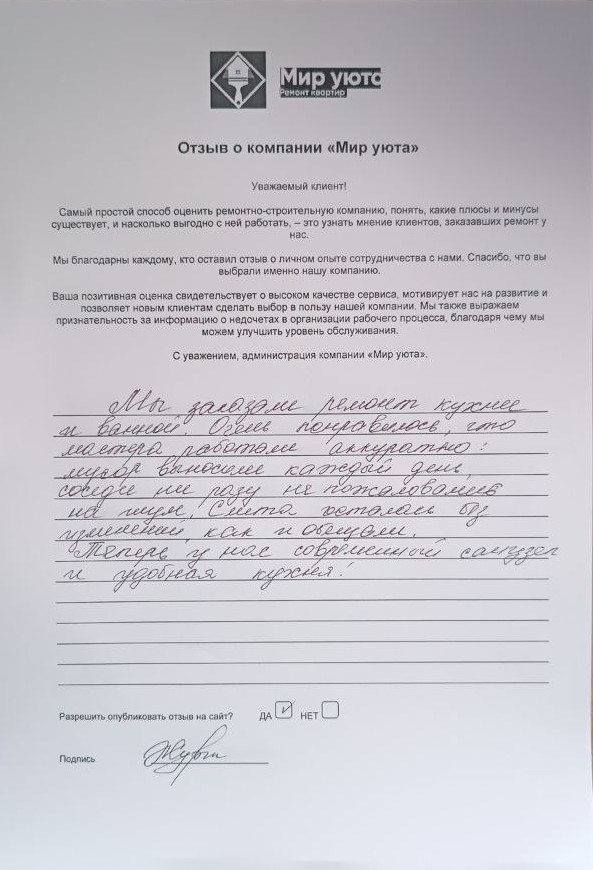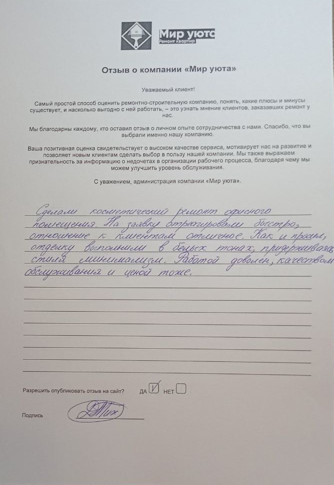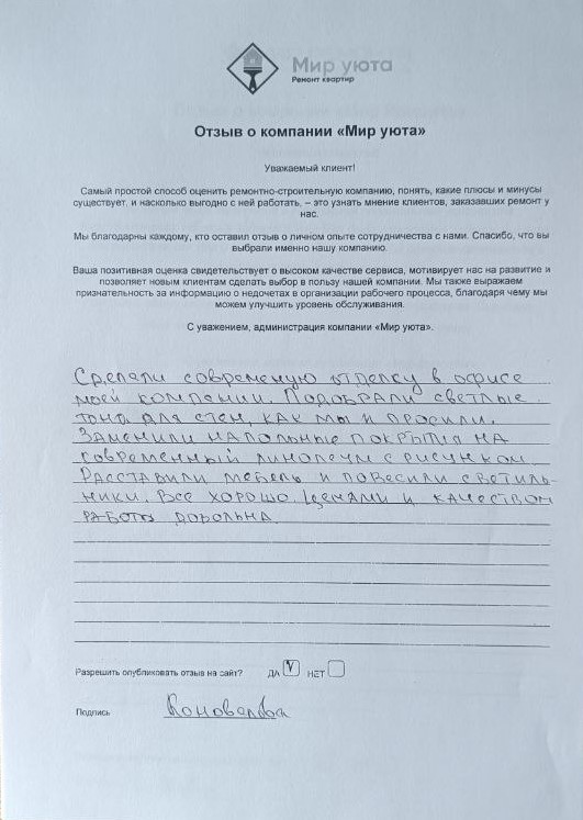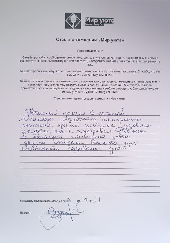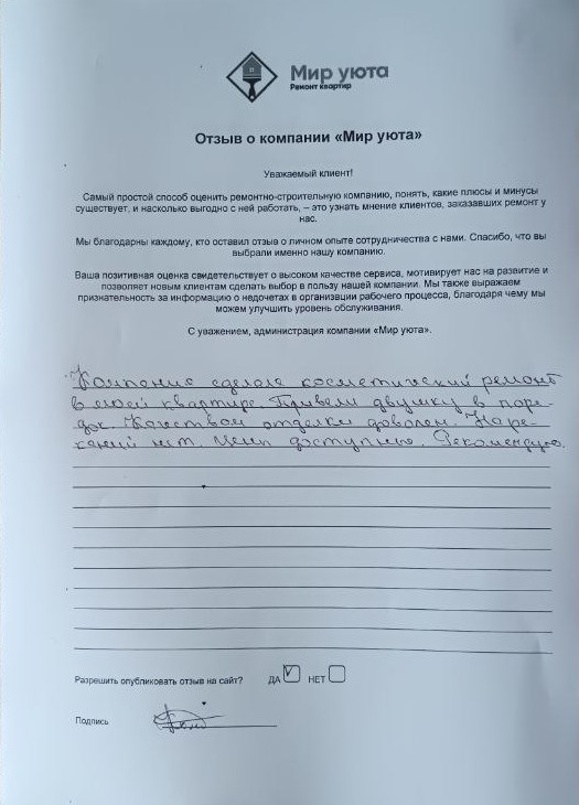 В данном разделе размещены отзывы наших клиентов, пожелавшим поделиться своими впечатлениями о качестве ремонта, профессионализме мастеров компании и уровне обслуживания. Мы еженедельно проводим опросы заказчиков, измеряя Индекс Удовлетворенности. Для нас важно мнение каждого, кто выбрал нашу ремонтно-строительную организацию в качестве исполнителя. Отзывы будут интересны и потенциальным заказчикам. Возможно, именно ваша оценка деятельности компании поможет потенциальным клиентам выбрать нас для выполнения будущего ремонта.