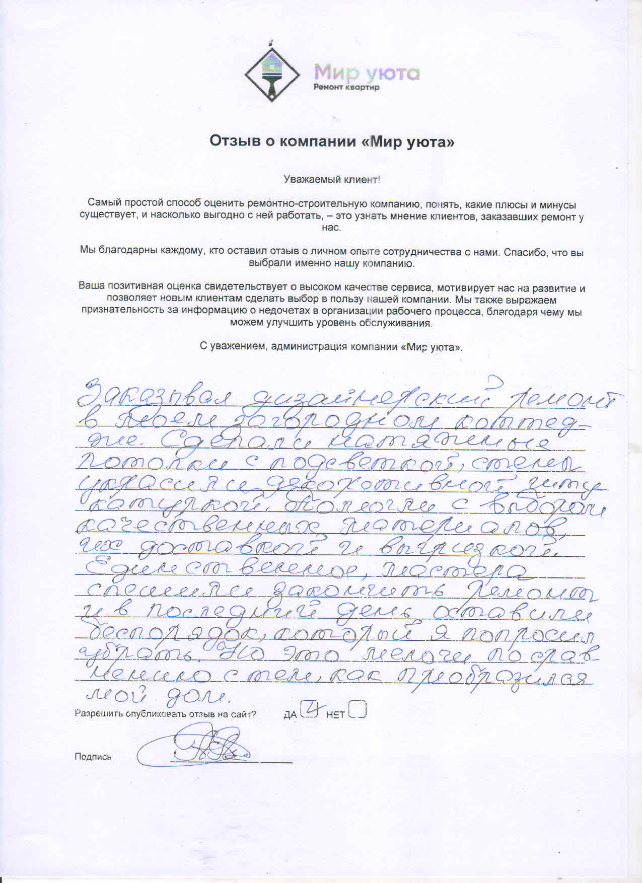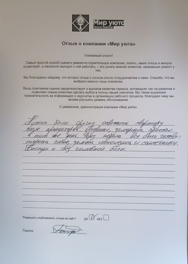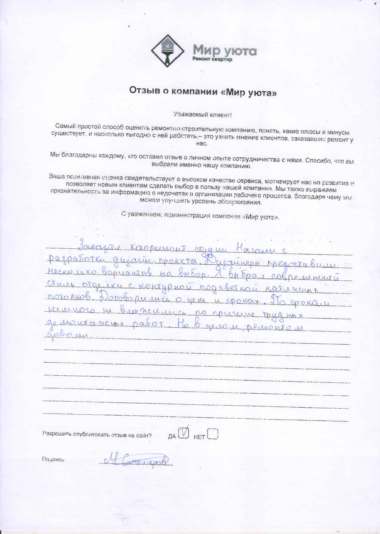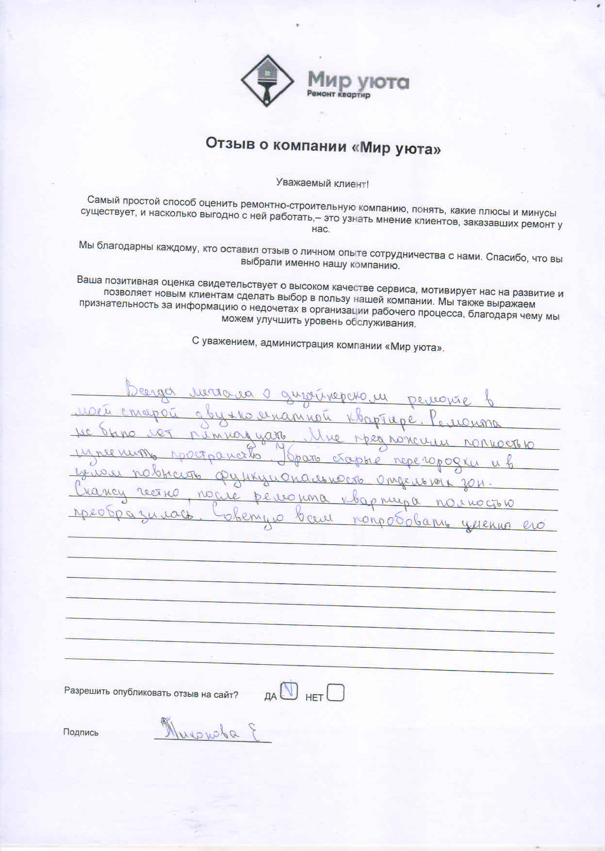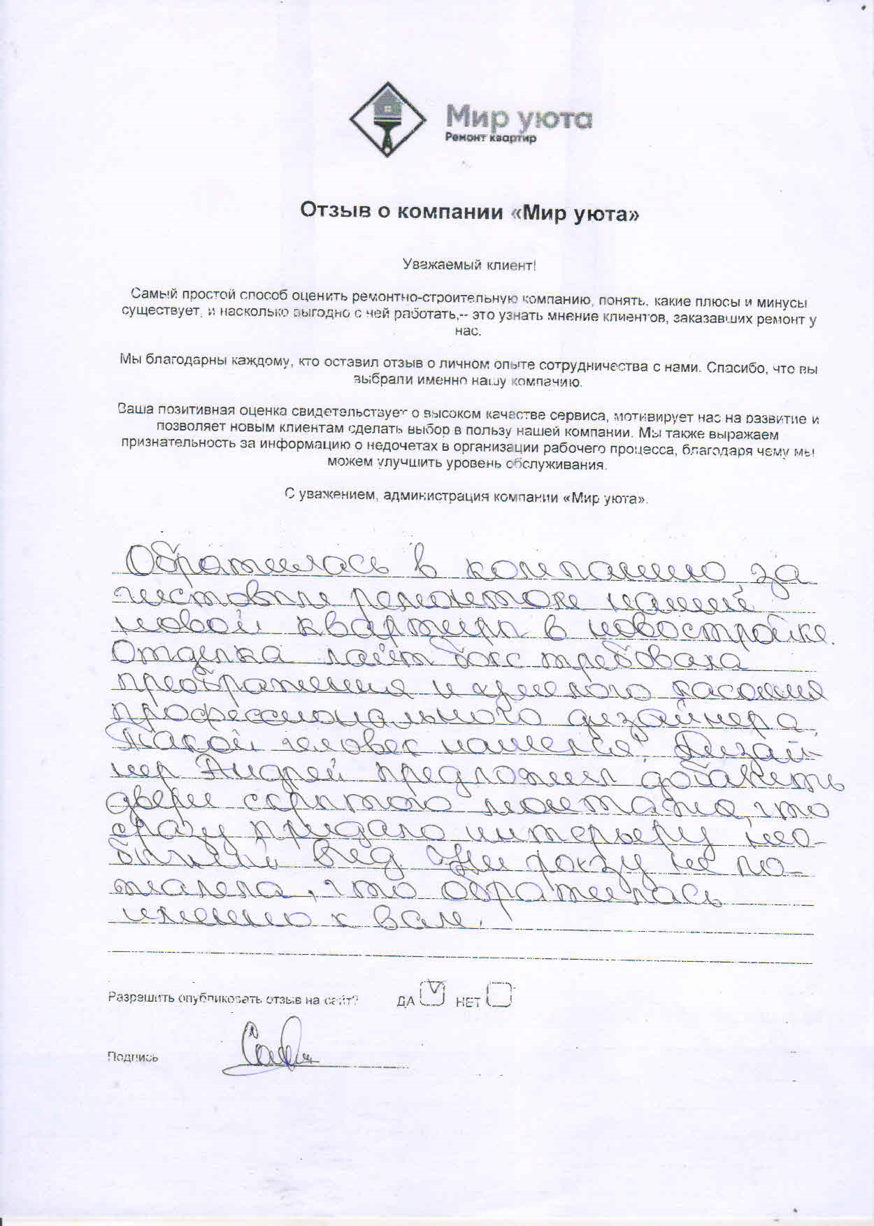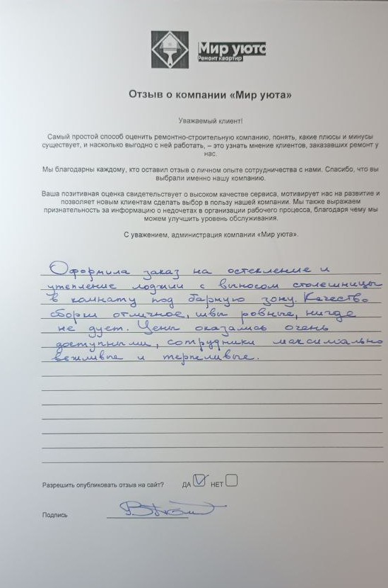 В данном разделе размещены отзывы наших клиентов, пожелавшим поделиться своими впечатлениями о качестве ремонта, профессионализме мастеров компании и уровне обслуживания. Мы еженедельно проводим опросы заказчиков, измеряя Индекс Удовлетворенности. Для нас важно мнение каждого, кто выбрал нашу ремонтно-строительную организацию в качестве исполнителя. Отзывы будут интересны и потенциальным заказчикам. Возможно, именно ваша оценка деятельности компании поможет потенциальным клиентам выбрать нас для выполнения будущего ремонта.