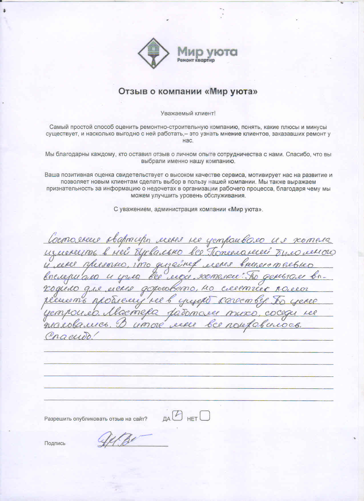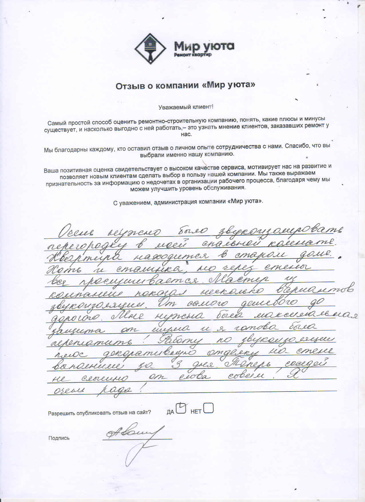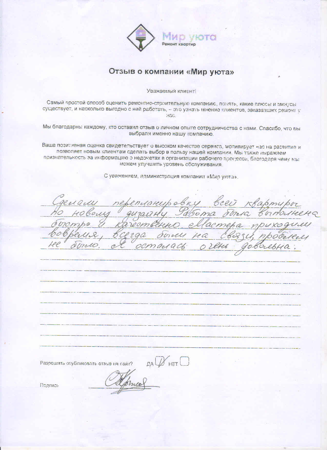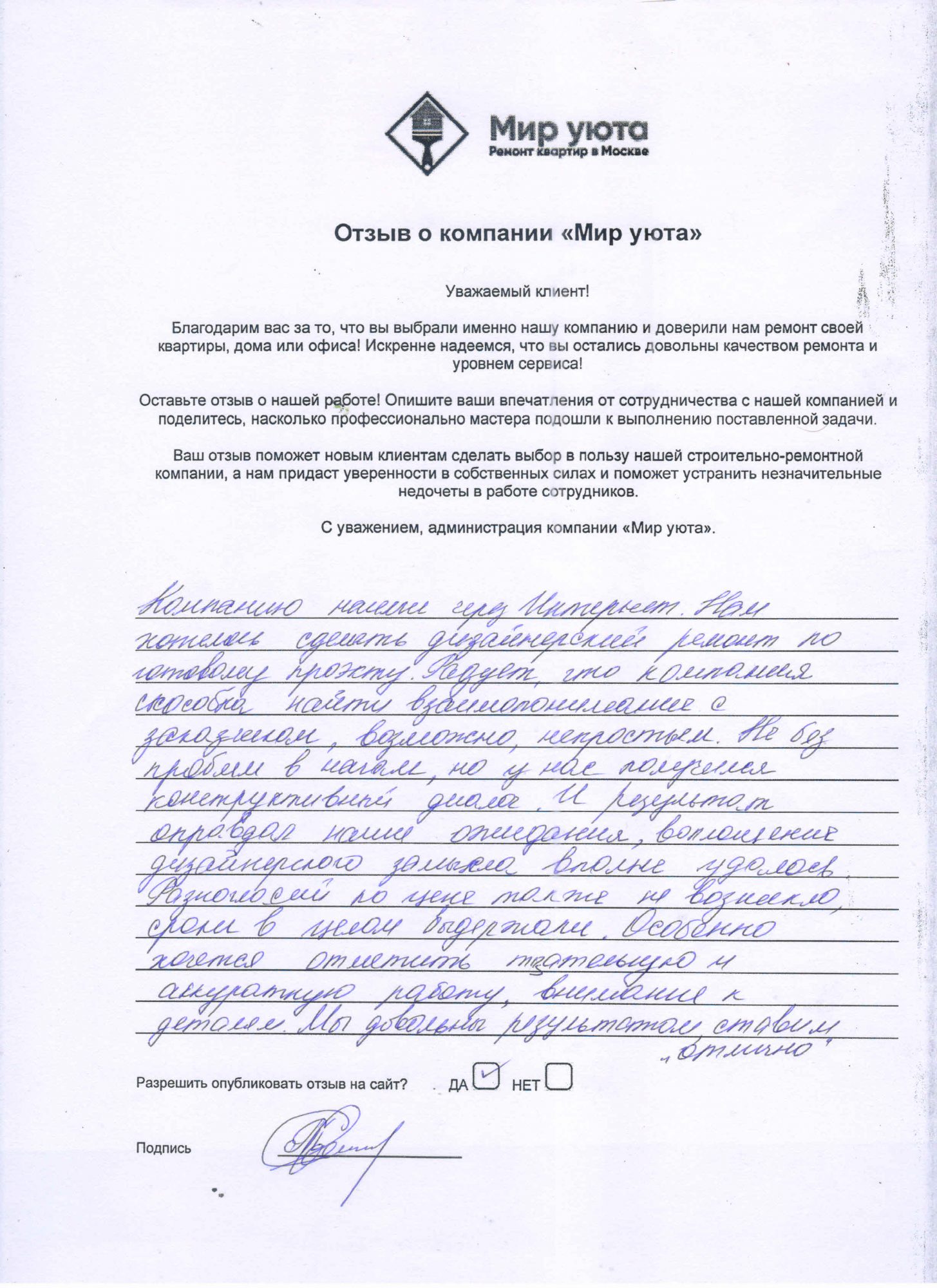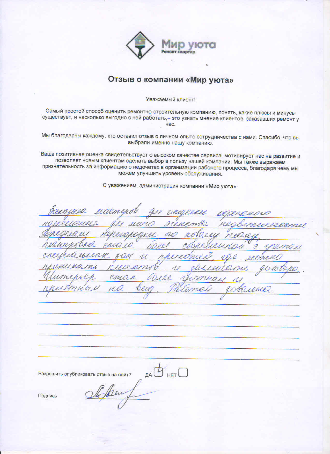 В данном разделе размещены отзывы наших клиентов, пожелавшим поделиться своими впечатлениями о качестве ремонта, профессионализме мастеров компании и уровне обслуживания. Мы еженедельно проводим опросы заказчиков, измеряя Индекс Удовлетворенности. Для нас важно мнение каждого, кто выбрал нашу ремонтно-строительную организацию в качестве исполнителя. Отзывы будут интересны и потенциальным заказчикам. Возможно, именно ваша оценка деятельности компании поможет потенциальным клиентам выбрать нас для выполнения будущего ремонта.