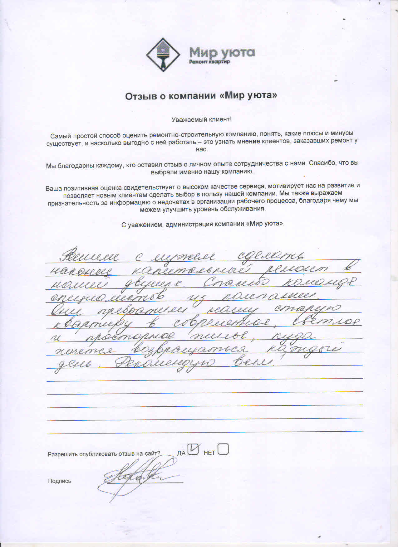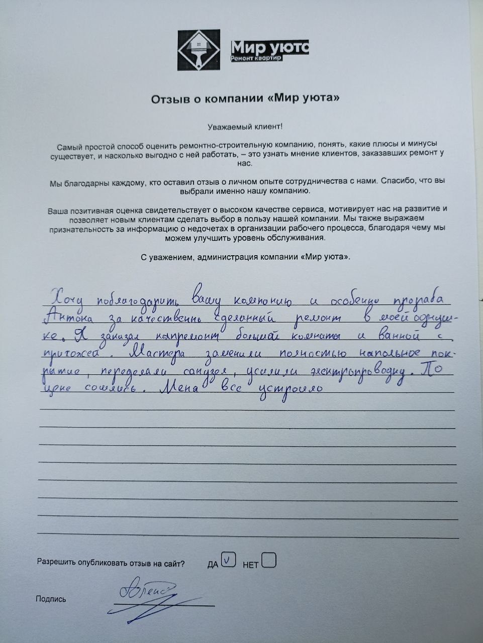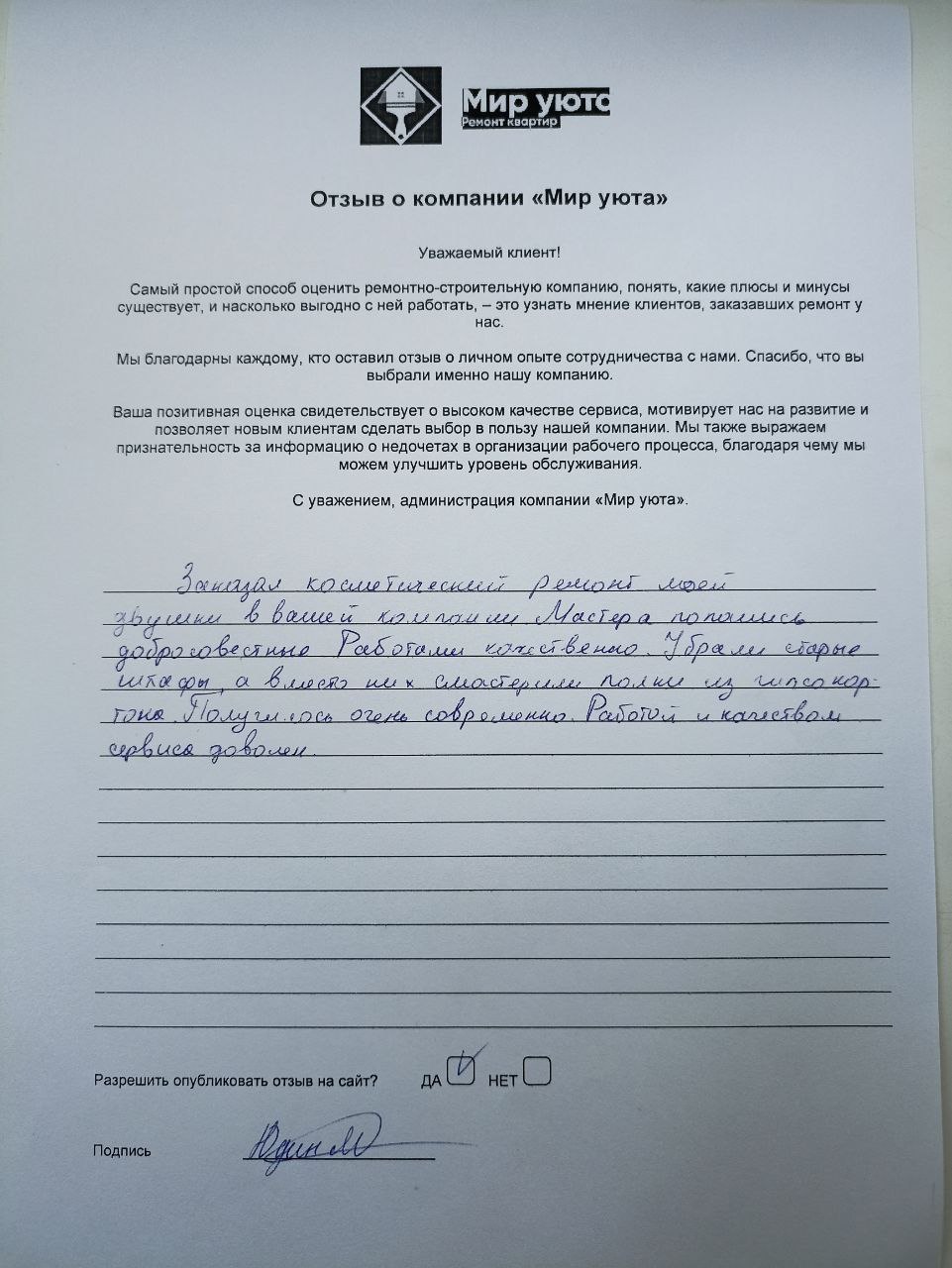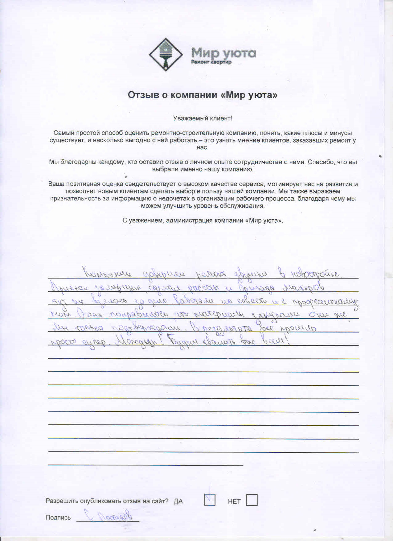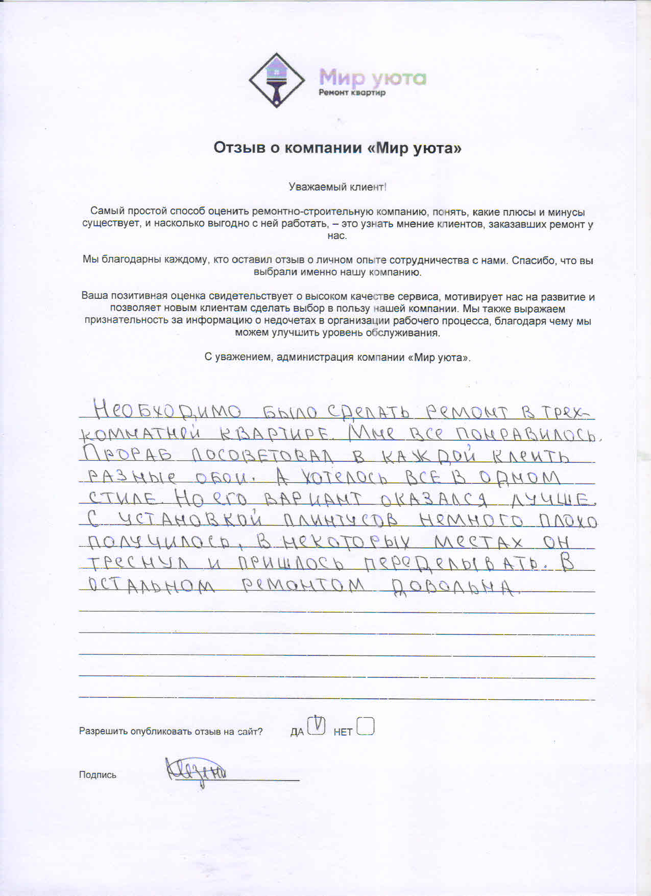 В данном разделе размещены отзывы наших клиентов, пожелавшим поделиться своими впечатлениями о качестве ремонта, профессионализме мастеров компании и уровне обслуживания. Мы еженедельно проводим опросы заказчиков, измеряя Индекс Удовлетворенности. Для нас важно мнение каждого, кто выбрал нашу ремонтно-строительную организацию в качестве исполнителя. Отзывы будут интересны и потенциальным заказчикам. Возможно, именно ваша оценка деятельности компании поможет потенциальным клиентам выбрать нас для выполнения будущего ремонта.