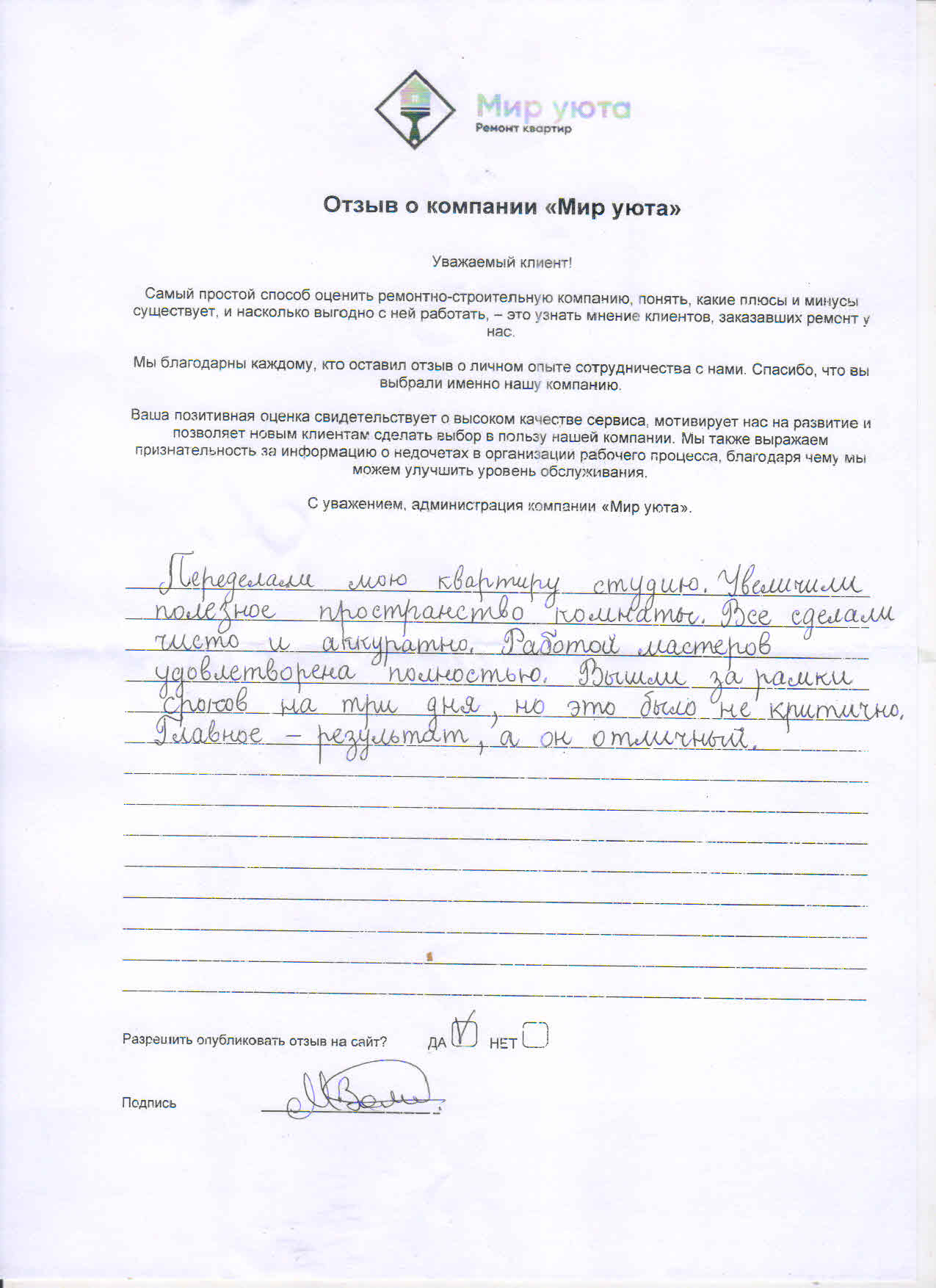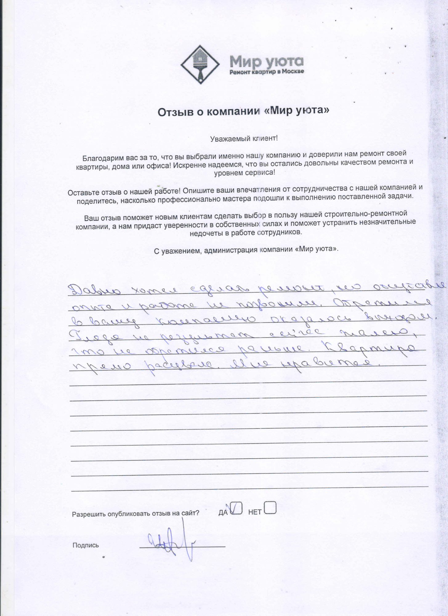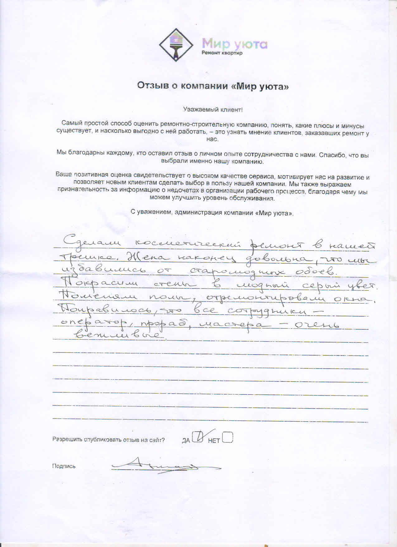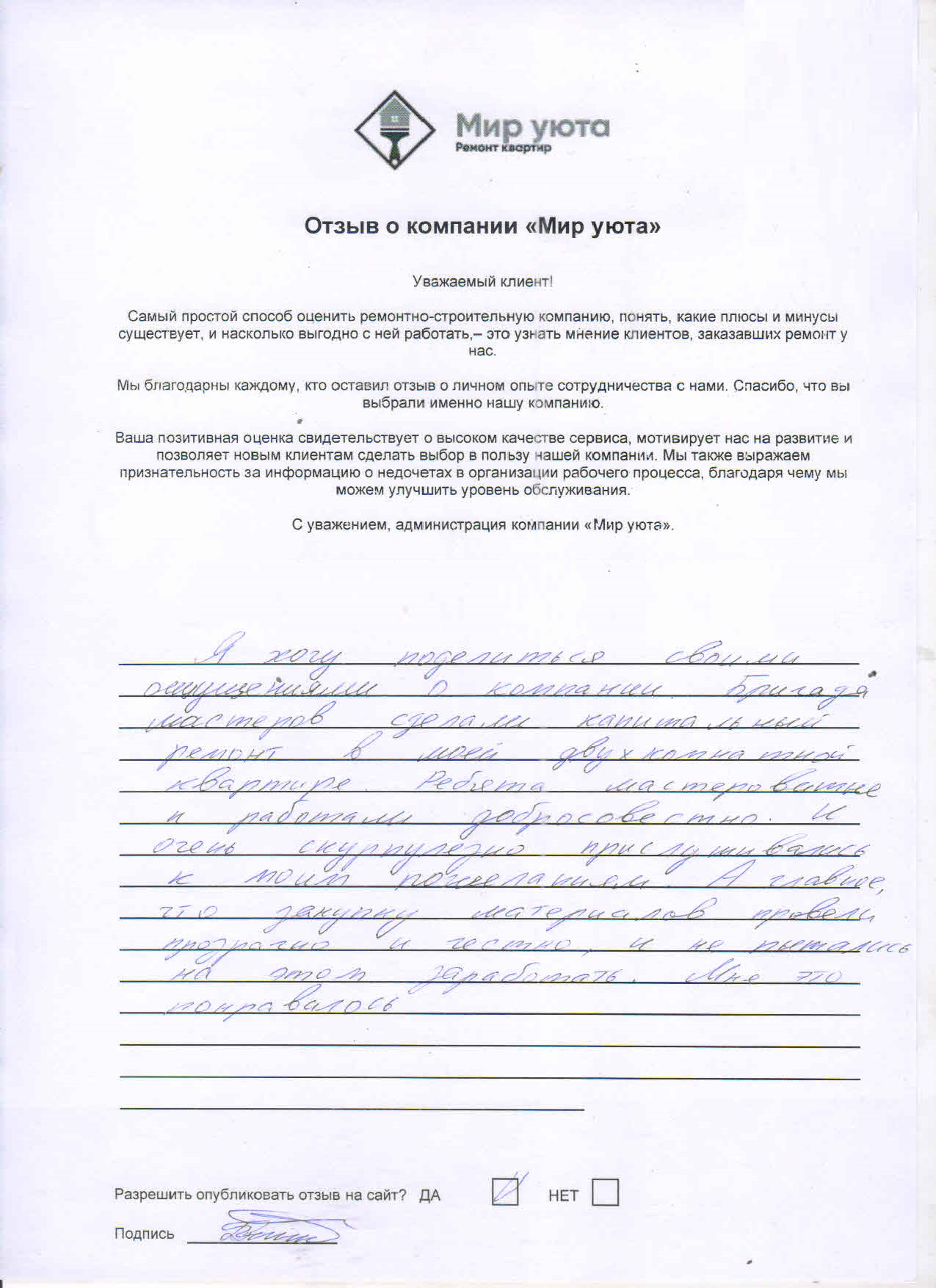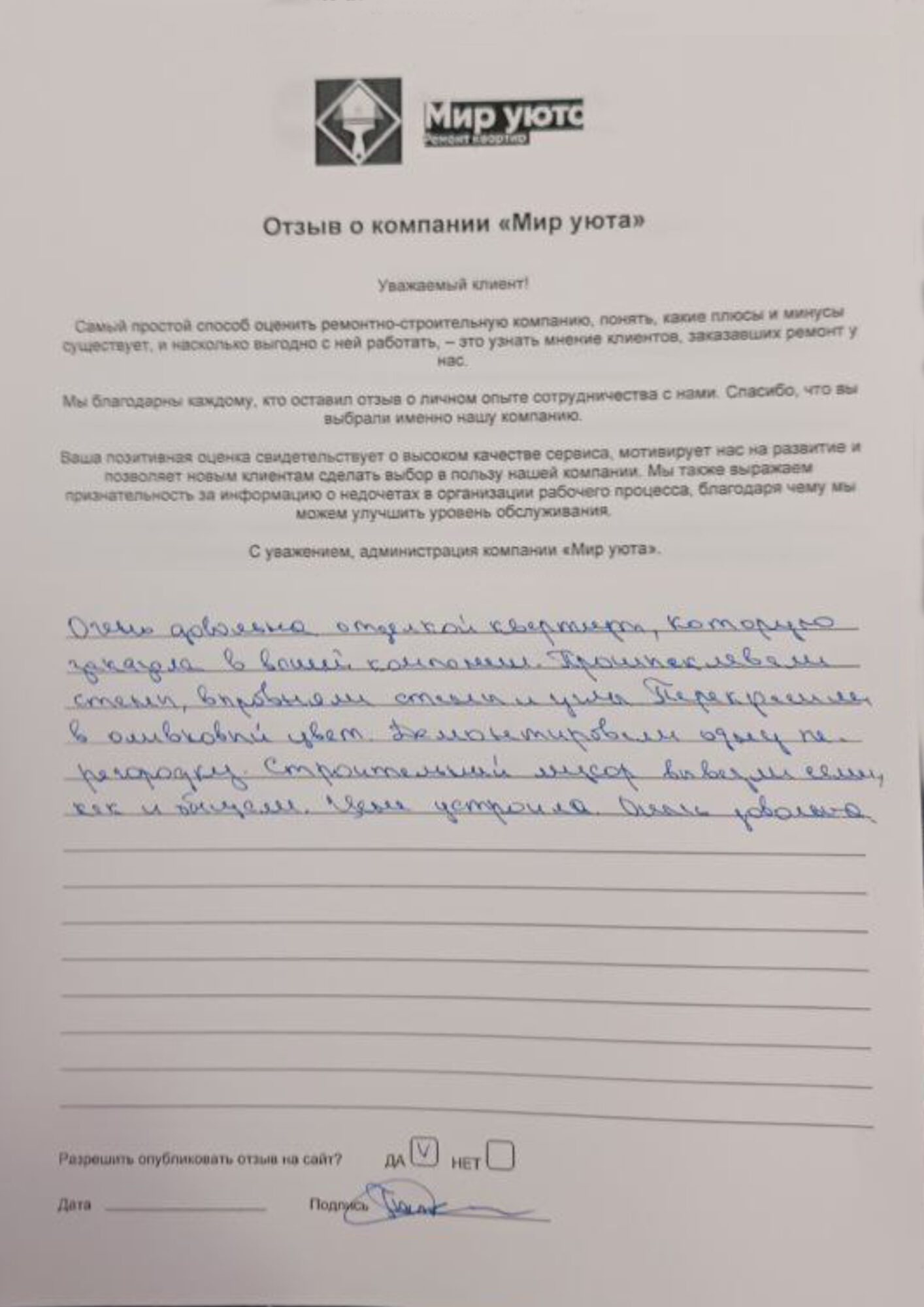 В данном разделе размещены отзывы наших клиентов, пожелавшим поделиться своими впечатлениями о качестве ремонта, профессионализме мастеров компании и уровне обслуживания. Мы еженедельно проводим опросы заказчиков, измеряя Индекс Удовлетворенности. Для нас важно мнение каждого, кто выбрал нашу ремонтно-строительную организацию в качестве исполнителя. Отзывы будут интересны и потенциальным заказчикам. Возможно, именно ваша оценка деятельности компании поможет потенциальным клиентам выбрать нас для выполнения будущего ремонта.