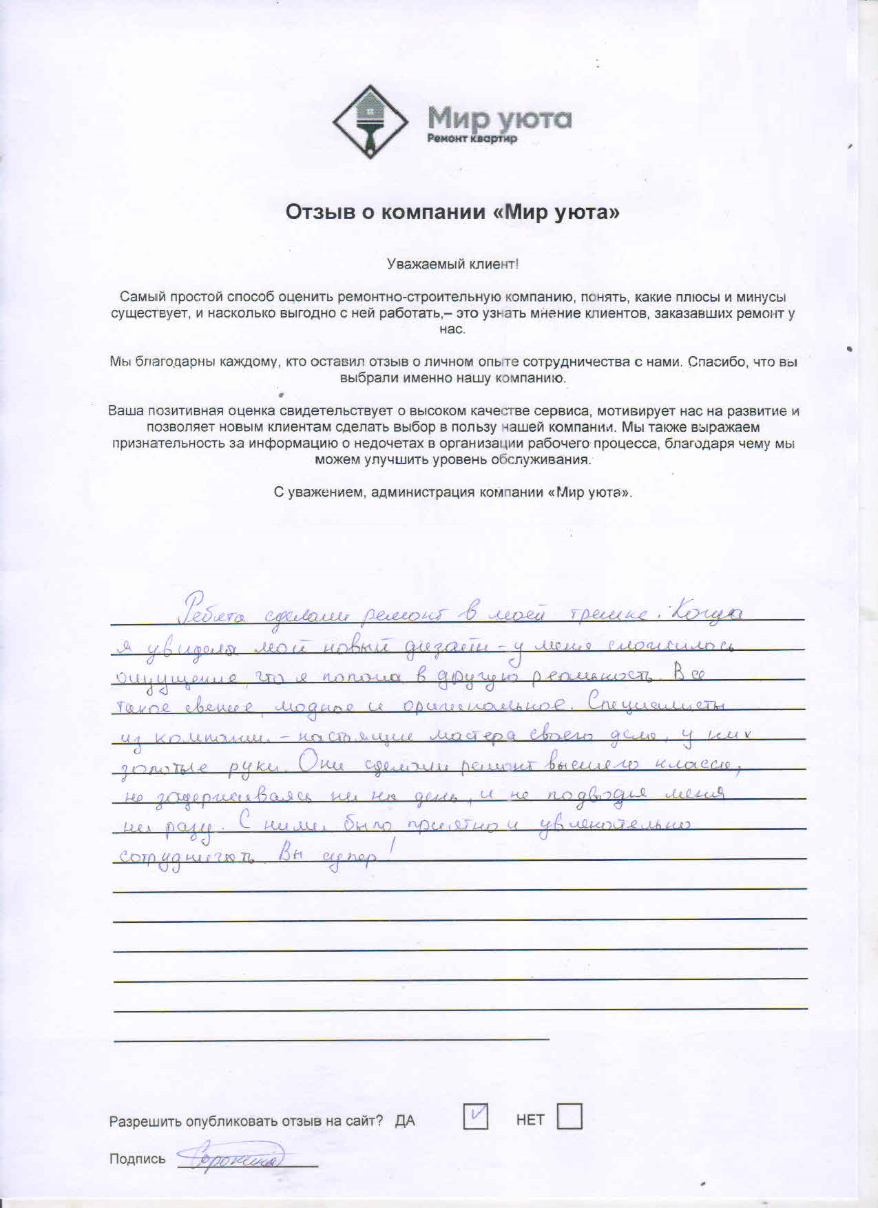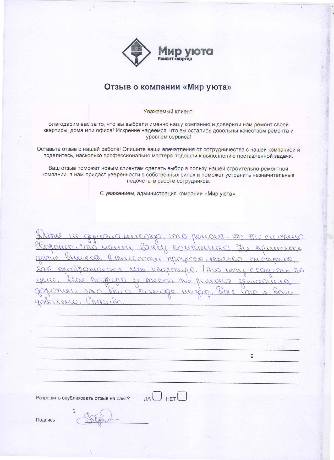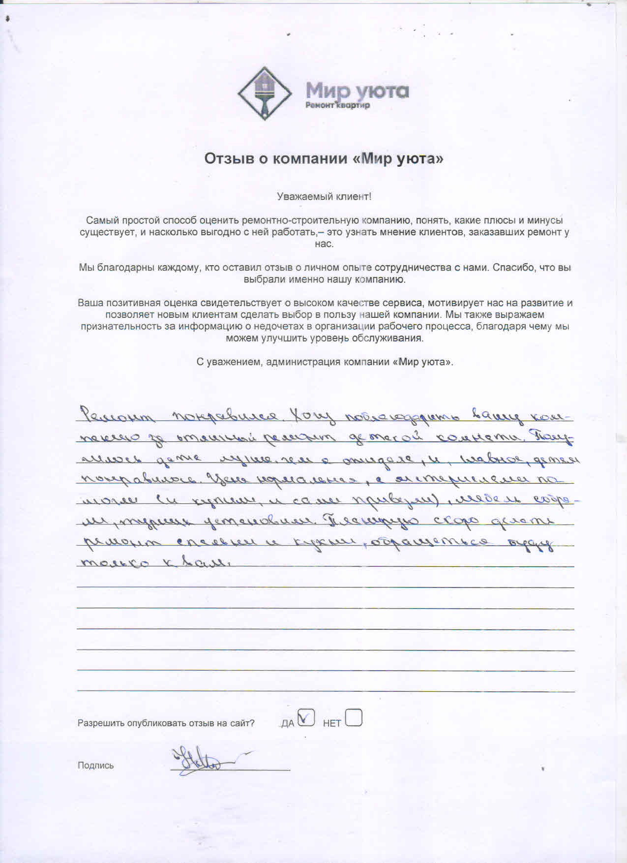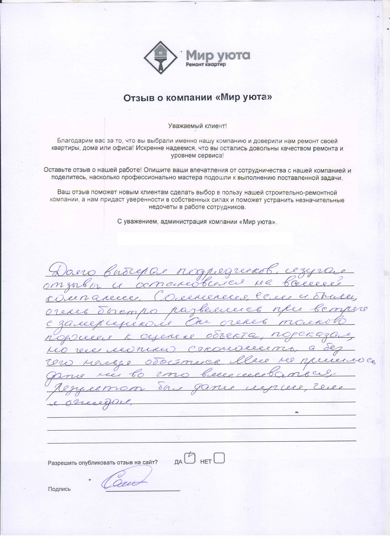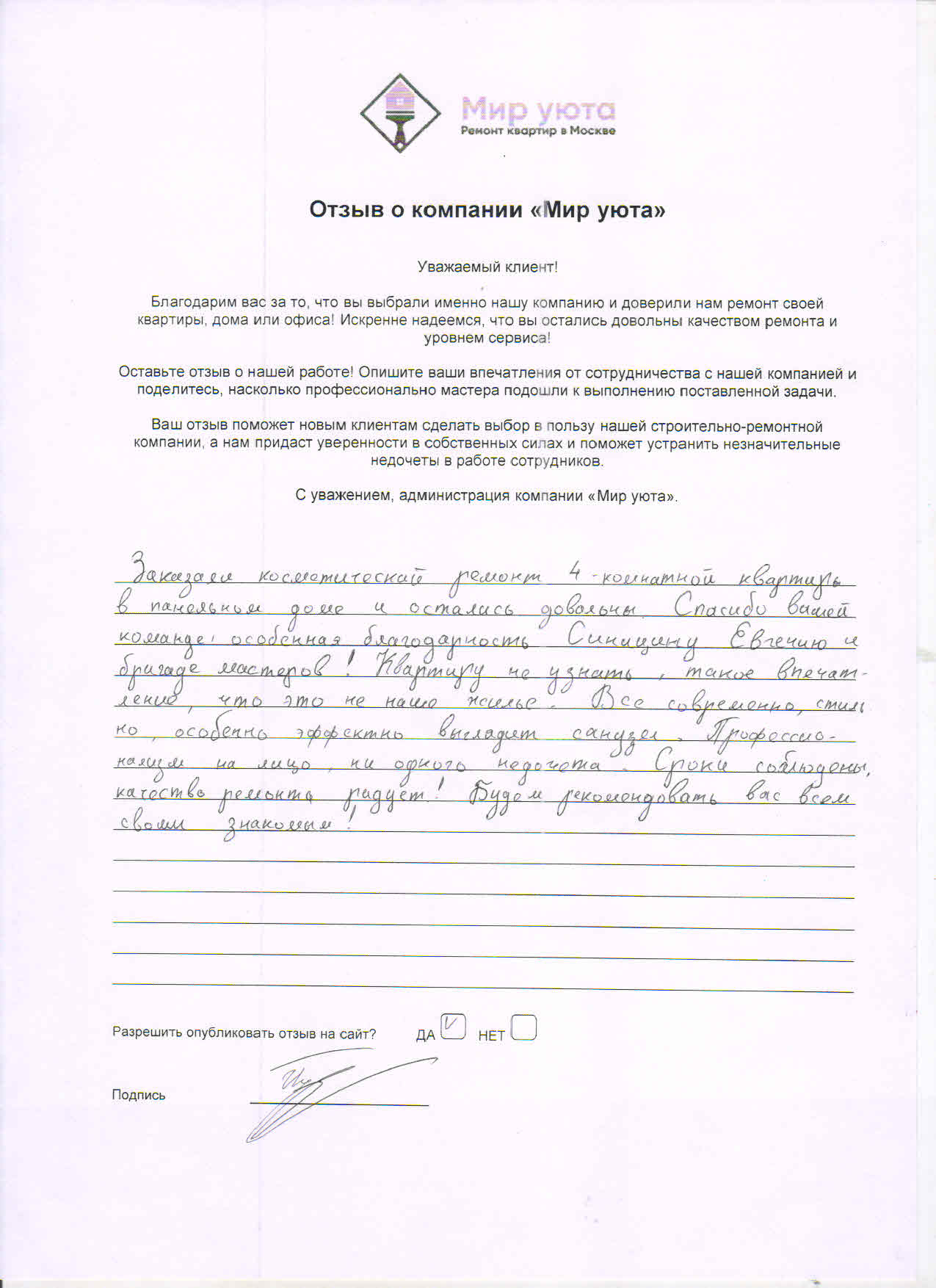 В данном разделе размещены отзывы наших клиентов, пожелавшим поделиться своими впечатлениями о качестве ремонта, профессионализме мастеров компании и уровне обслуживания. Мы еженедельно проводим опросы заказчиков, измеряя Индекс Удовлетворенности. Для нас важно мнение каждого, кто выбрал нашу ремонтно-строительную организацию в качестве исполнителя. Отзывы будут интересны и потенциальным заказчикам. Возможно, именно ваша оценка деятельности компании поможет потенциальным клиентам выбрать нас для выполнения будущего ремонта.
