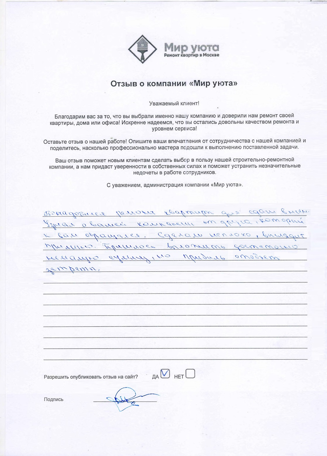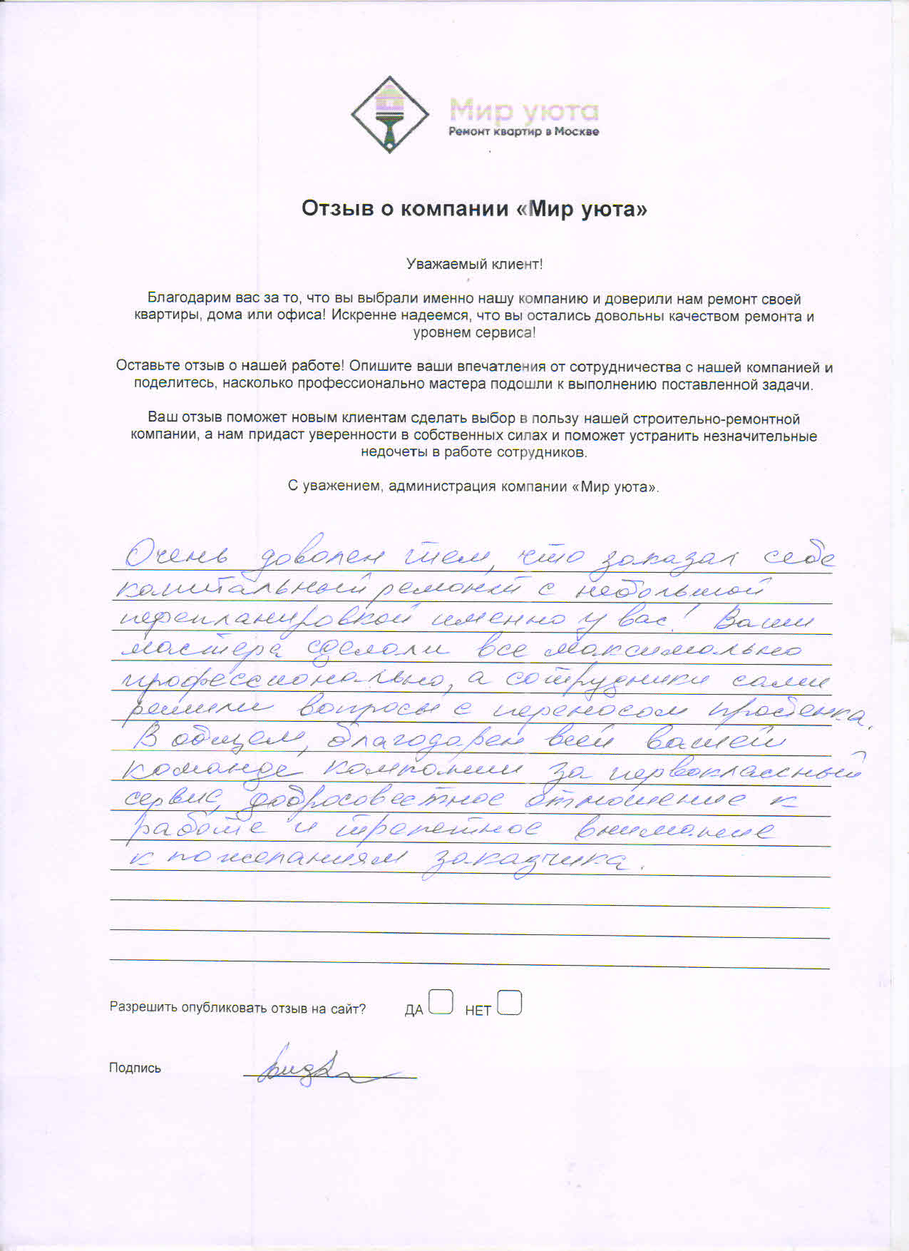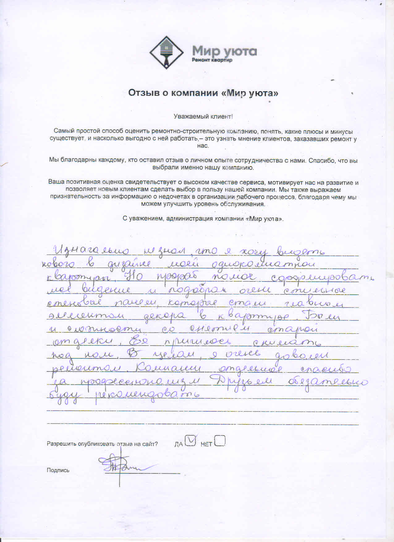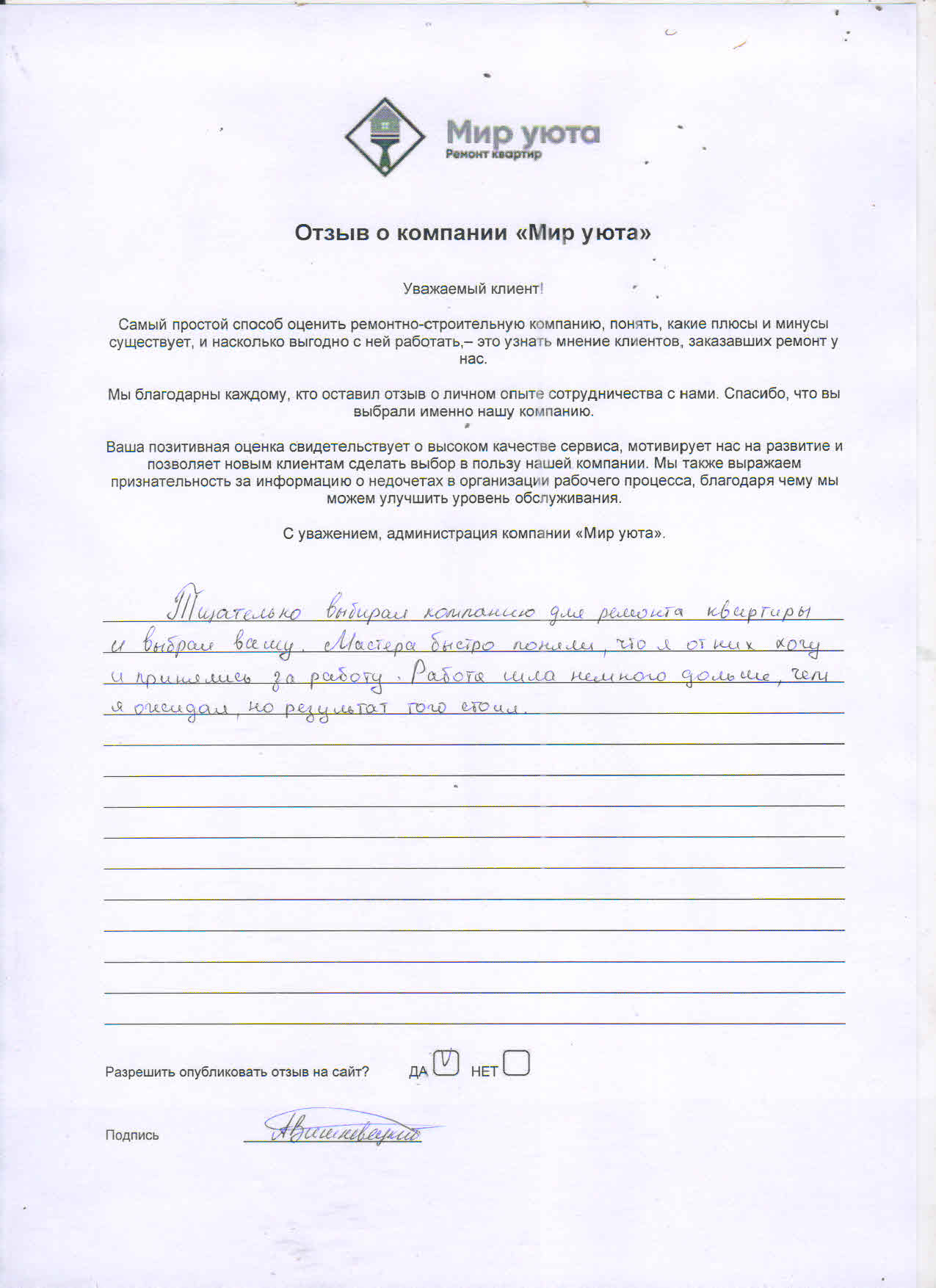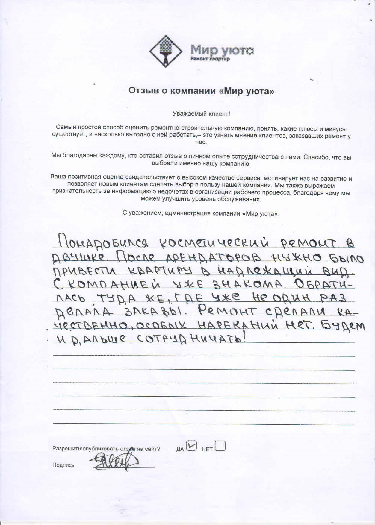 В данном разделе размещены отзывы наших клиентов, пожелавшим поделиться своими впечатлениями о качестве ремонта, профессионализме мастеров компании и уровне обслуживания. Мы еженедельно проводим опросы заказчиков, измеряя Индекс Удовлетворенности. Для нас важно мнение каждого, кто выбрал нашу ремонтно-строительную организацию в качестве исполнителя. Отзывы будут интересны и потенциальным заказчикам. Возможно, именно ваша оценка деятельности компании поможет потенциальным клиентам выбрать нас для выполнения будущего ремонта.