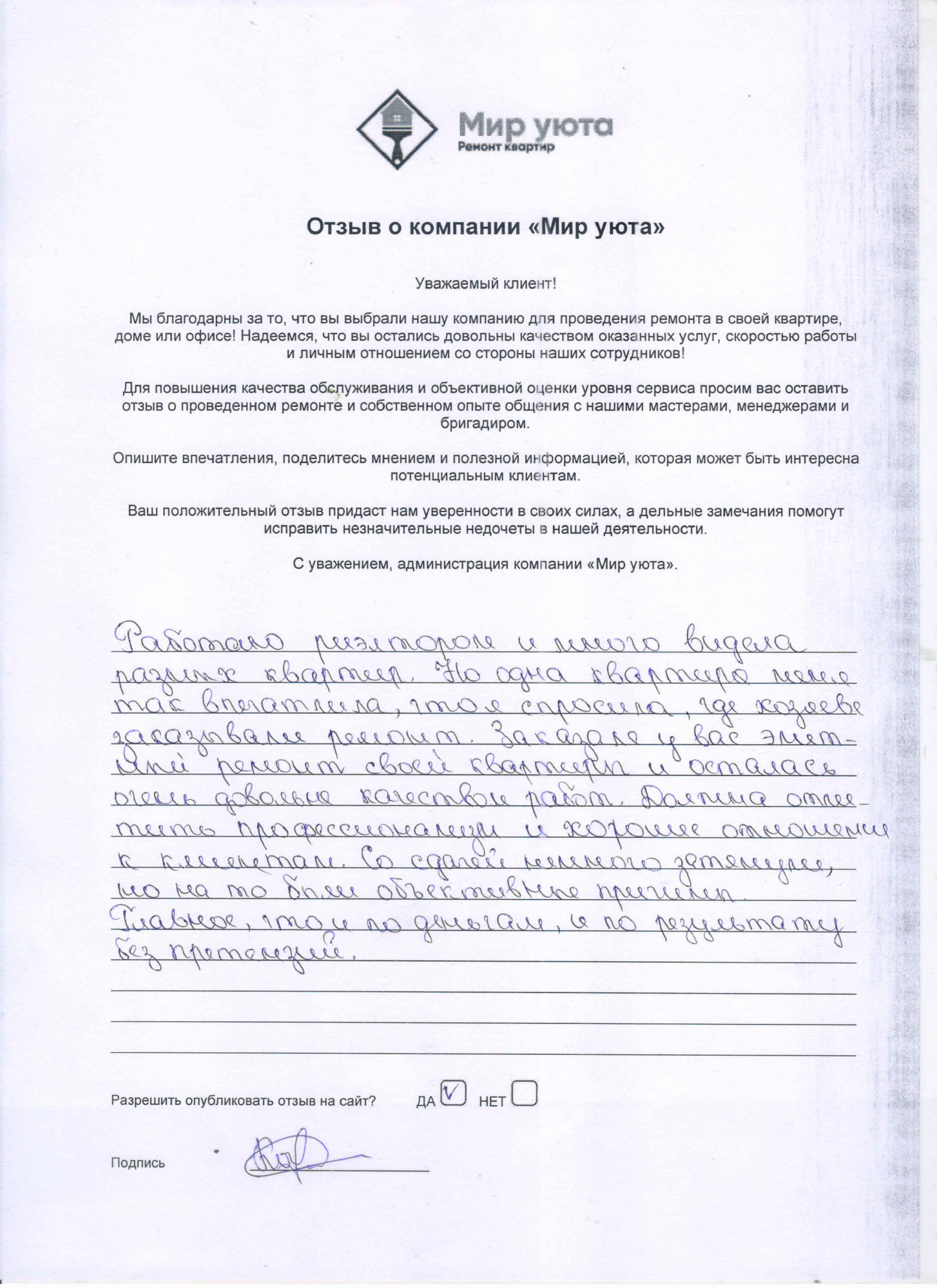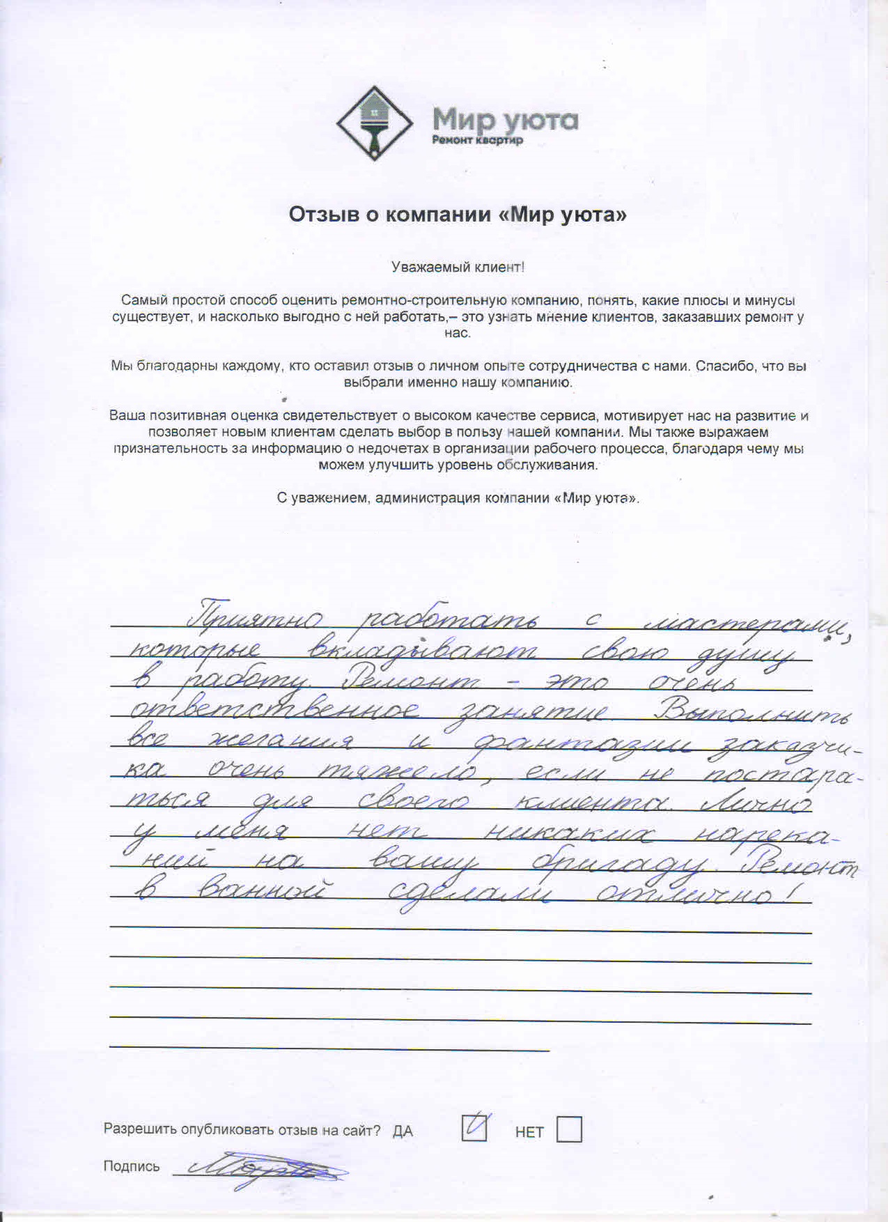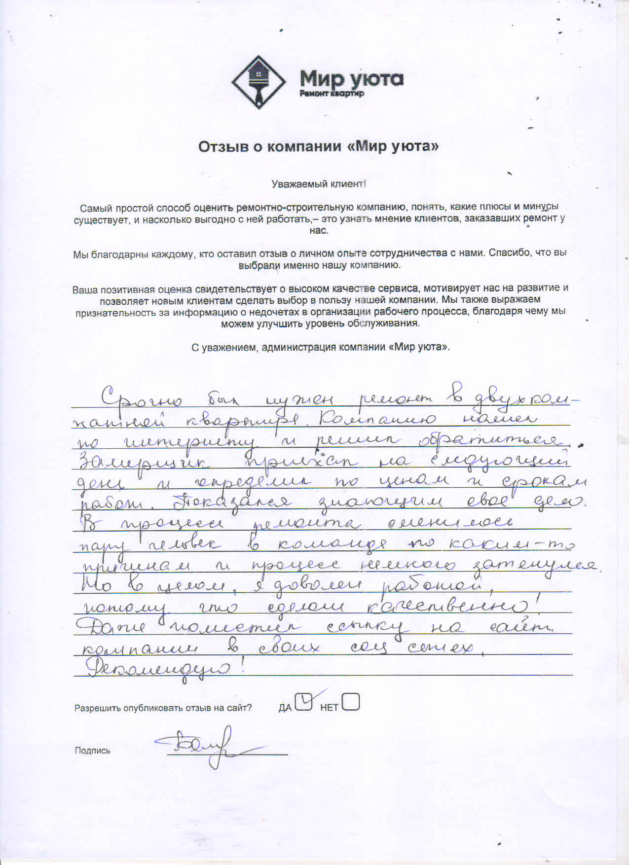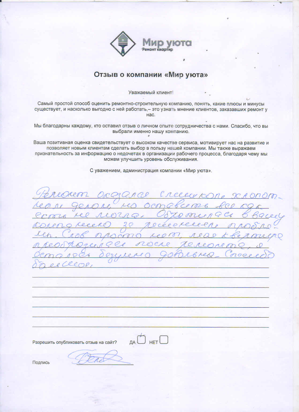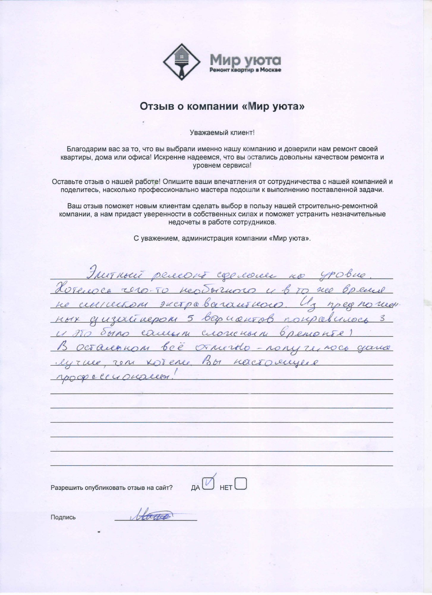 В данном разделе размещены отзывы наших клиентов, пожелавшим поделиться своими впечатлениями о качестве ремонта, профессионализме мастеров компании и уровне обслуживания. Мы еженедельно проводим опросы заказчиков, измеряя Индекс Удовлетворенности. Для нас важно мнение каждого, кто выбрал нашу ремонтно-строительную организацию в качестве исполнителя. Отзывы будут интересны и потенциальным заказчикам. Возможно, именно ваша оценка деятельности компании поможет потенциальным клиентам выбрать нас для выполнения будущего ремонта.