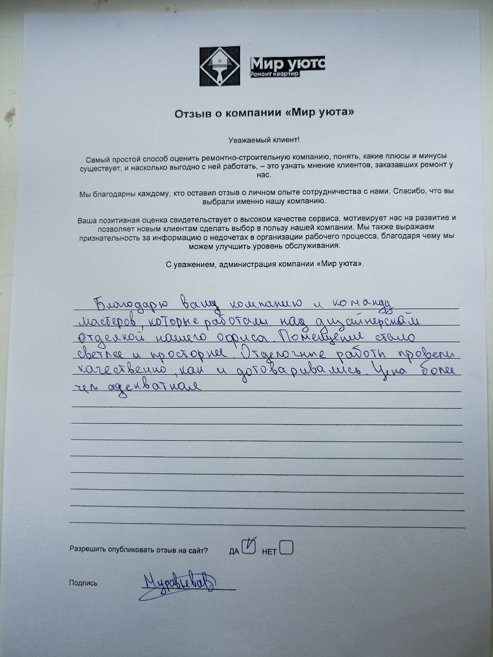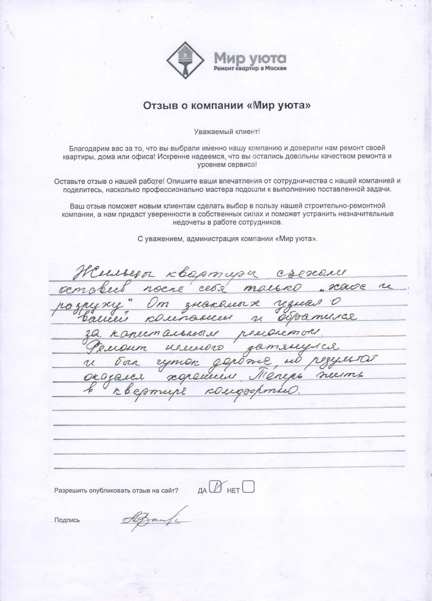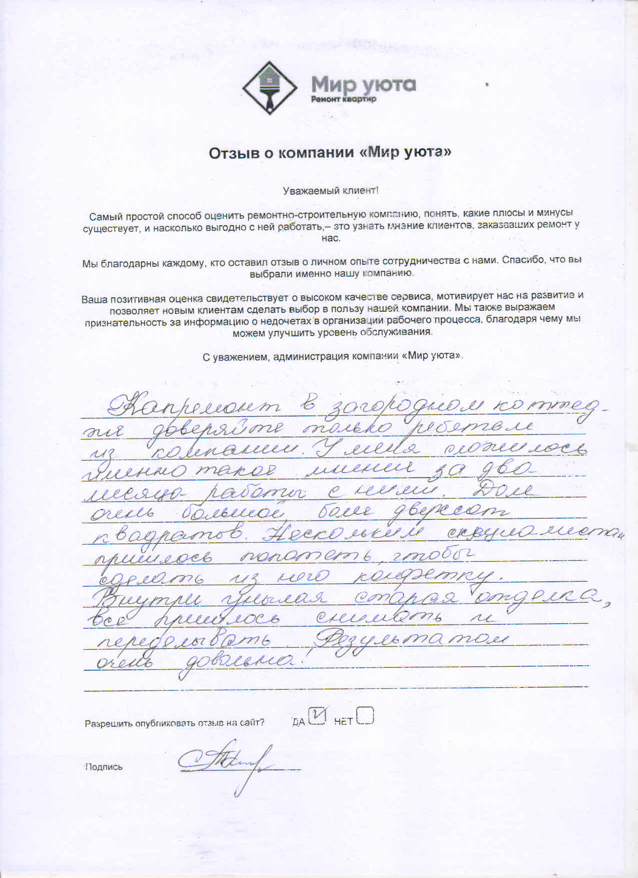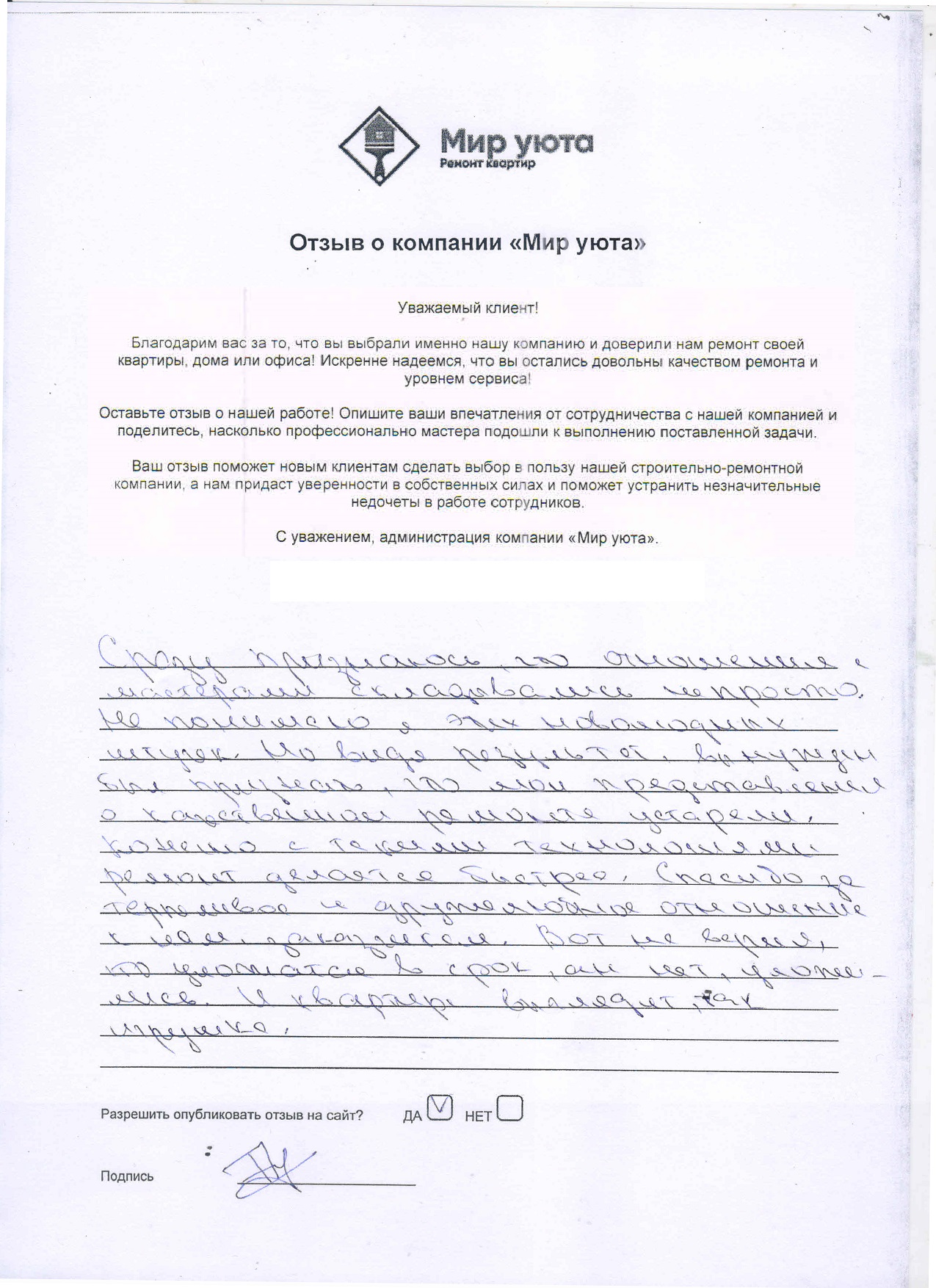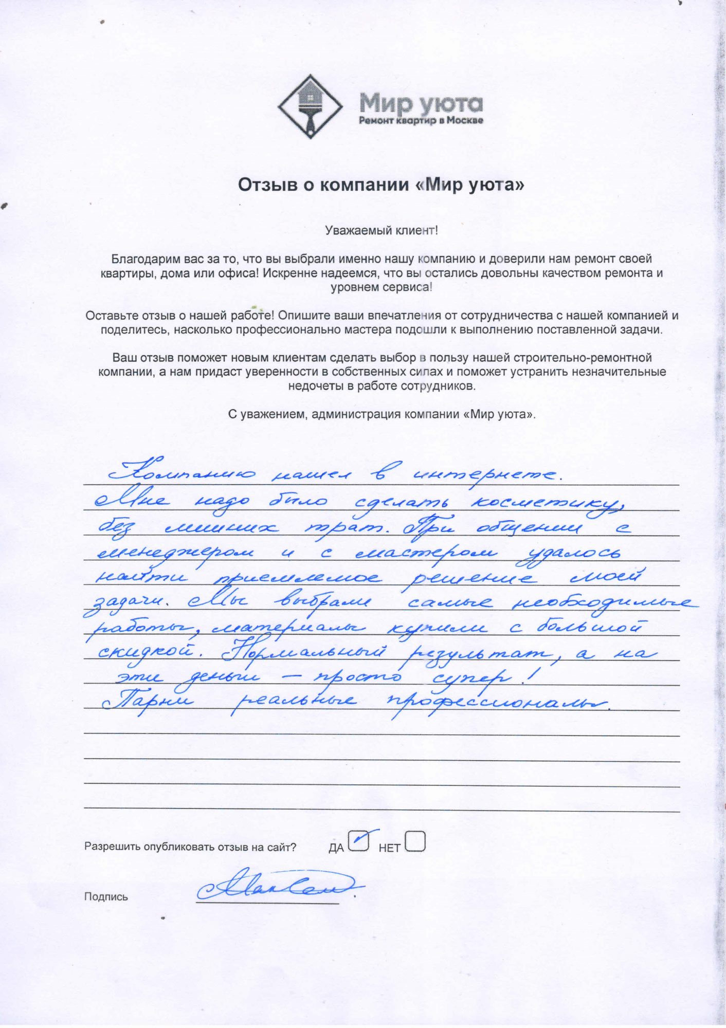 В данном разделе размещены отзывы наших клиентов, пожелавшим поделиться своими впечатлениями о качестве ремонта, профессионализме мастеров компании и уровне обслуживания. Мы еженедельно проводим опросы заказчиков, измеряя Индекс Удовлетворенности. Для нас важно мнение каждого, кто выбрал нашу ремонтно-строительную организацию в качестве исполнителя. Отзывы будут интересны и потенциальным заказчикам. Возможно, именно ваша оценка деятельности компании поможет потенциальным клиентам выбрать нас для выполнения будущего ремонта.