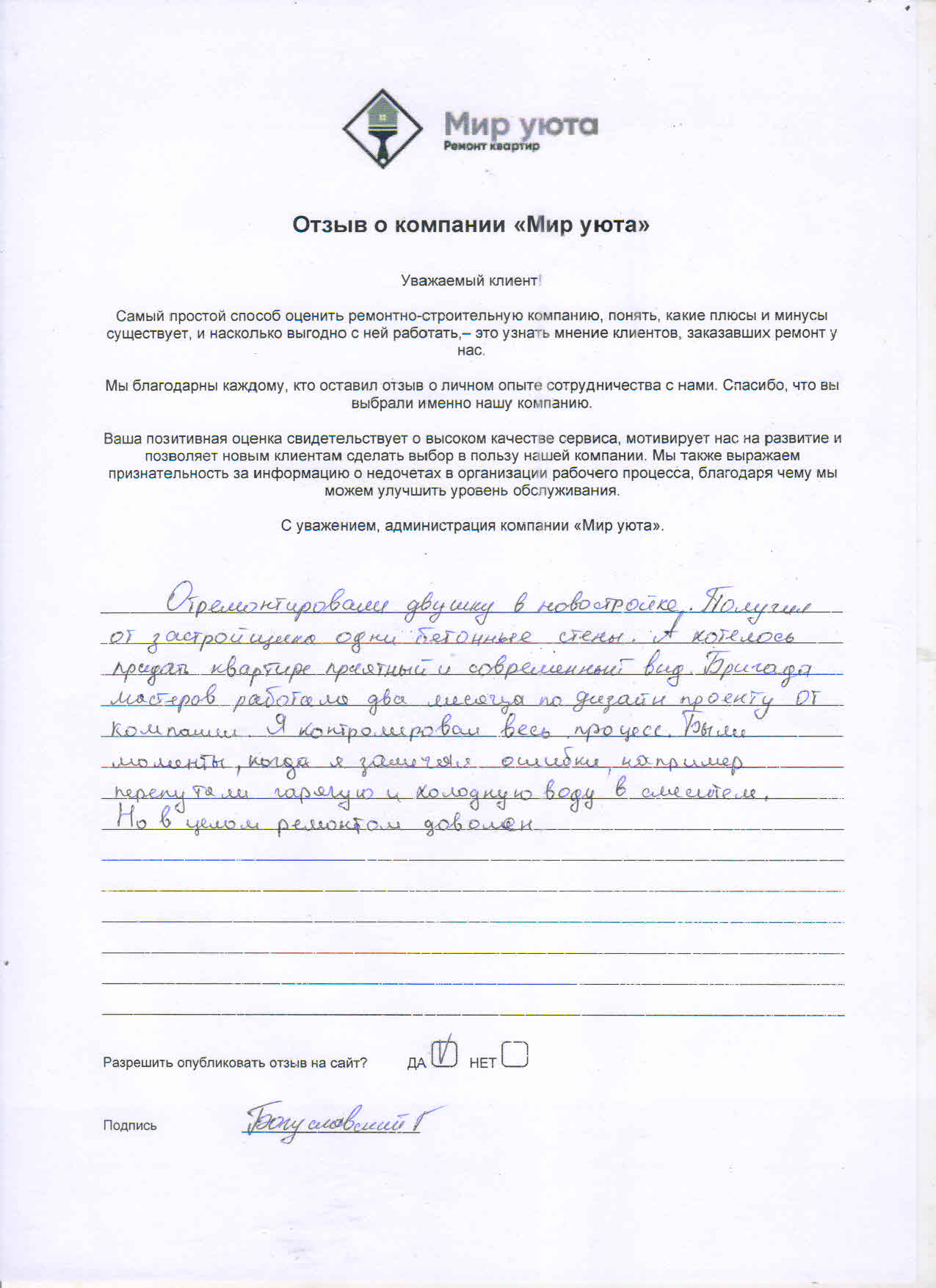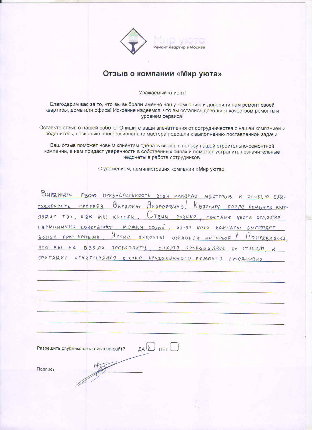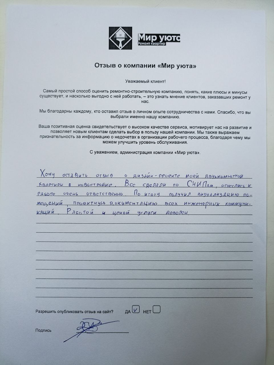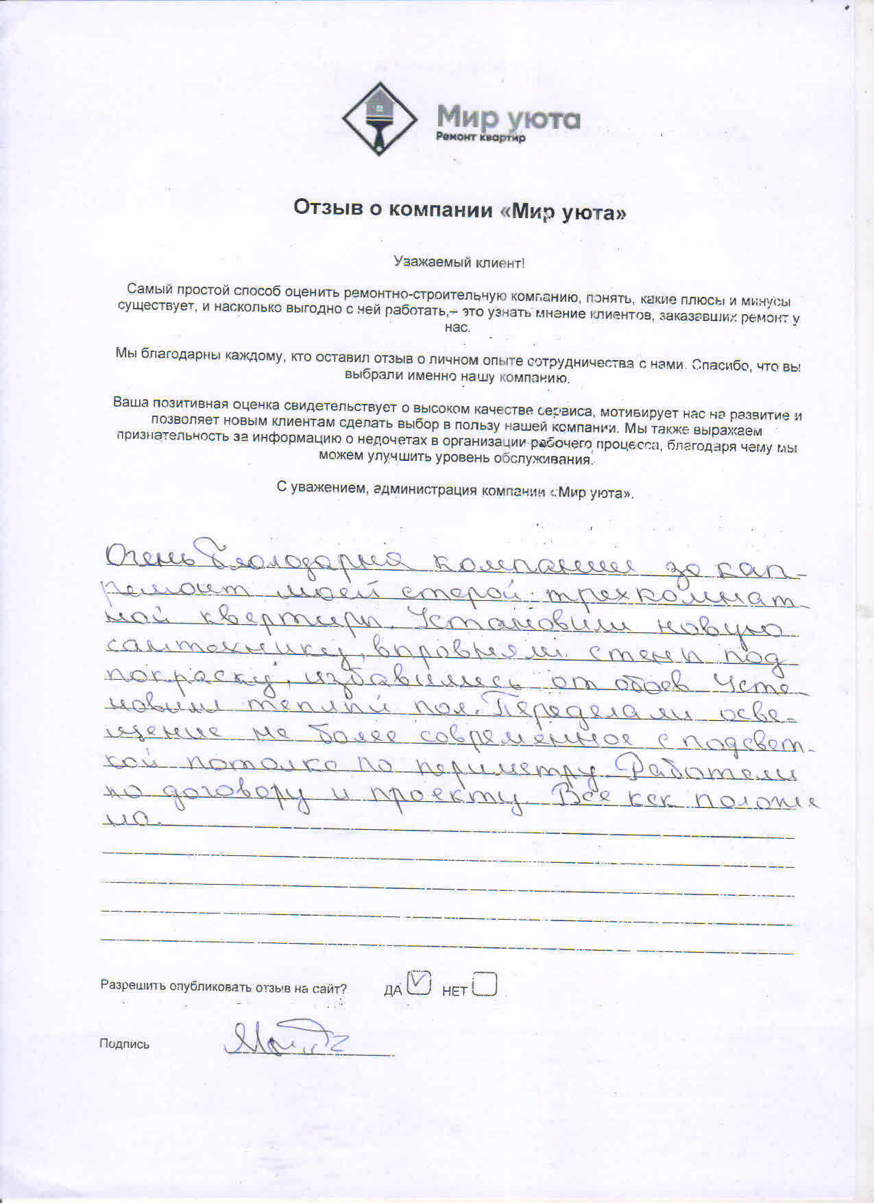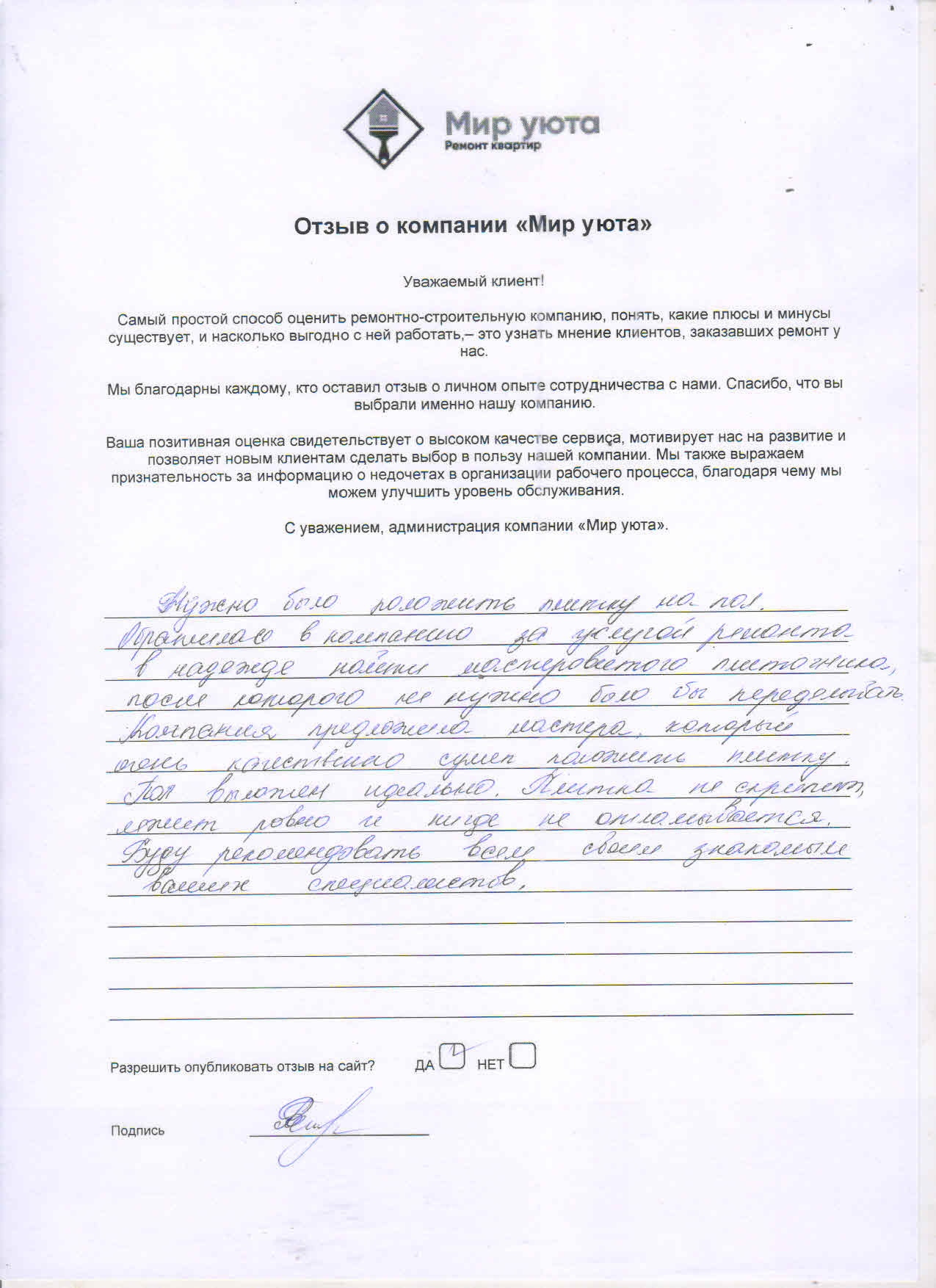В данном разделе размещены отзывы наших клиентов, пожелавшим поделиться своими впечатлениями о качестве ремонта, профессионализме мастеров компании и уровне обслуживания. Мы еженедельно проводим опросы заказчиков, измеряя Индекс Удовлетворенности. Для нас важно мнение каждого, кто выбрал нашу ремонтно-строительную организацию в качестве исполнителя. Отзывы будут интересны и потенциальным заказчикам. Возможно, именно ваша оценка деятельности компании поможет потенциальным клиентам выбрать нас для выполнения будущего ремонта.