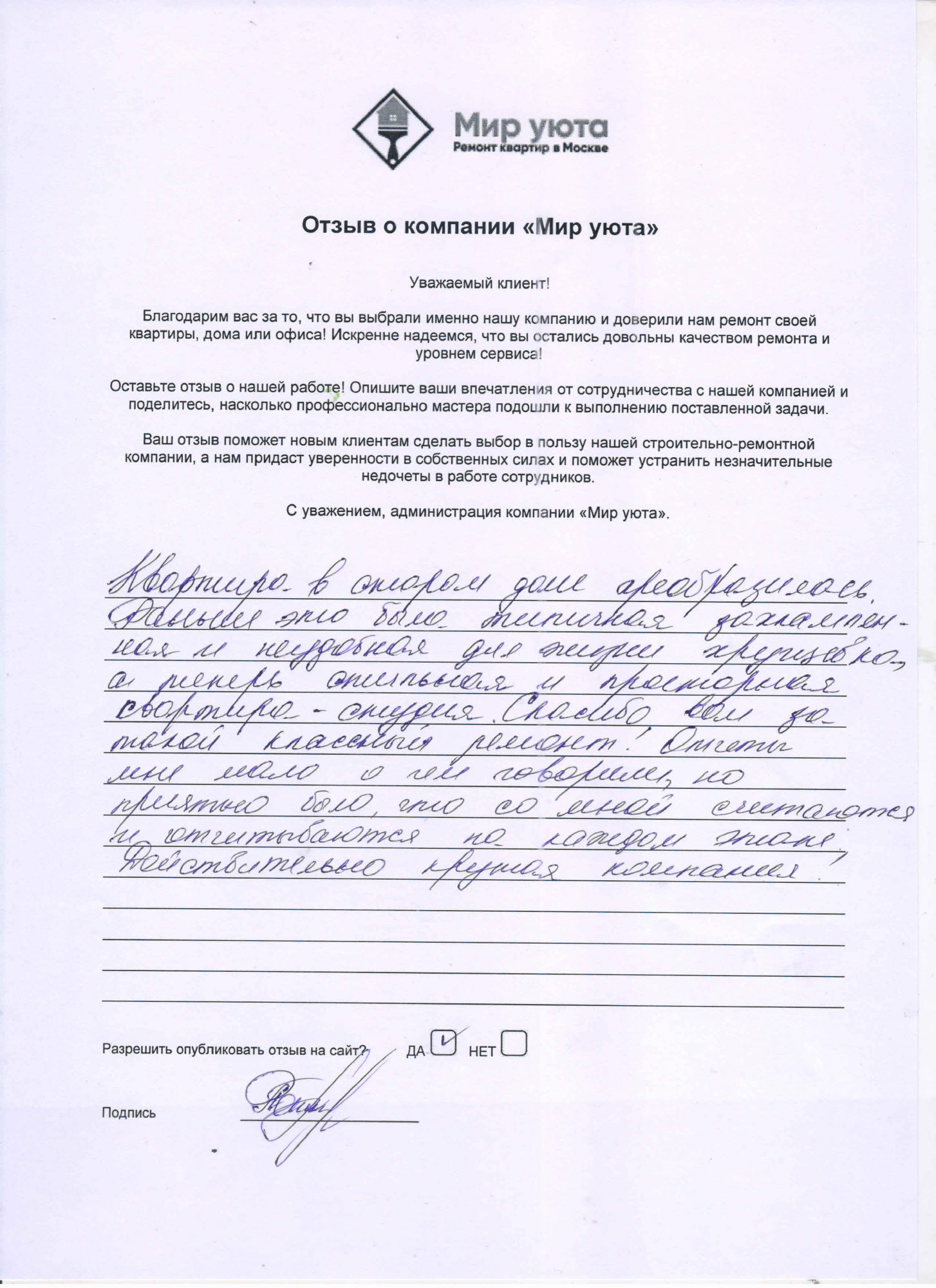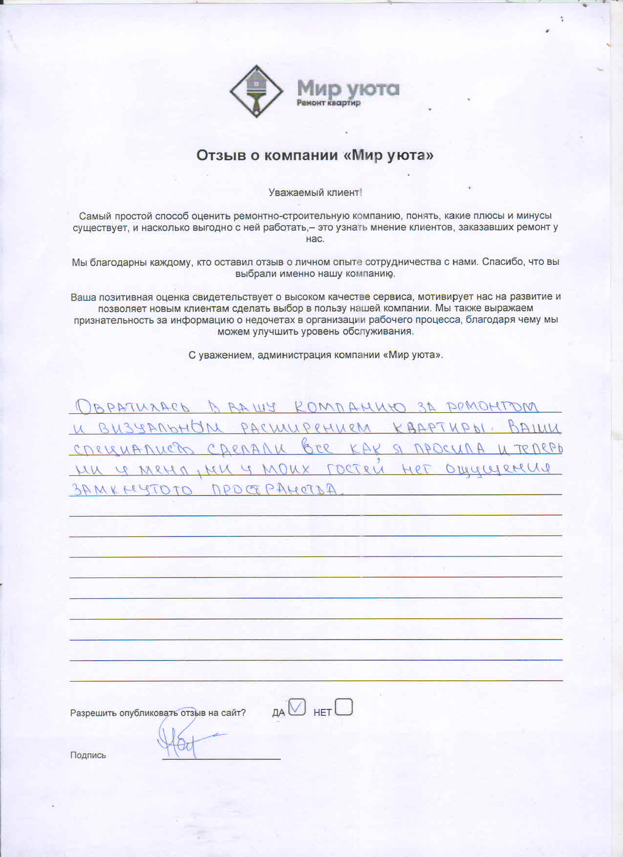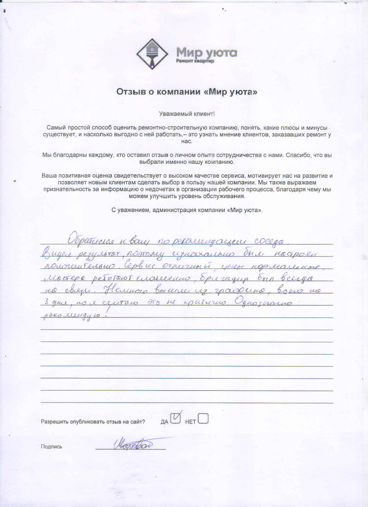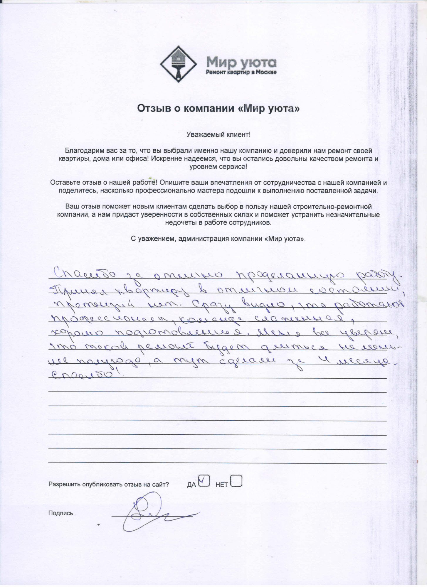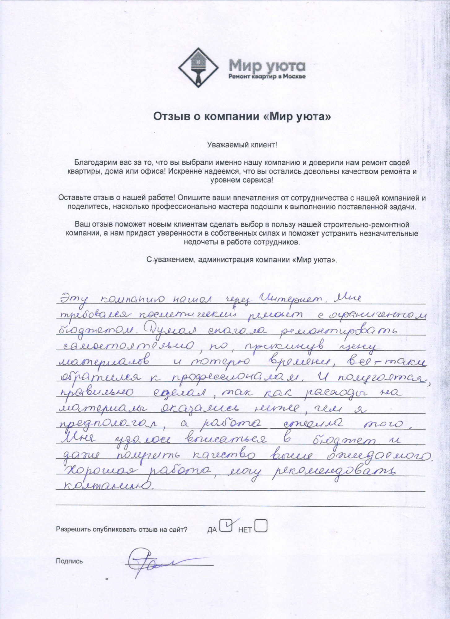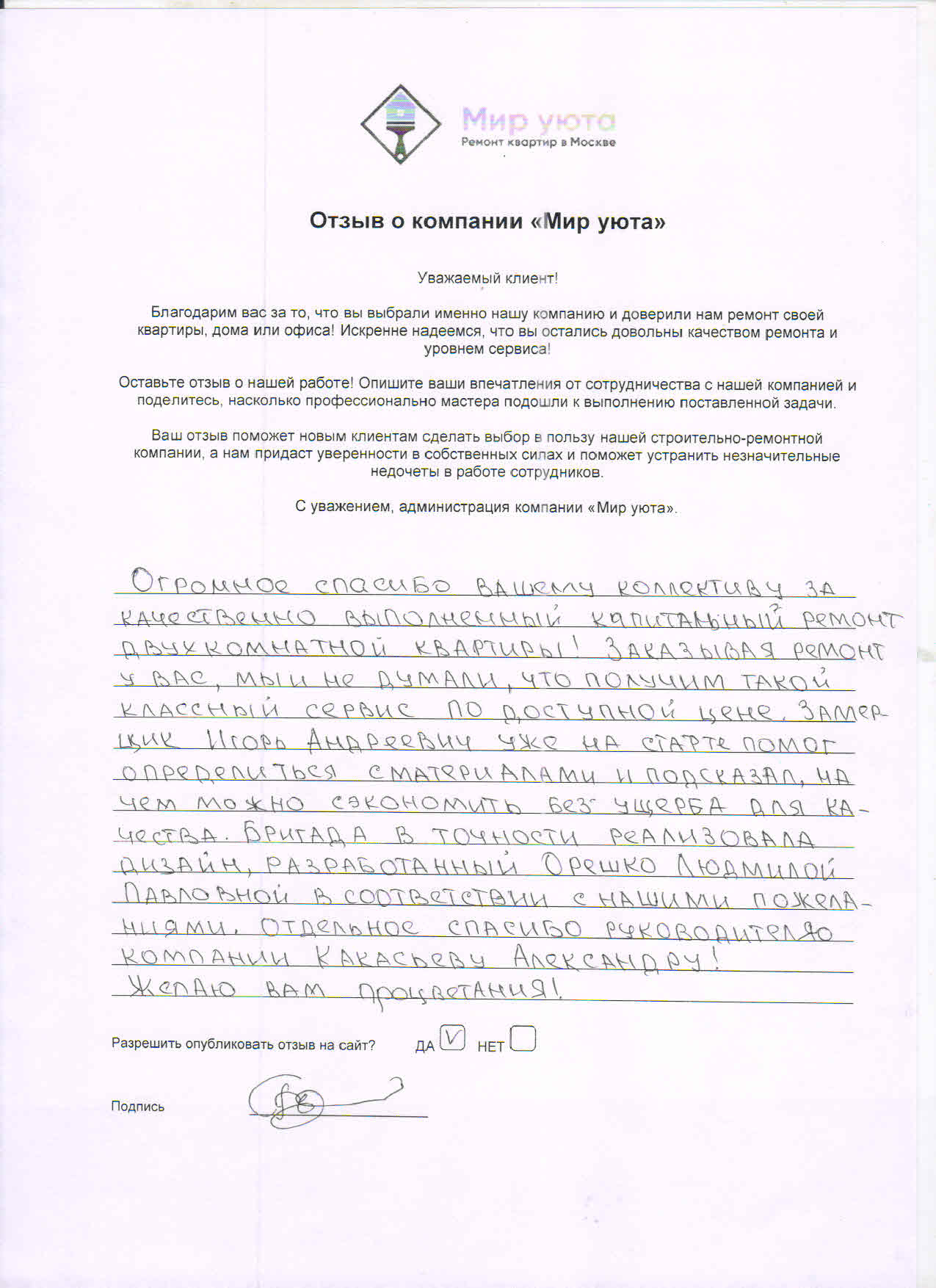 В данном разделе размещены отзывы наших клиентов, пожелавшим поделиться своими впечатлениями о качестве ремонта, профессионализме мастеров компании и уровне обслуживания. Мы еженедельно проводим опросы заказчиков, измеряя Индекс Удовлетворенности. Для нас важно мнение каждого, кто выбрал нашу ремонтно-строительную организацию в качестве исполнителя. Отзывы будут интересны и потенциальным заказчикам. Возможно, именно ваша оценка деятельности компании поможет потенциальным клиентам выбрать нас для выполнения будущего ремонта.