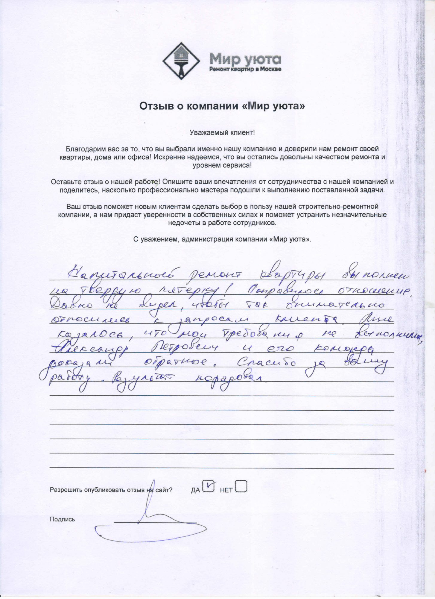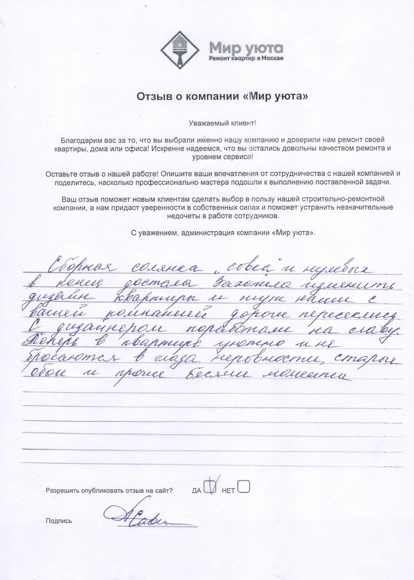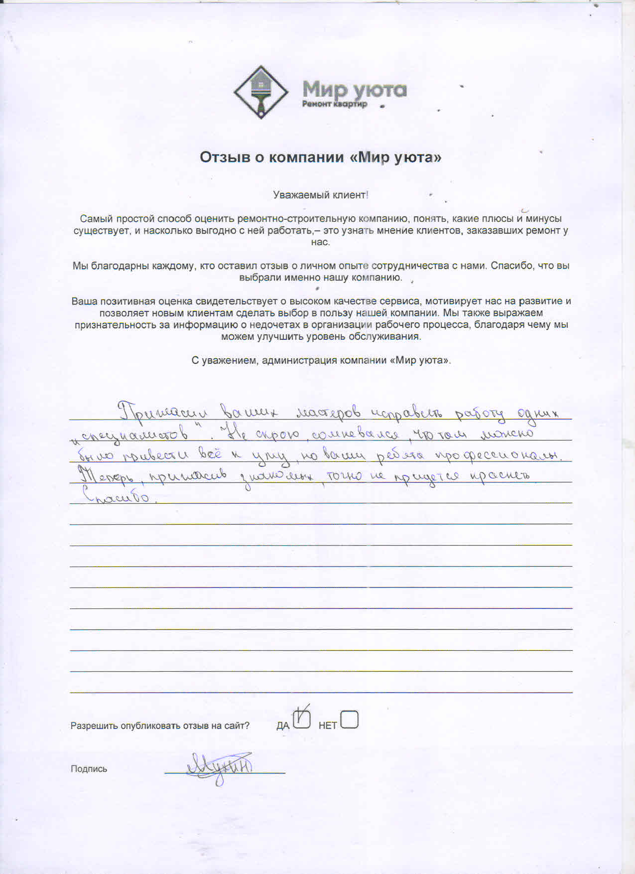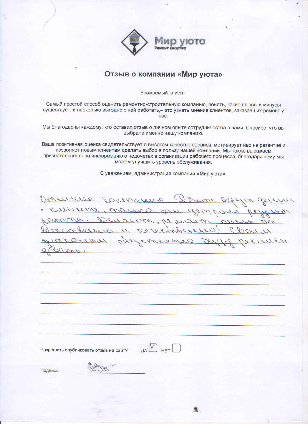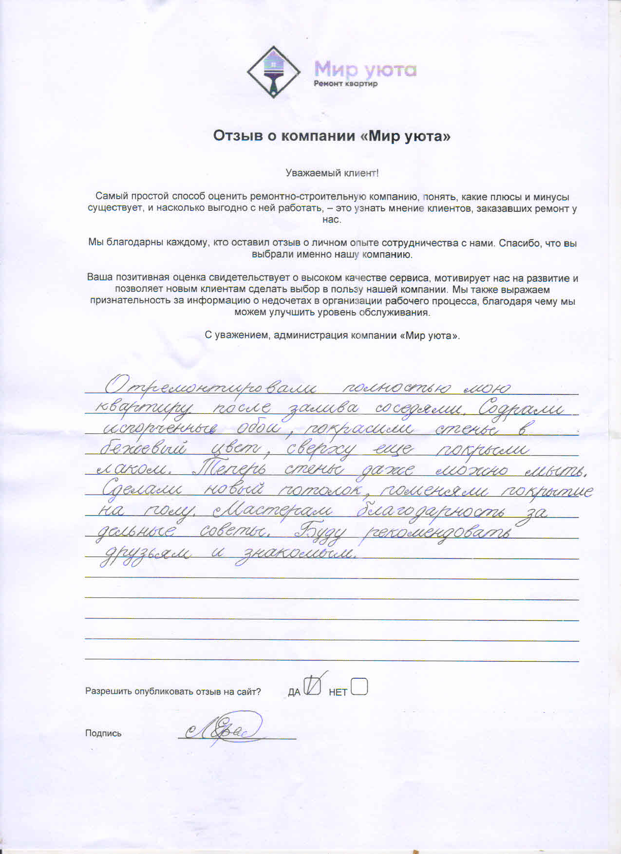 В данном разделе размещены отзывы наших клиентов, пожелавшим поделиться своими впечатлениями о качестве ремонта, профессионализме мастеров компании и уровне обслуживания. Мы еженедельно проводим опросы заказчиков, измеряя Индекс Удовлетворенности. Для нас важно мнение каждого, кто выбрал нашу ремонтно-строительную организацию в качестве исполнителя. Отзывы будут интересны и потенциальным заказчикам. Возможно, именно ваша оценка деятельности компании поможет потенциальным клиентам выбрать нас для выполнения будущего ремонта.