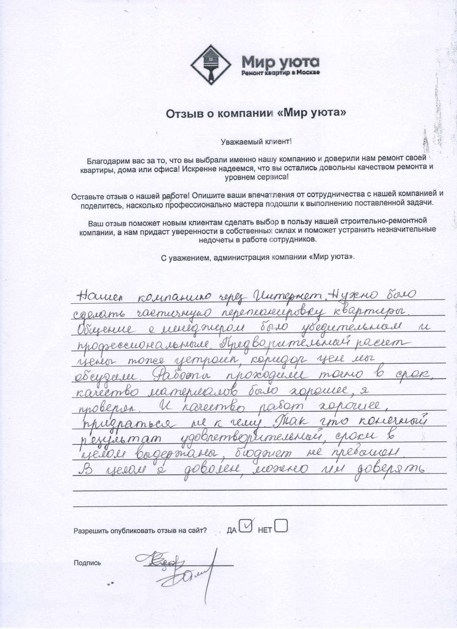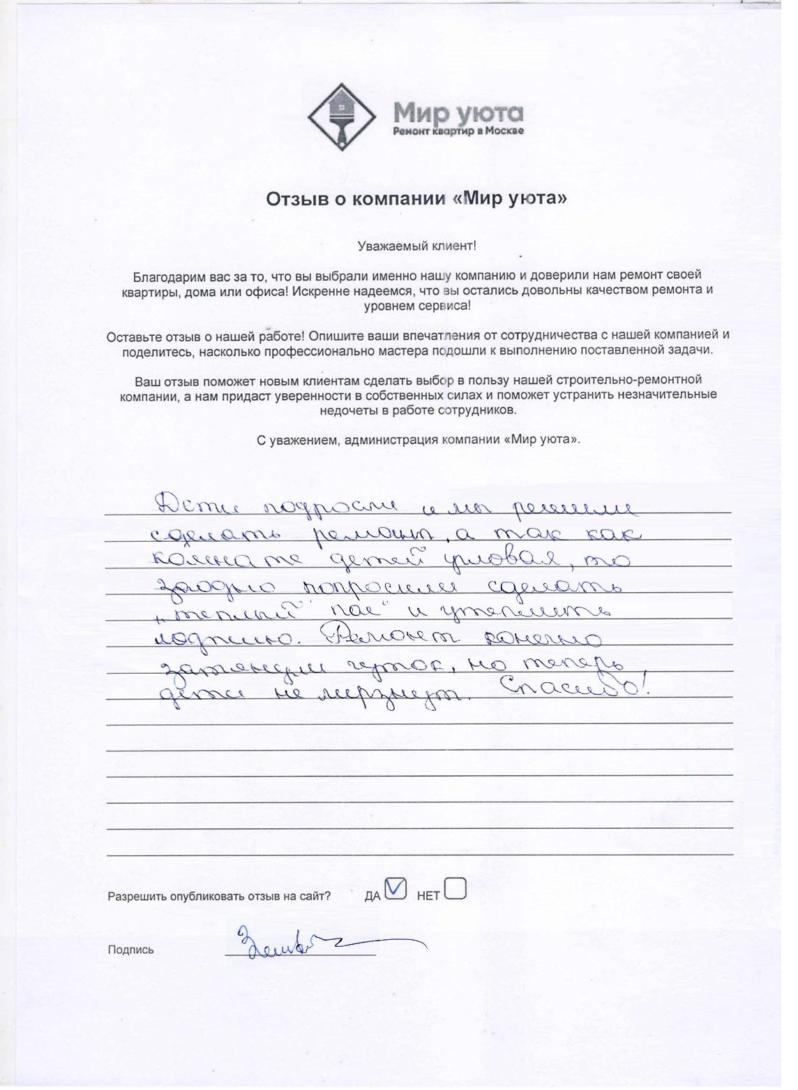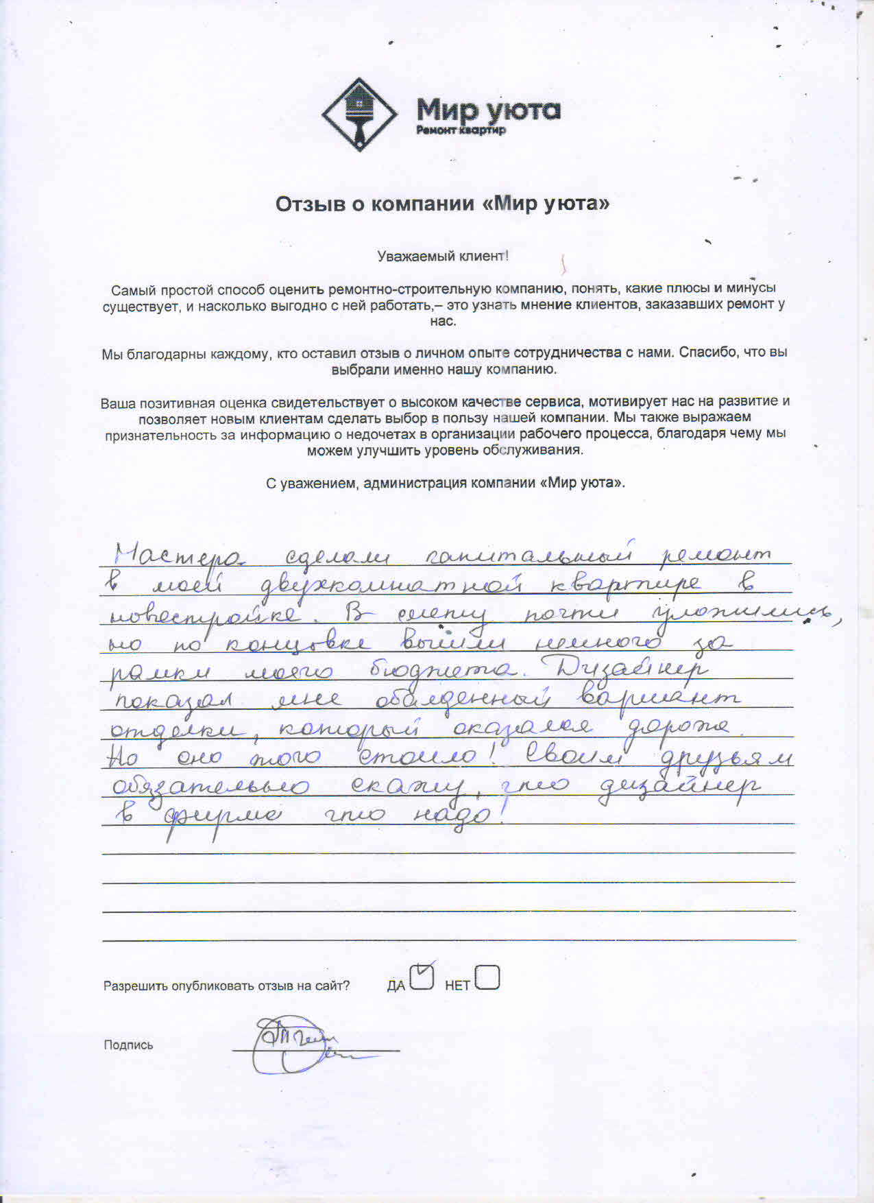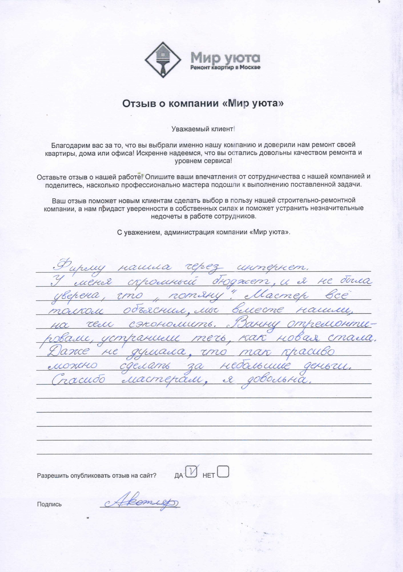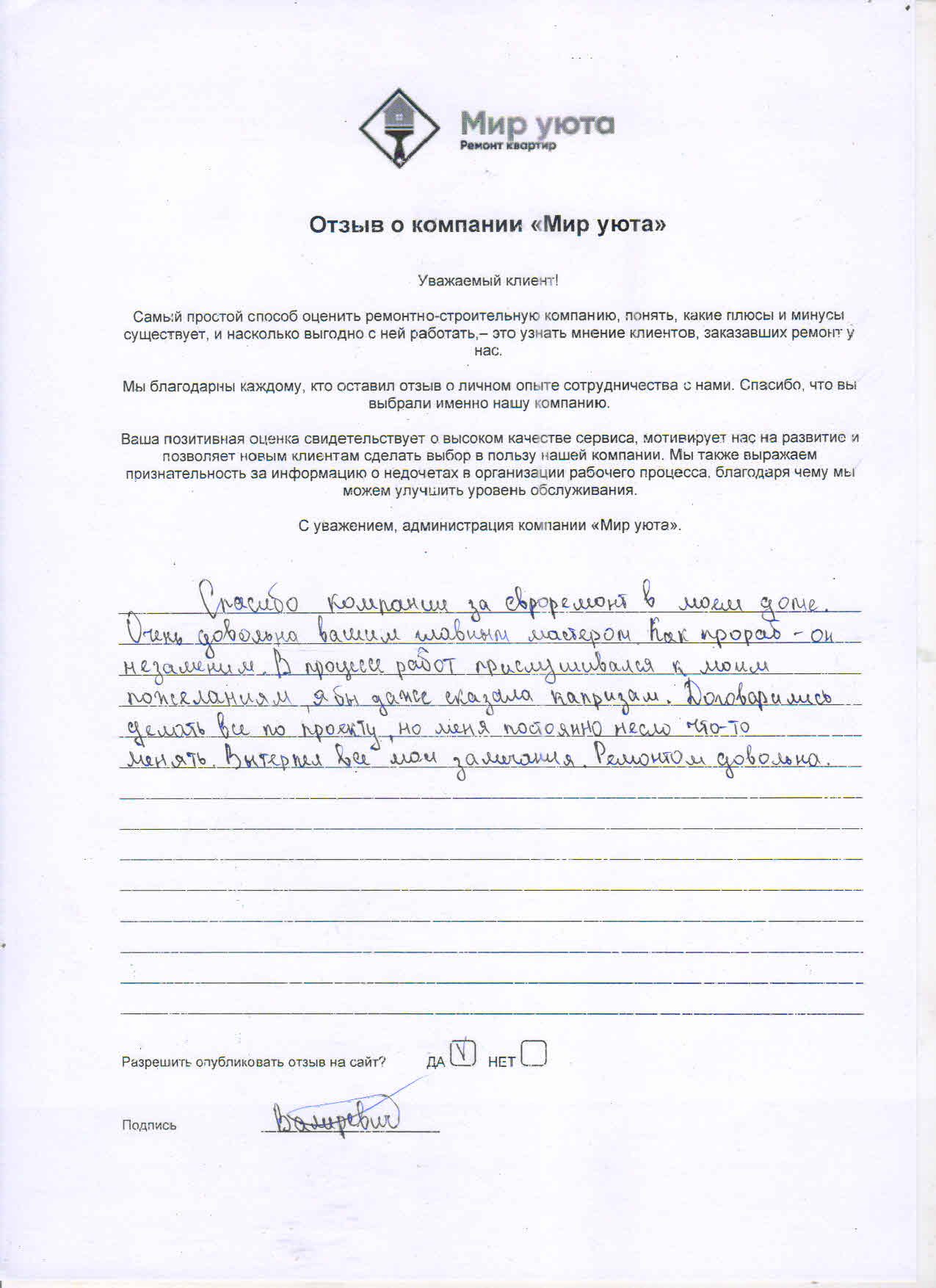 В данном разделе размещены отзывы наших клиентов, пожелавшим поделиться своими впечатлениями о качестве ремонта, профессионализме мастеров компании и уровне обслуживания. Мы еженедельно проводим опросы заказчиков, измеряя Индекс Удовлетворенности. Для нас важно мнение каждого, кто выбрал нашу ремонтно-строительную организацию в качестве исполнителя. Отзывы будут интересны и потенциальным заказчикам. Возможно, именно ваша оценка деятельности компании поможет потенциальным клиентам выбрать нас для выполнения будущего ремонта.