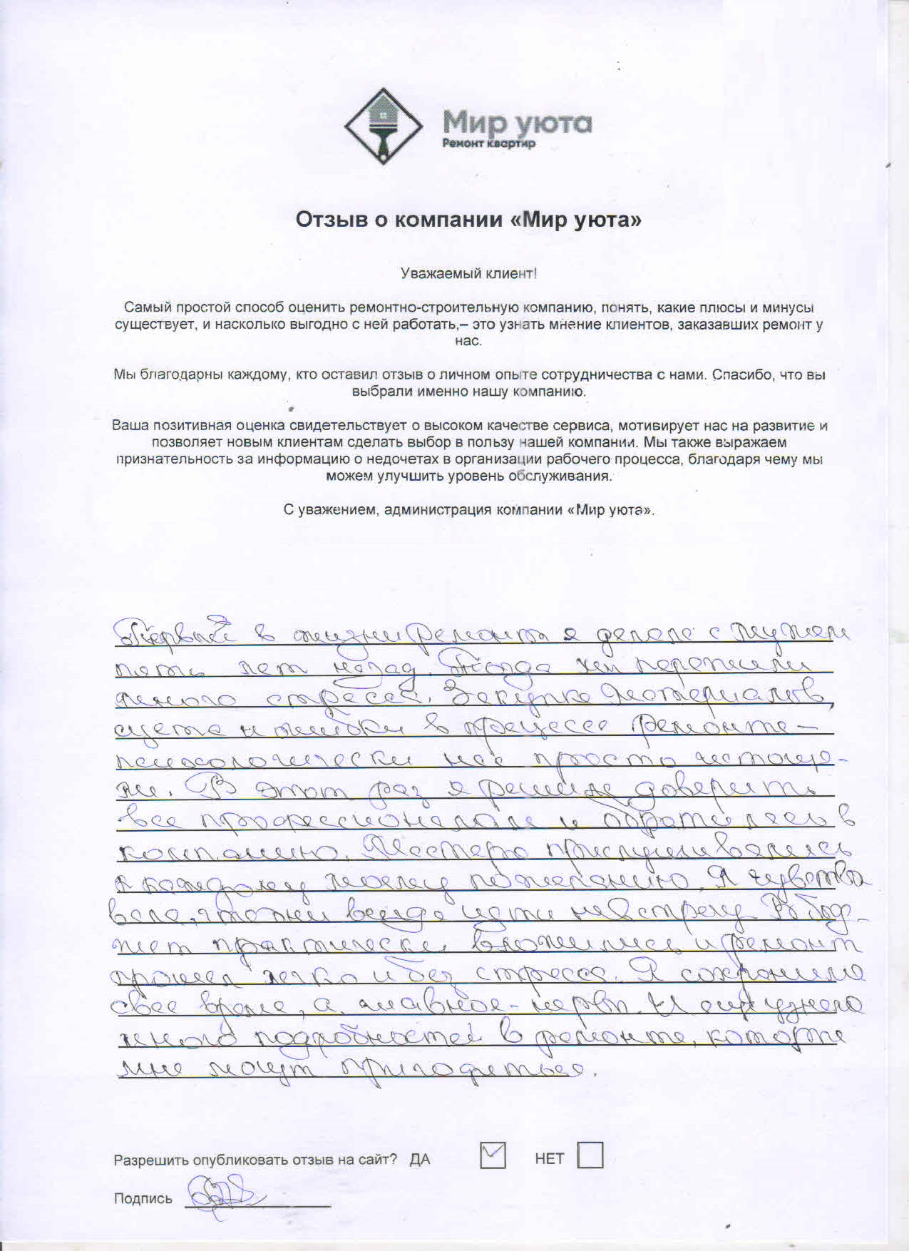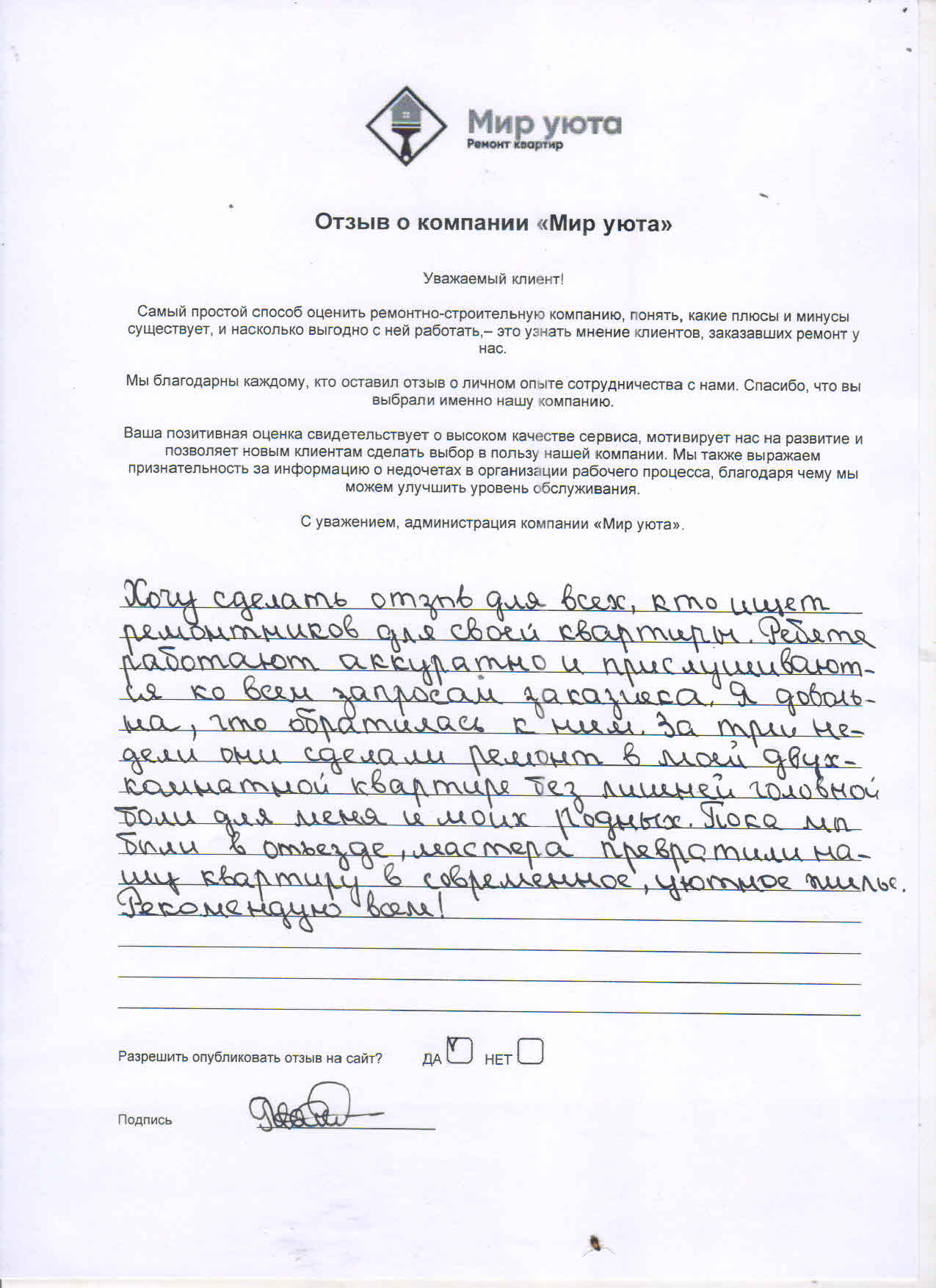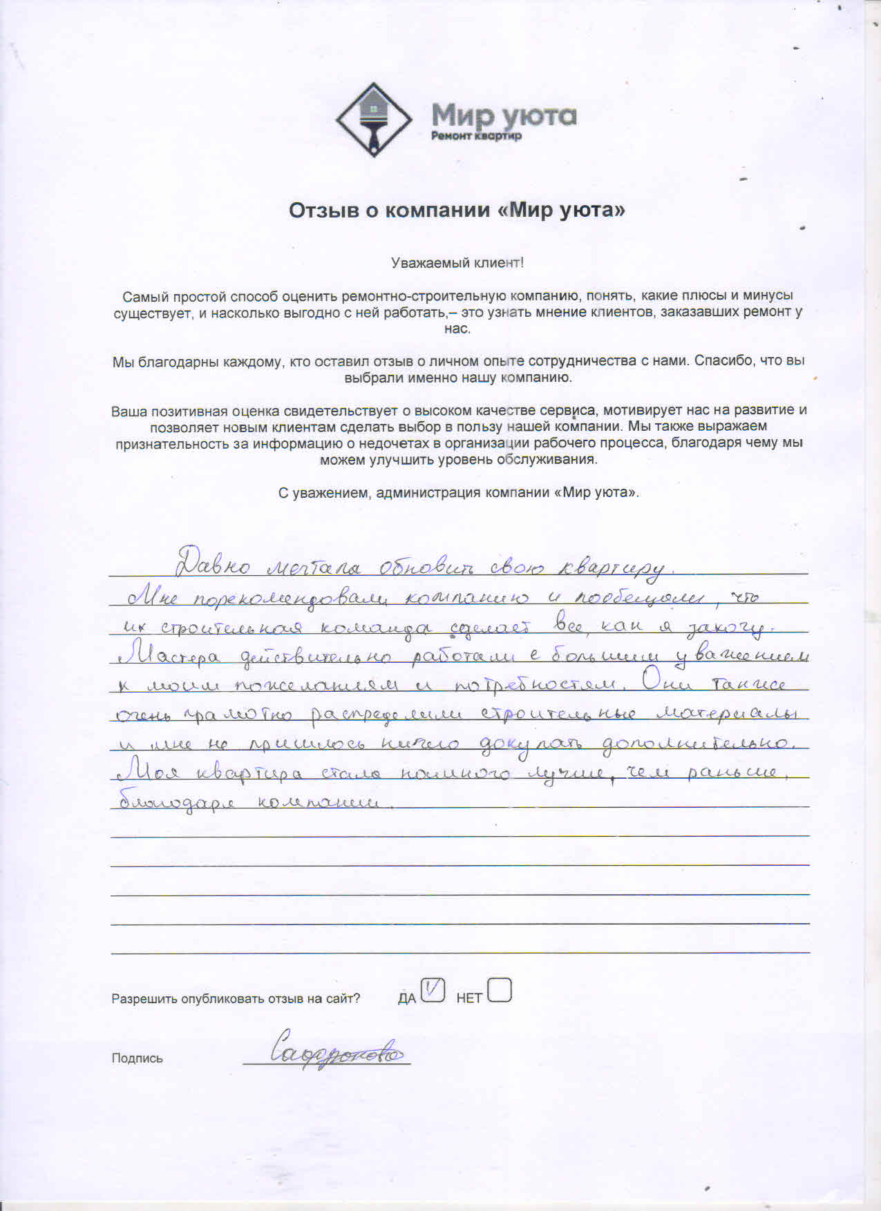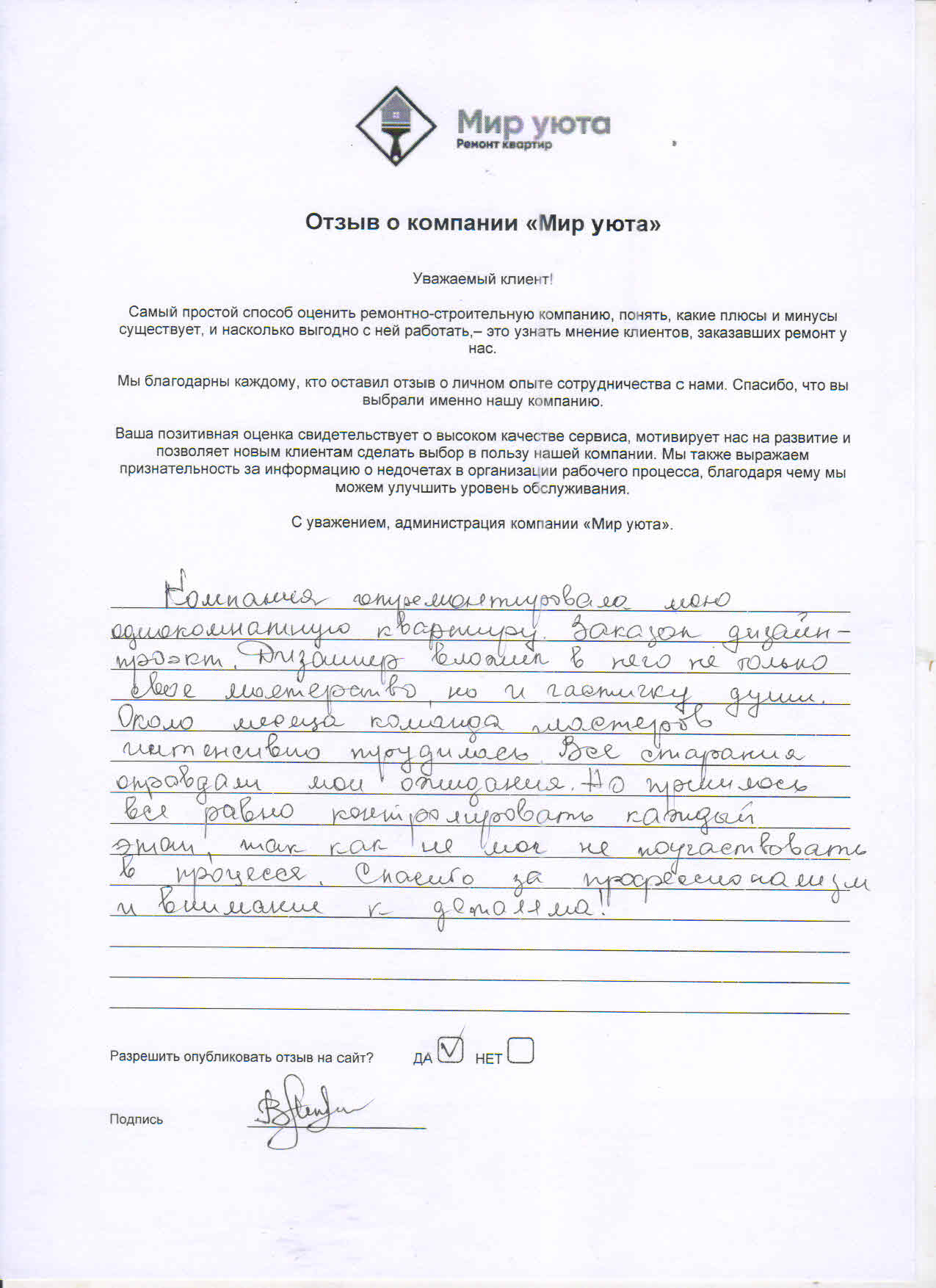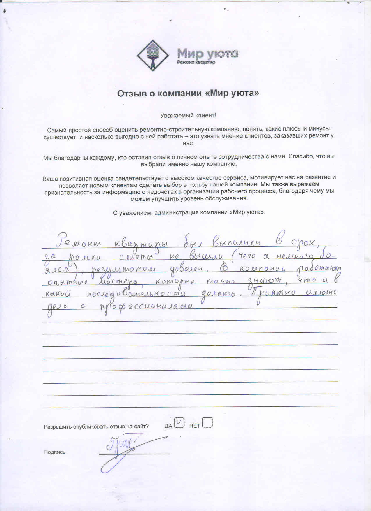 В данном разделе размещены отзывы наших клиентов, пожелавшим поделиться своими впечатлениями о качестве ремонта, профессионализме мастеров компании и уровне обслуживания. Мы еженедельно проводим опросы заказчиков, измеряя Индекс Удовлетворенности. Для нас важно мнение каждого, кто выбрал нашу ремонтно-строительную организацию в качестве исполнителя. Отзывы будут интересны и потенциальным заказчикам. Возможно, именно ваша оценка деятельности компании поможет потенциальным клиентам выбрать нас для выполнения будущего ремонта.
