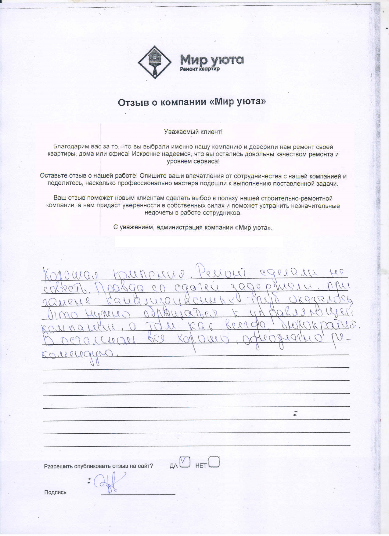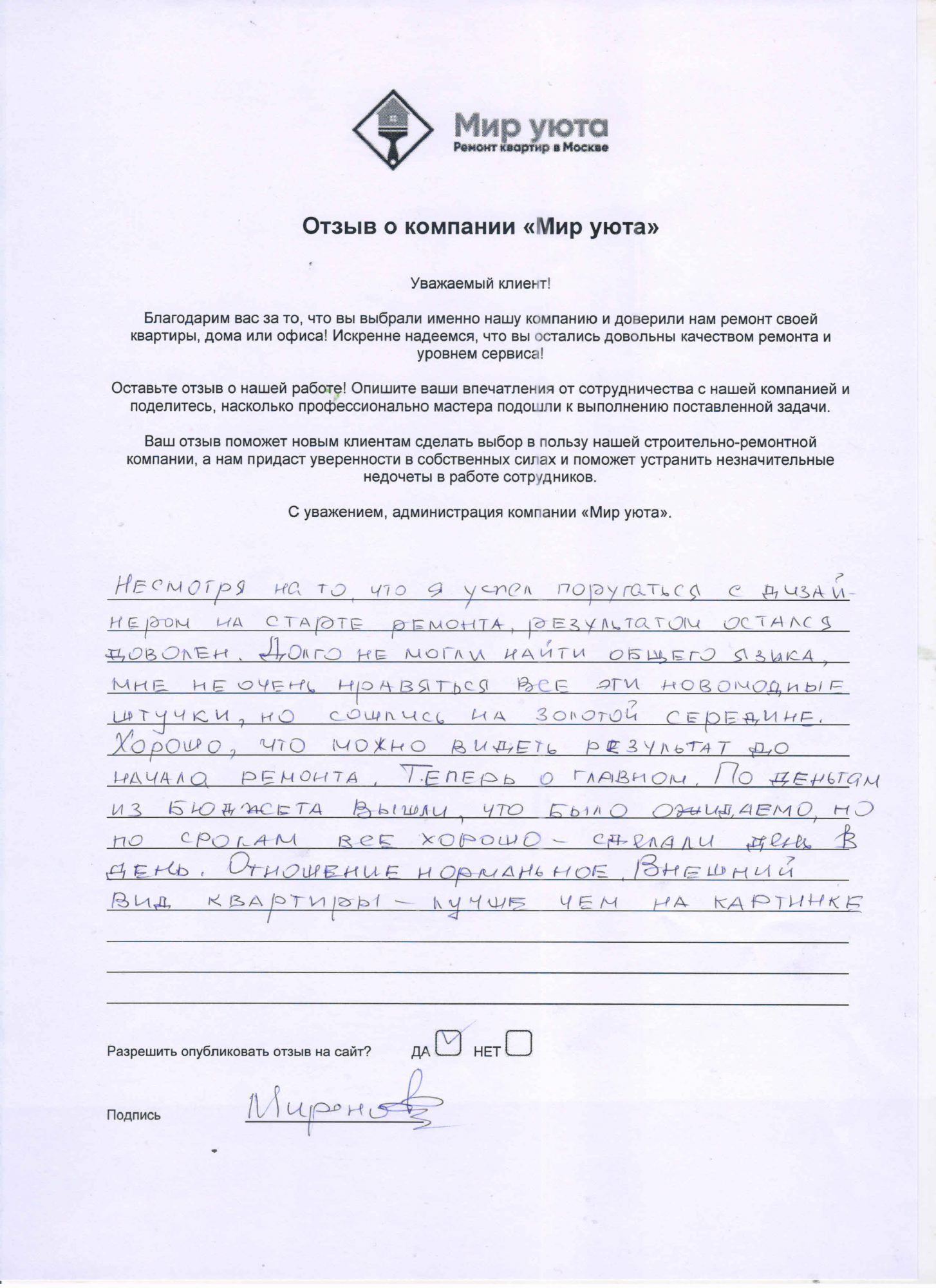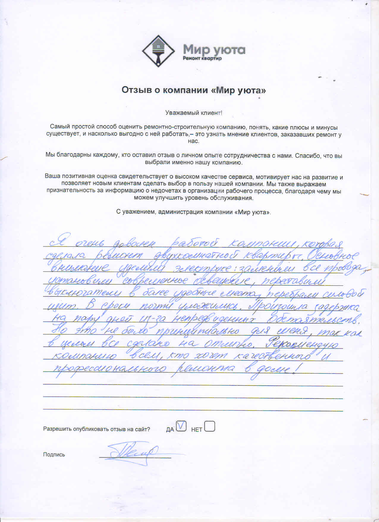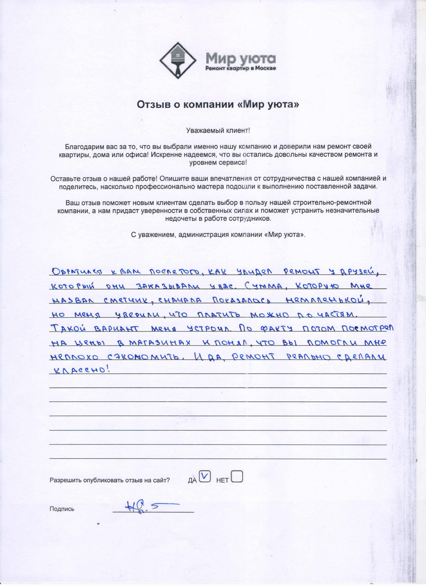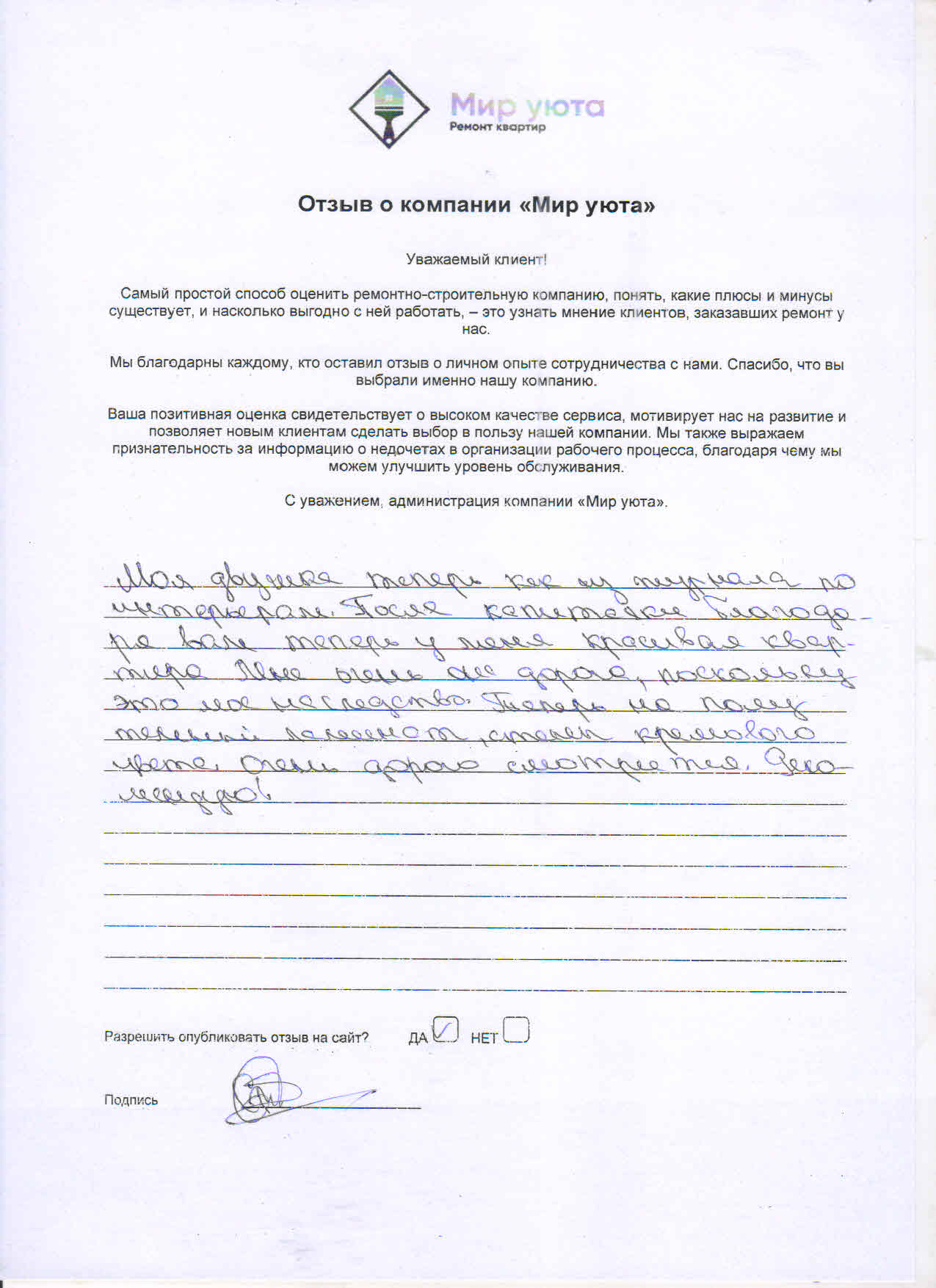 В данном разделе размещены отзывы наших клиентов, пожелавшим поделиться своими впечатлениями о качестве ремонта, профессионализме мастеров компании и уровне обслуживания. Мы еженедельно проводим опросы заказчиков, измеряя Индекс Удовлетворенности. Для нас важно мнение каждого, кто выбрал нашу ремонтно-строительную организацию в качестве исполнителя. Отзывы будут интересны и потенциальным заказчикам. Возможно, именно ваша оценка деятельности компании поможет потенциальным клиентам выбрать нас для выполнения будущего ремонта.