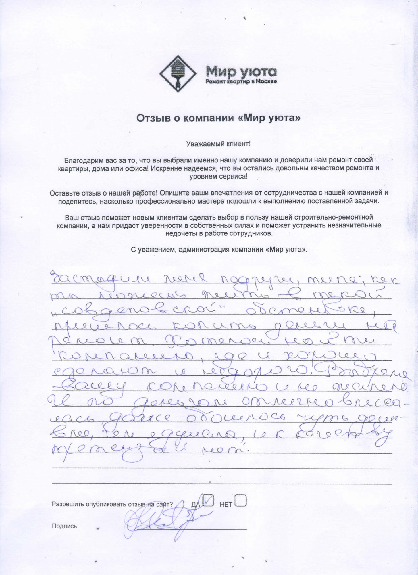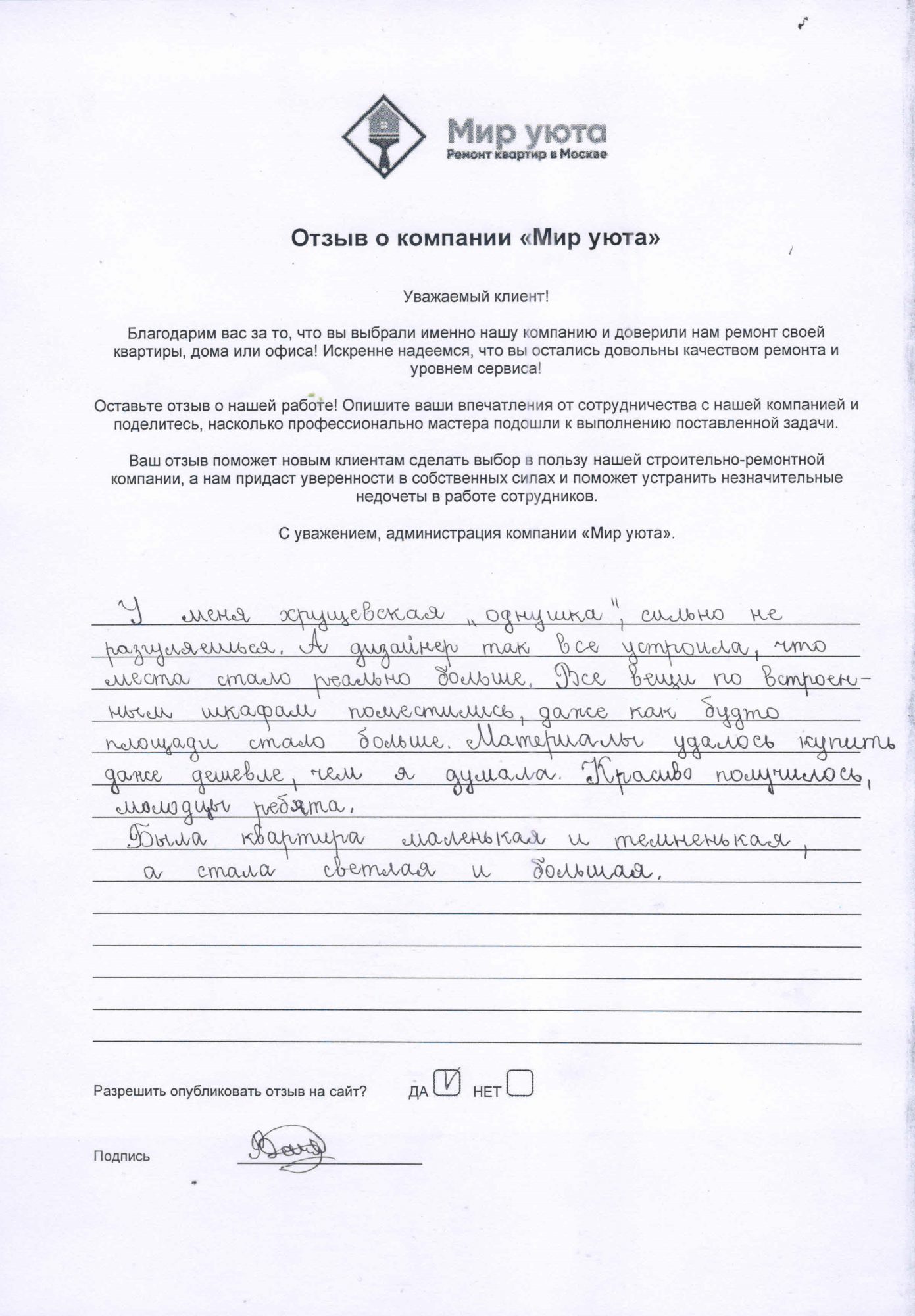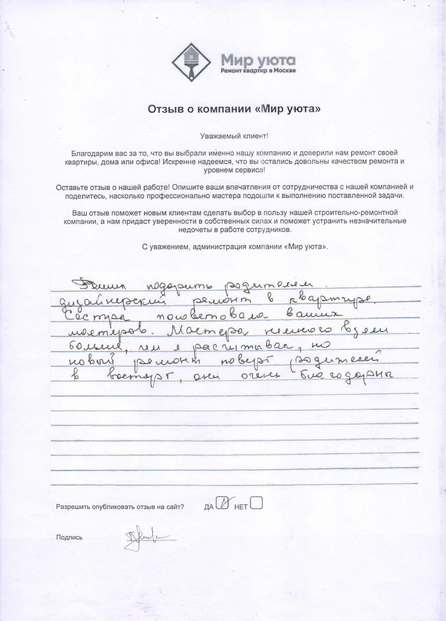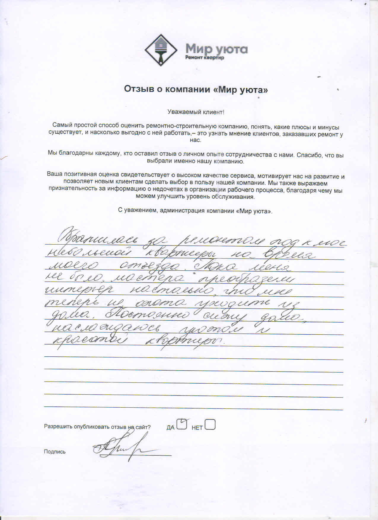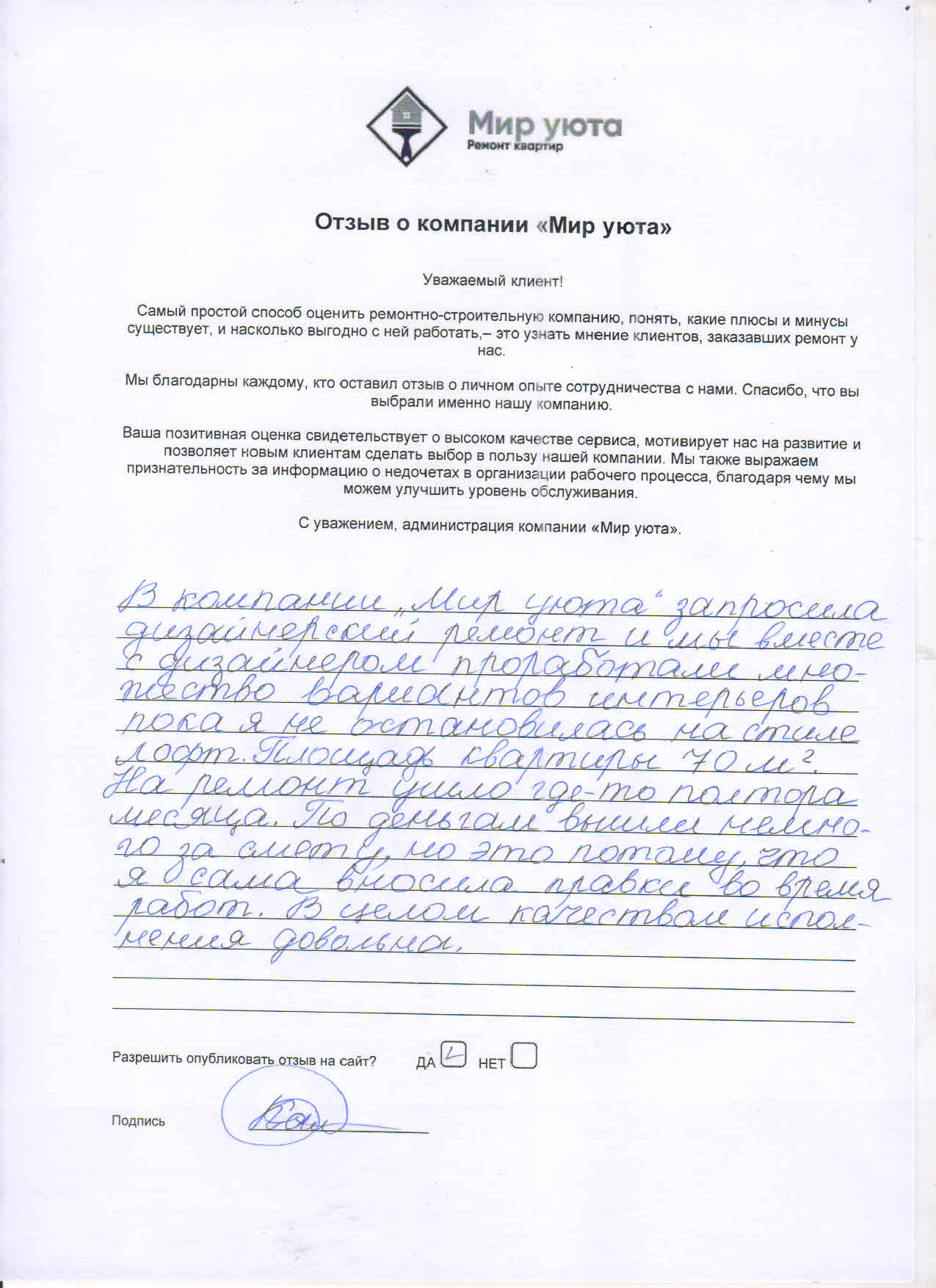 В данном разделе размещены отзывы наших клиентов, пожелавшим поделиться своими впечатлениями о качестве ремонта, профессионализме мастеров компании и уровне обслуживания. Мы еженедельно проводим опросы заказчиков, измеряя Индекс Удовлетворенности. Для нас важно мнение каждого, кто выбрал нашу ремонтно-строительную организацию в качестве исполнителя. Отзывы будут интересны и потенциальным заказчикам. Возможно, именно ваша оценка деятельности компании поможет потенциальным клиентам выбрать нас для выполнения будущего ремонта.