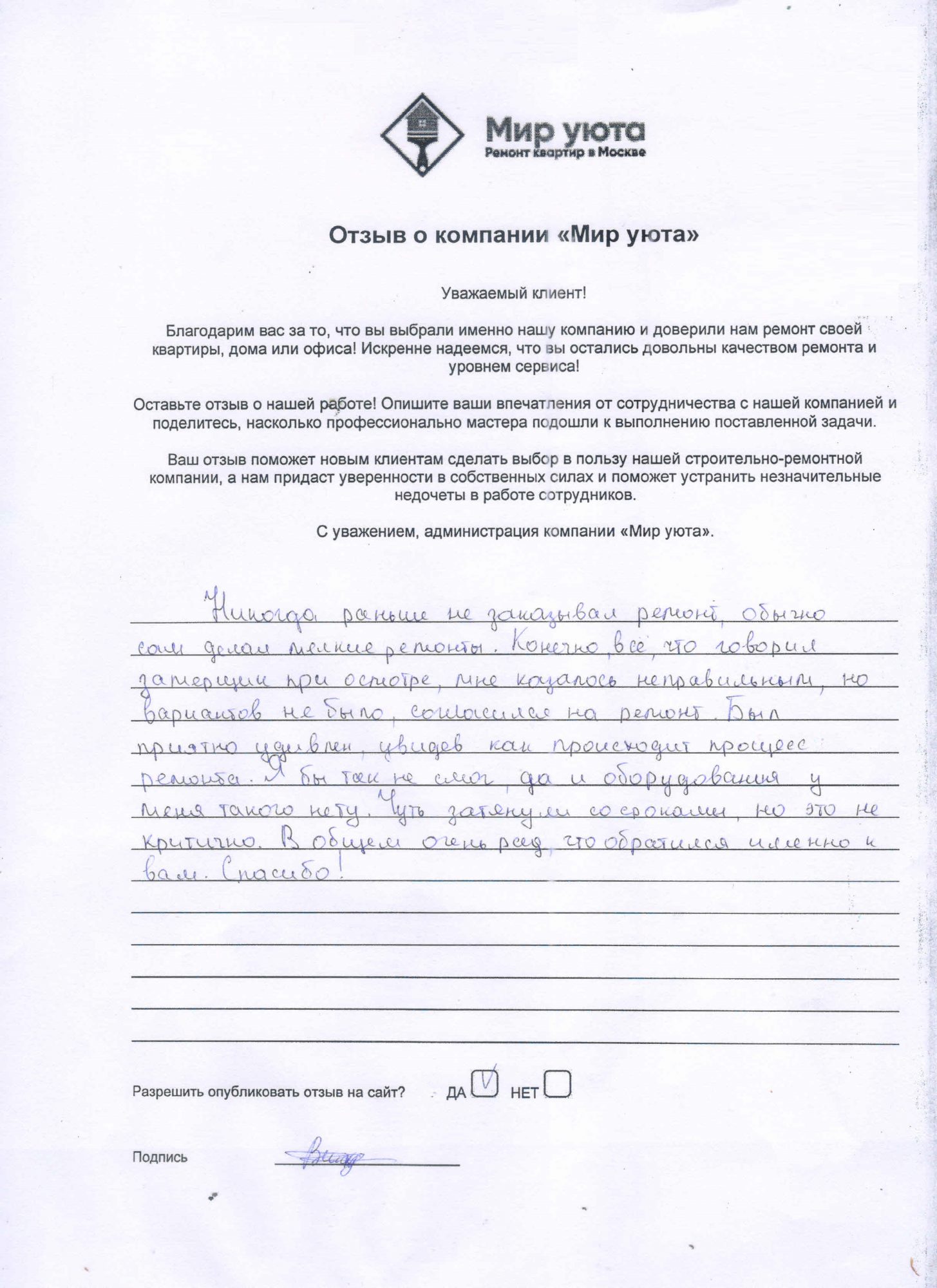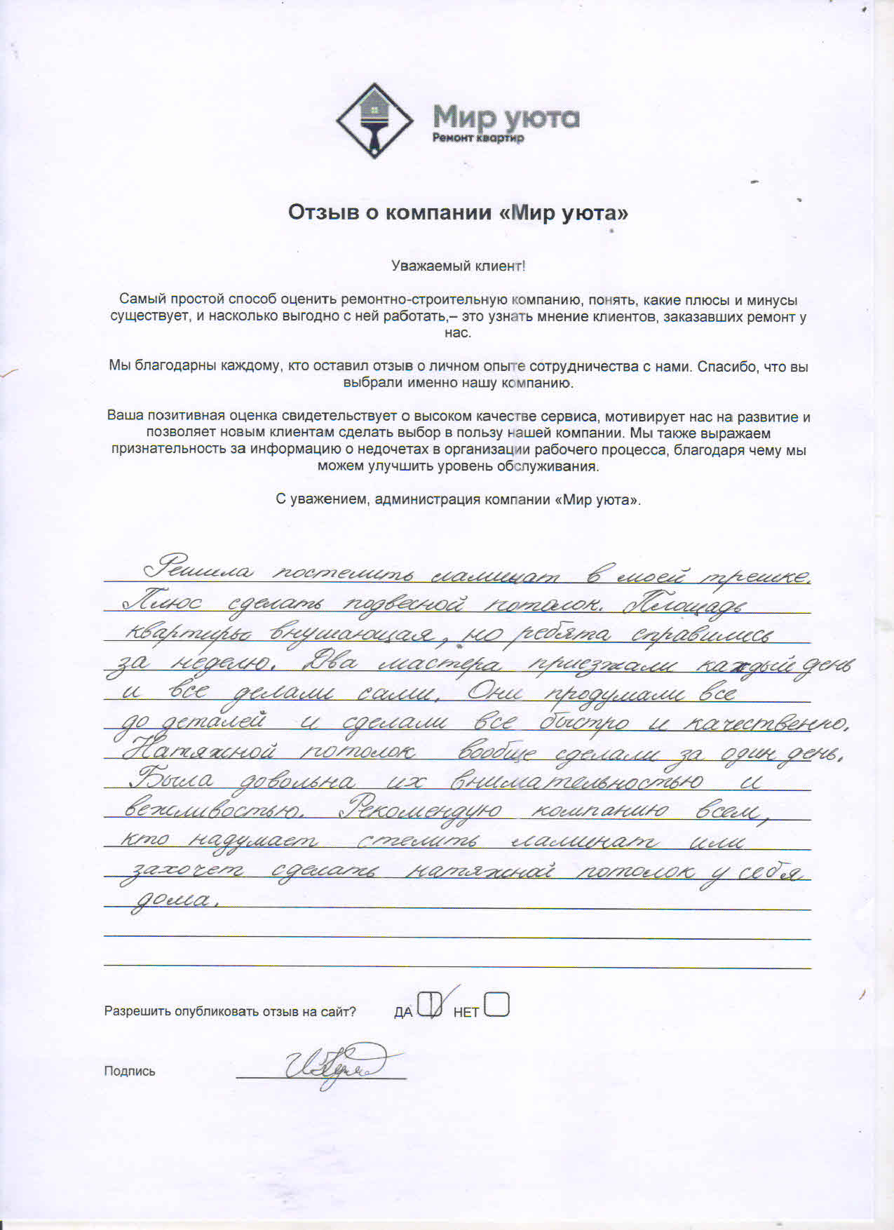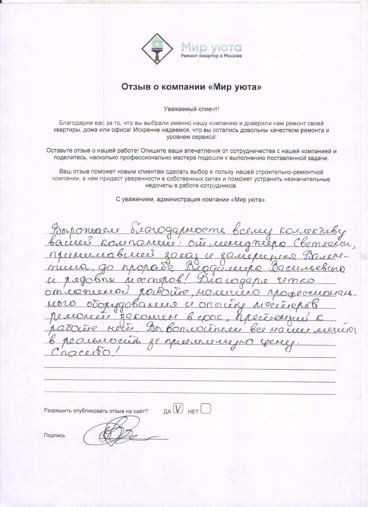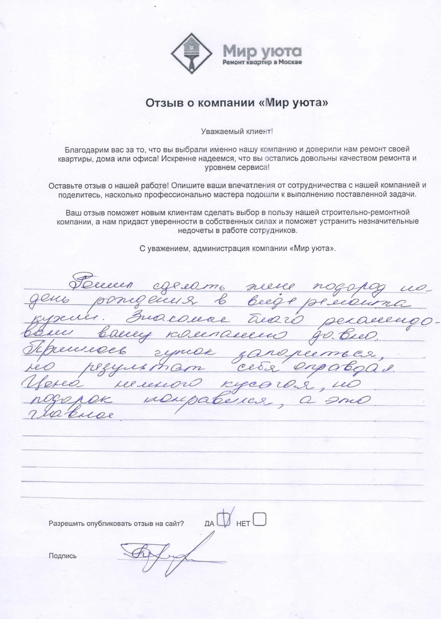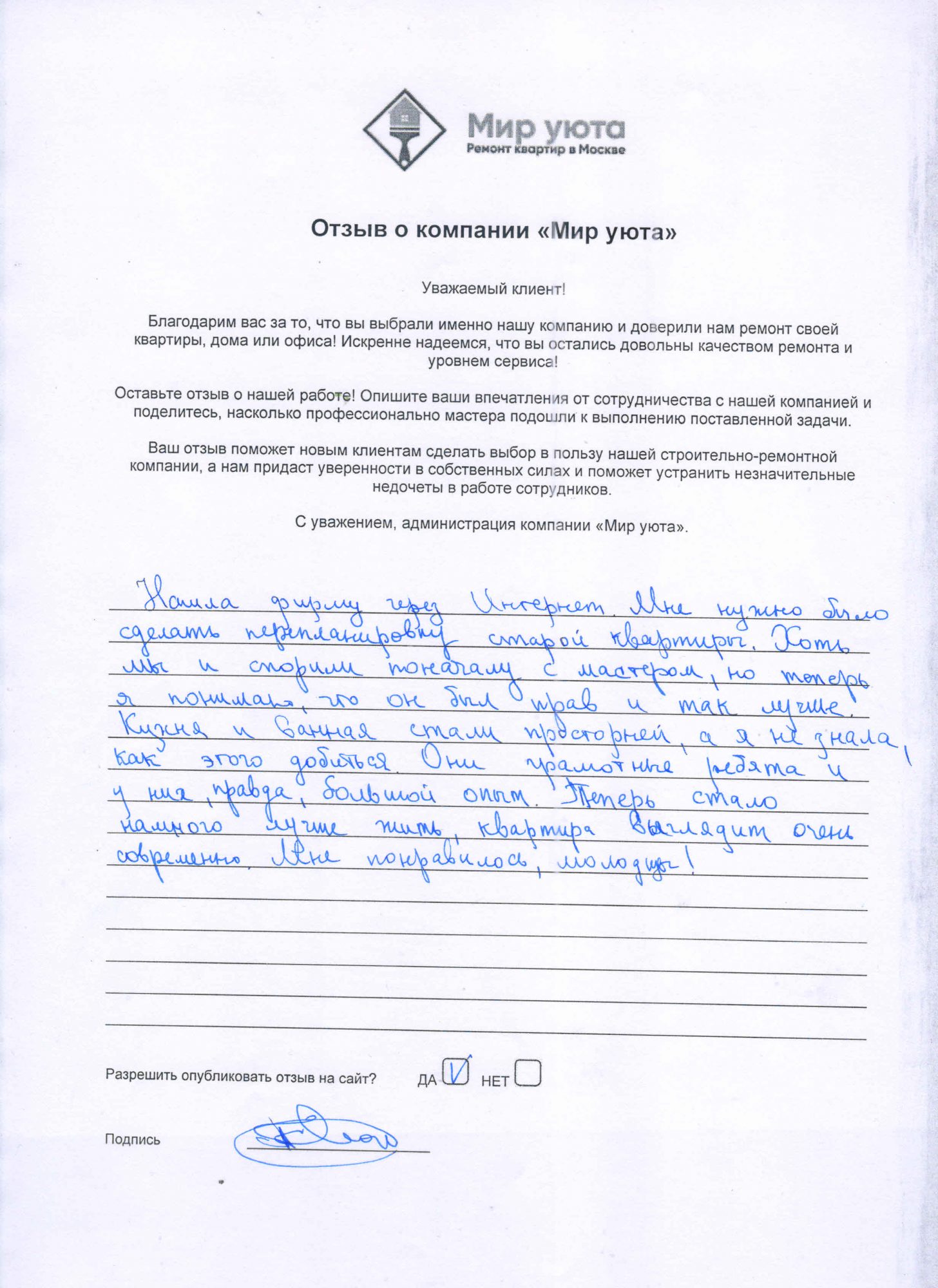 В данном разделе размещены отзывы наших клиентов, пожелавшим поделиться своими впечатлениями о качестве ремонта, профессионализме мастеров компании и уровне обслуживания. Мы еженедельно проводим опросы заказчиков, измеряя Индекс Удовлетворенности. Для нас важно мнение каждого, кто выбрал нашу ремонтно-строительную организацию в качестве исполнителя. Отзывы будут интересны и потенциальным заказчикам. Возможно, именно ваша оценка деятельности компании поможет потенциальным клиентам выбрать нас для выполнения будущего ремонта.