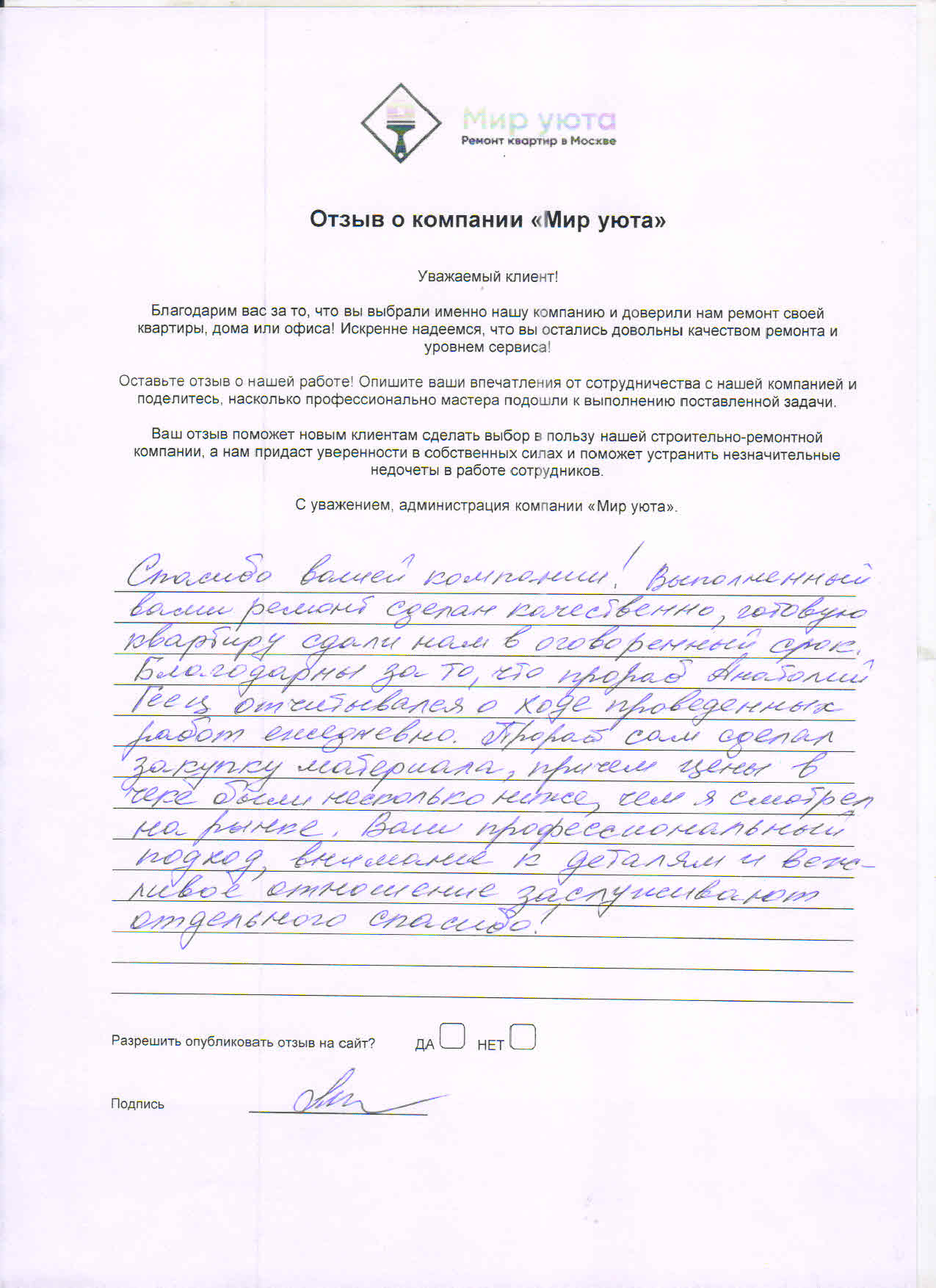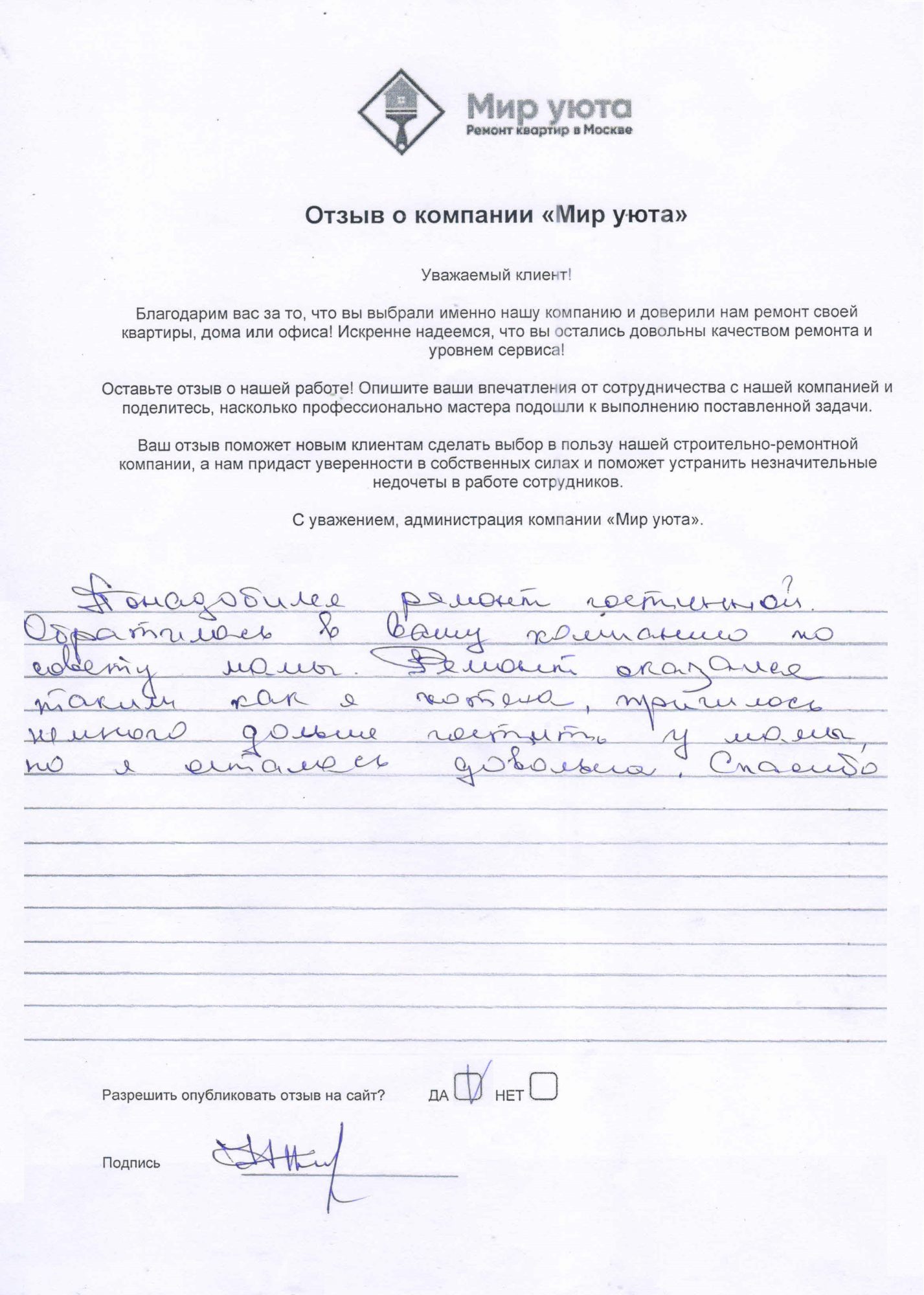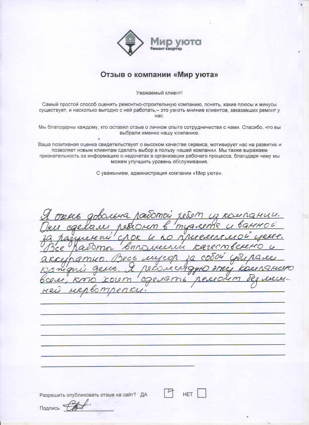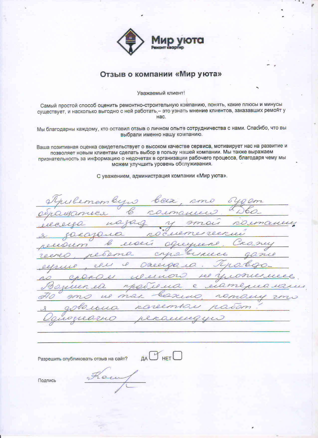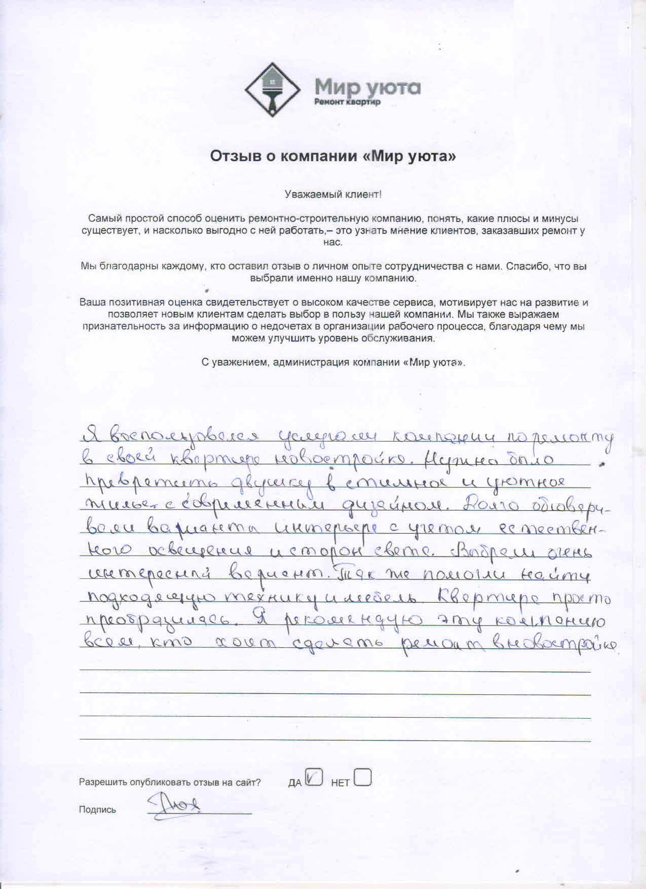 В данном разделе размещены отзывы наших клиентов, пожелавшим поделиться своими впечатлениями о качестве ремонта, профессионализме мастеров компании и уровне обслуживания. Мы еженедельно проводим опросы заказчиков, измеряя Индекс Удовлетворенности. Для нас важно мнение каждого, кто выбрал нашу ремонтно-строительную организацию в качестве исполнителя. Отзывы будут интересны и потенциальным заказчикам. Возможно, именно ваша оценка деятельности компании поможет потенциальным клиентам выбрать нас для выполнения будущего ремонта.