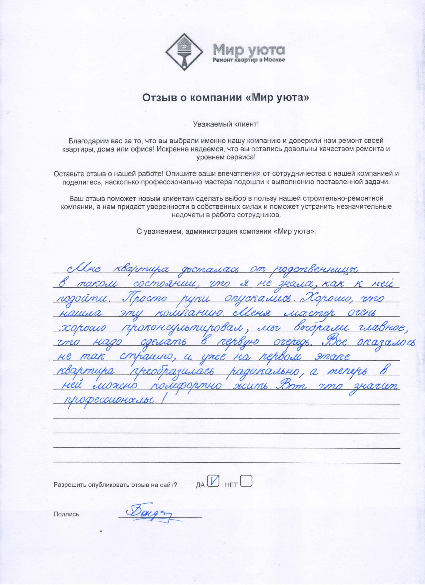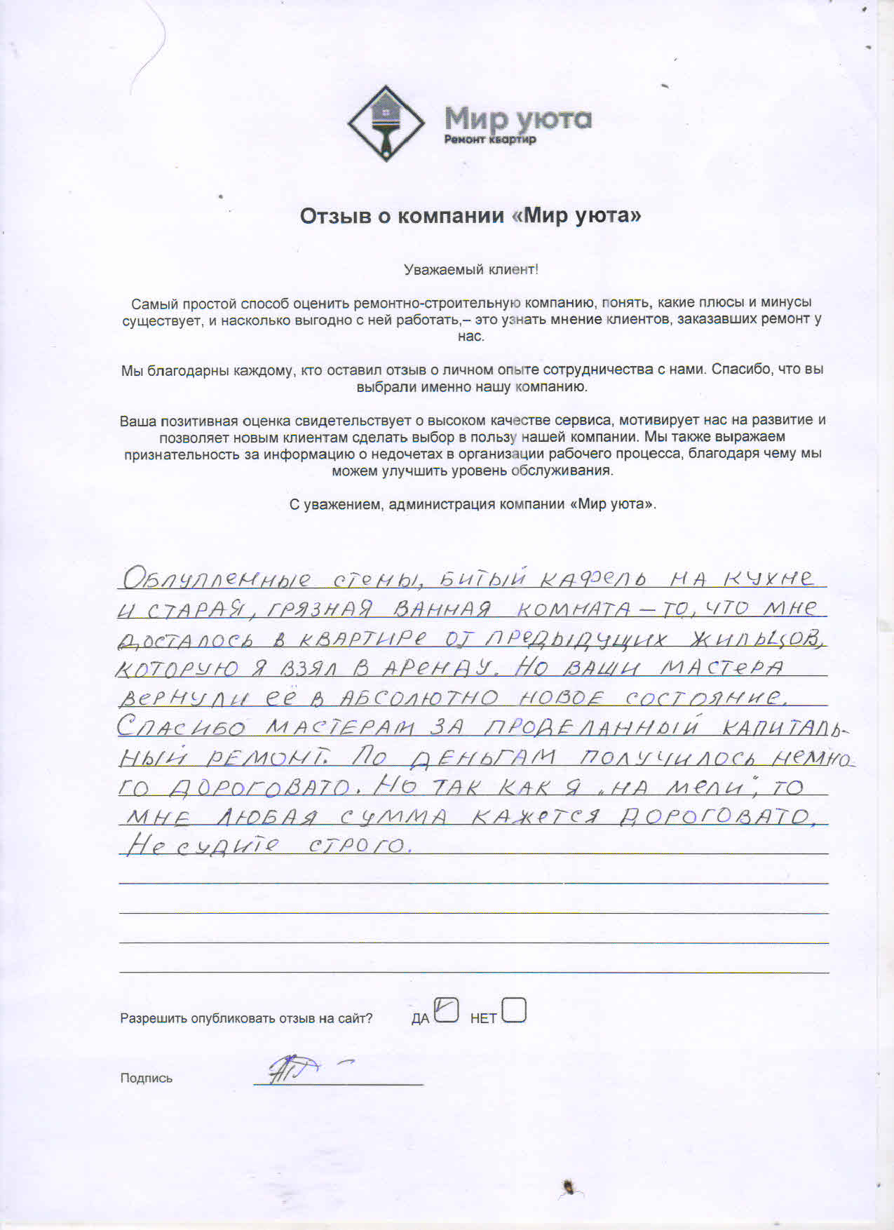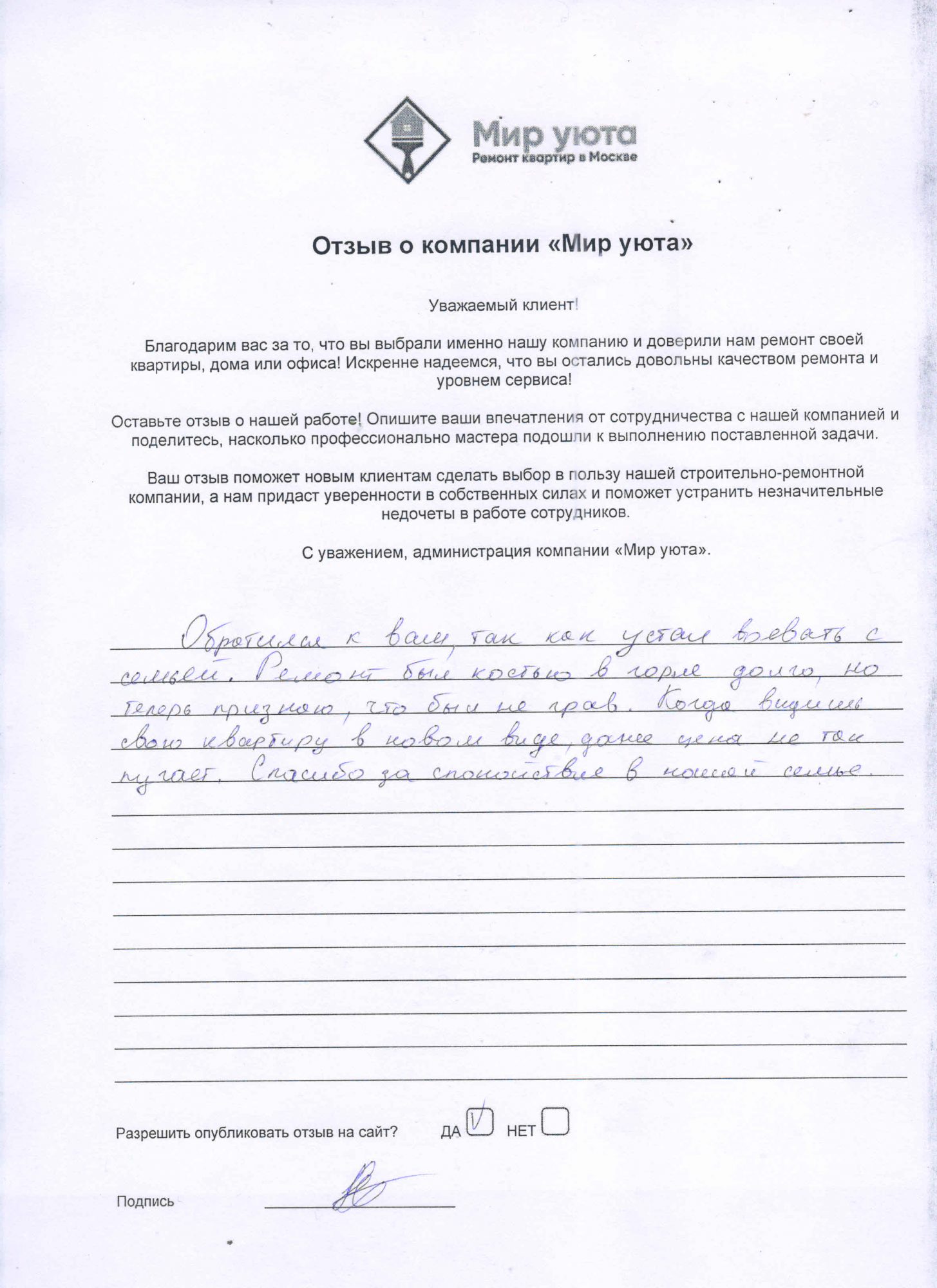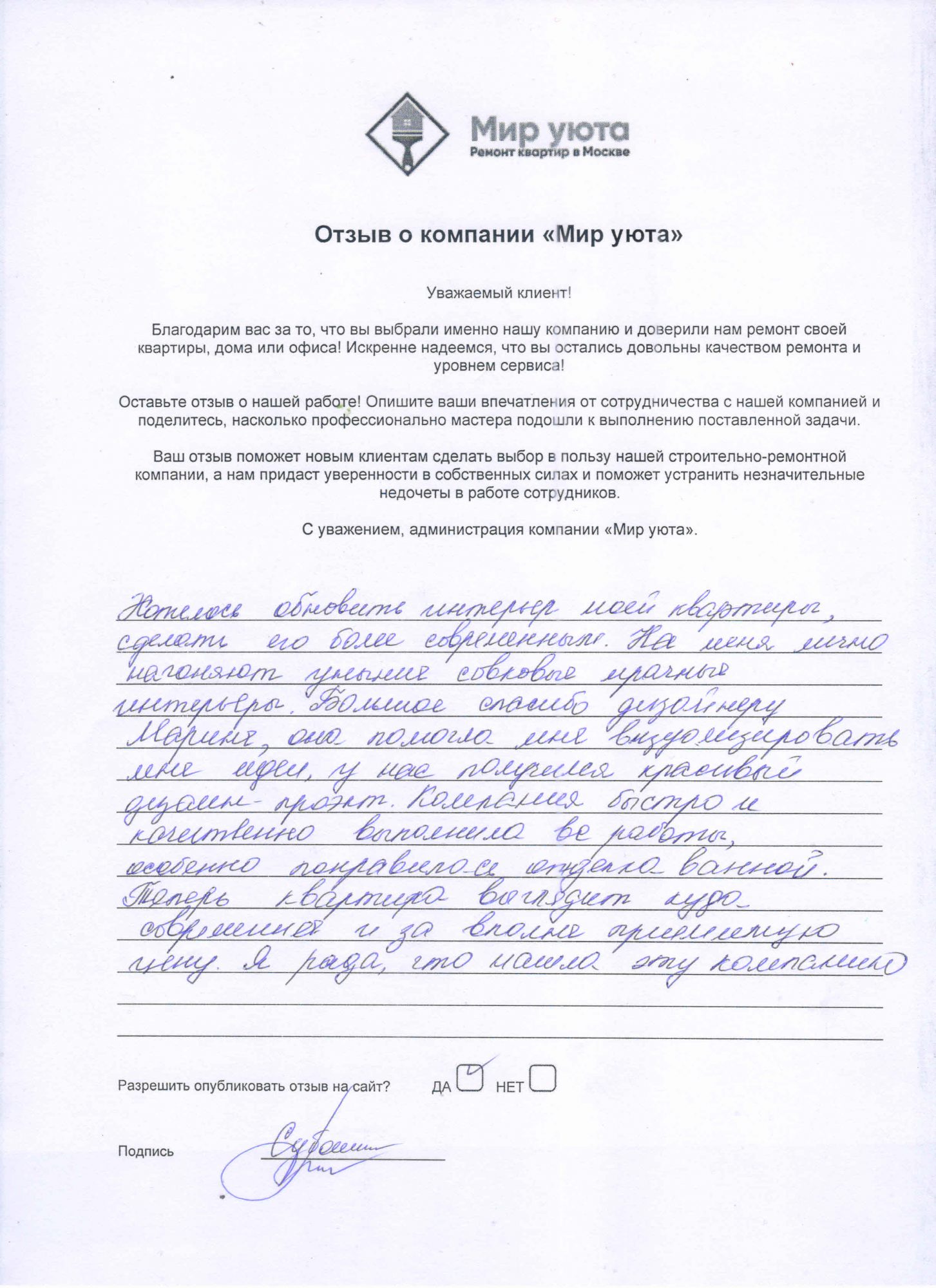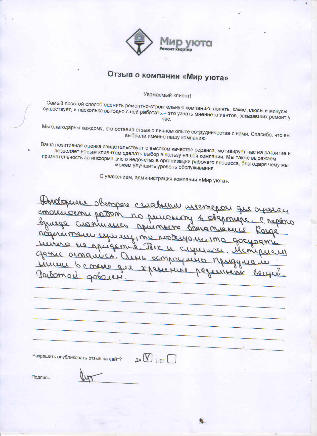 В данном разделе размещены отзывы наших клиентов, пожелавшим поделиться своими впечатлениями о качестве ремонта, профессионализме мастеров компании и уровне обслуживания. Мы еженедельно проводим опросы заказчиков, измеряя Индекс Удовлетворенности. Для нас важно мнение каждого, кто выбрал нашу ремонтно-строительную организацию в качестве исполнителя. Отзывы будут интересны и потенциальным заказчикам. Возможно, именно ваша оценка деятельности компании поможет потенциальным клиентам выбрать нас для выполнения будущего ремонта.