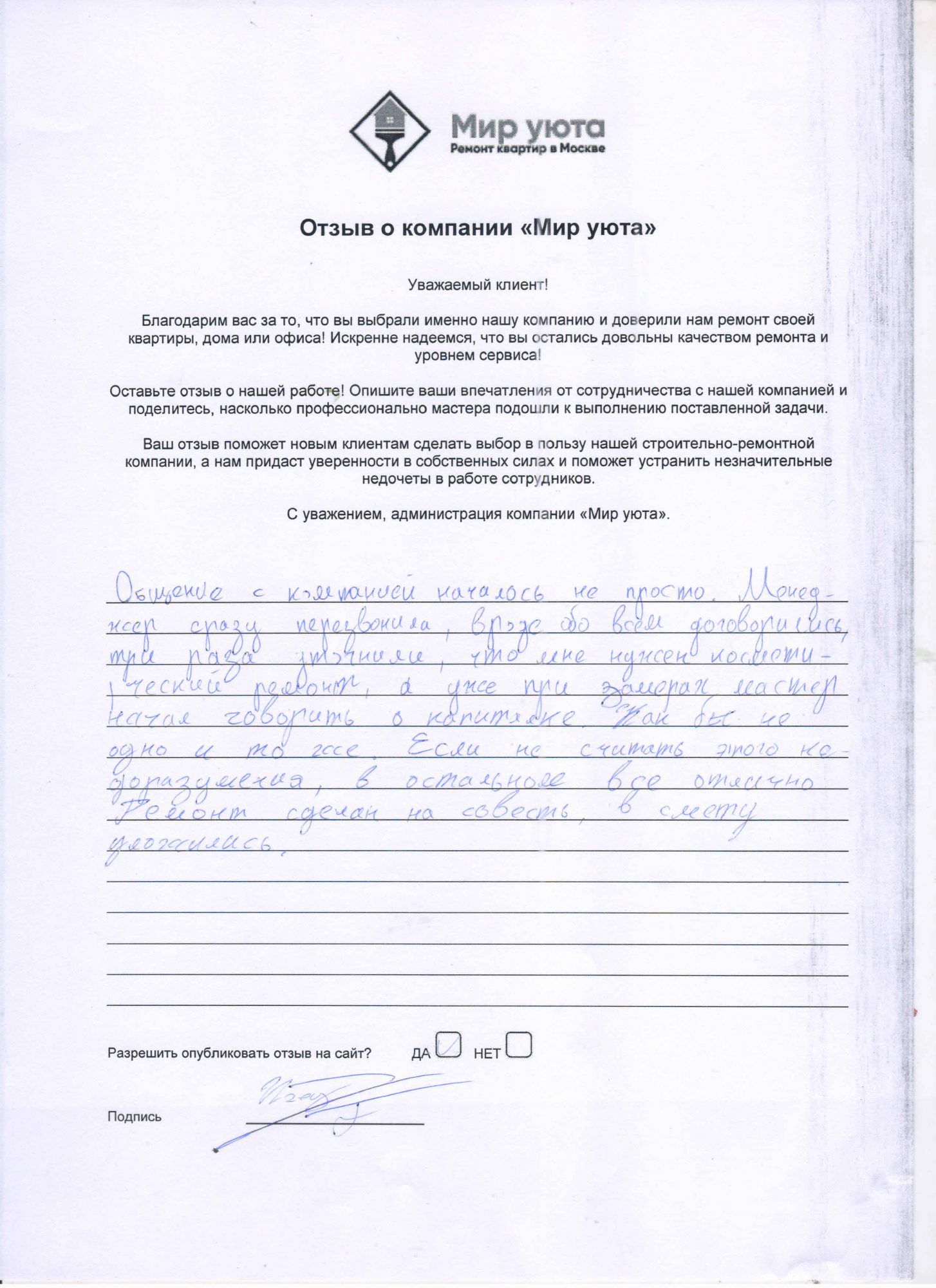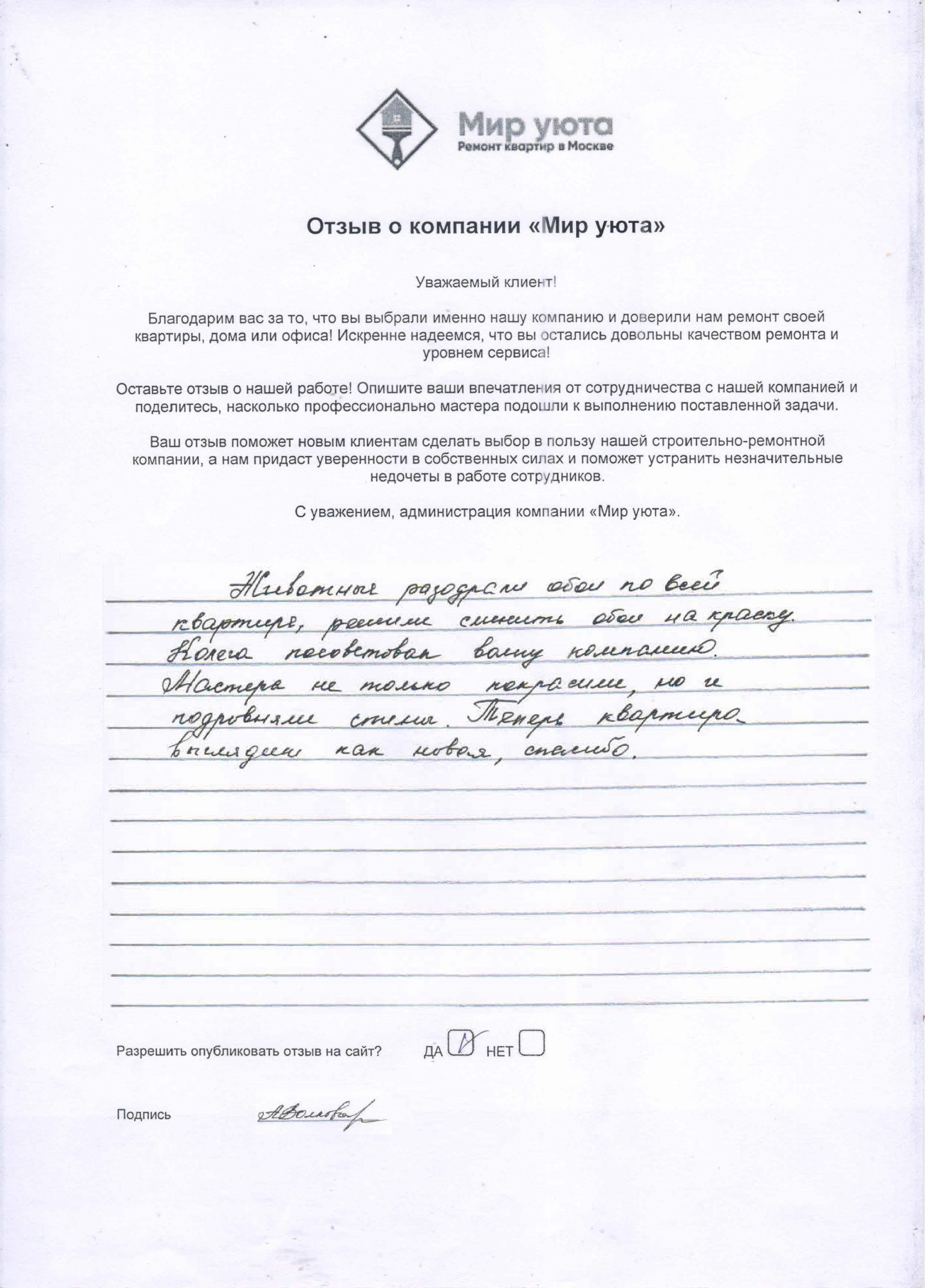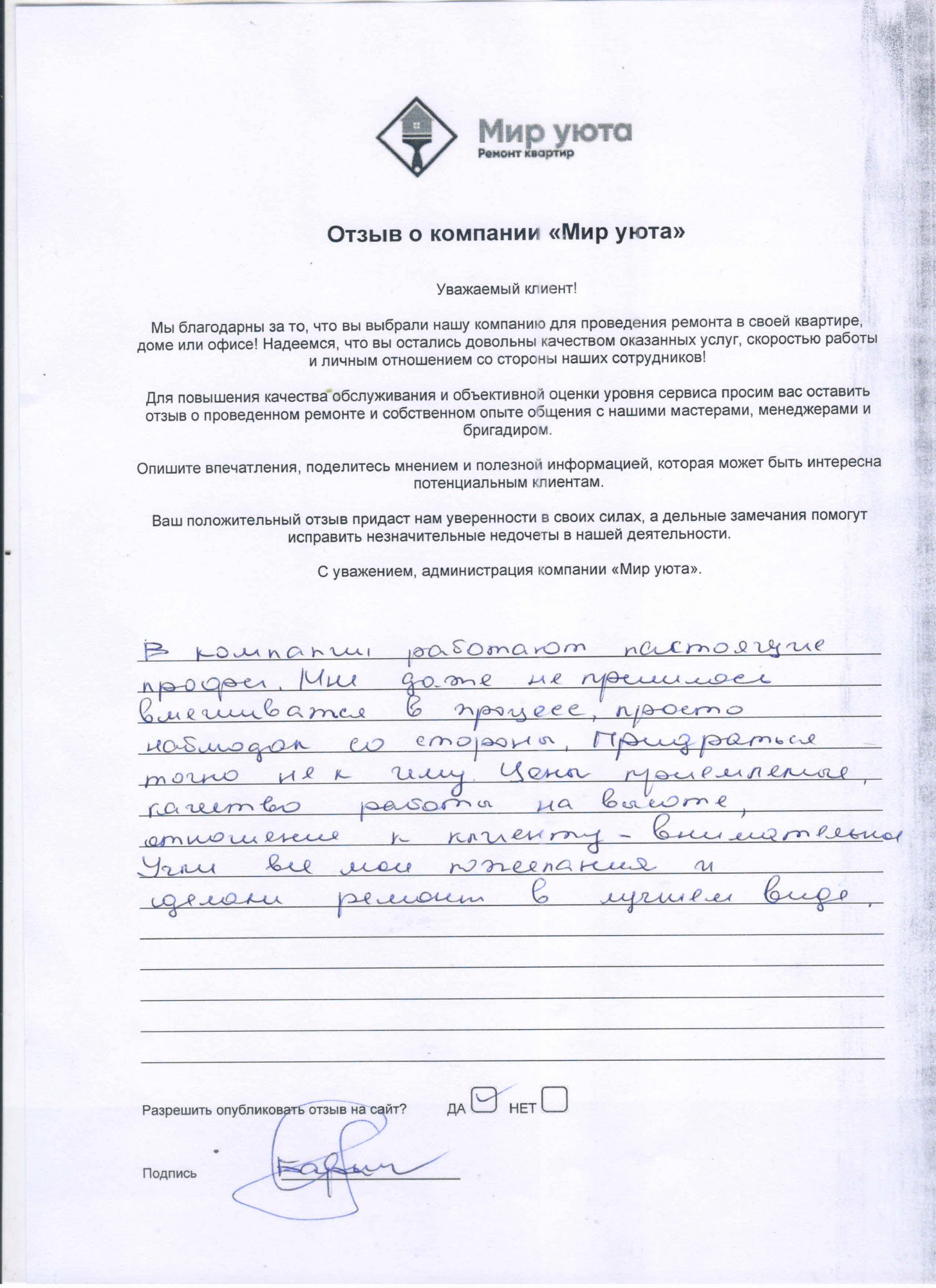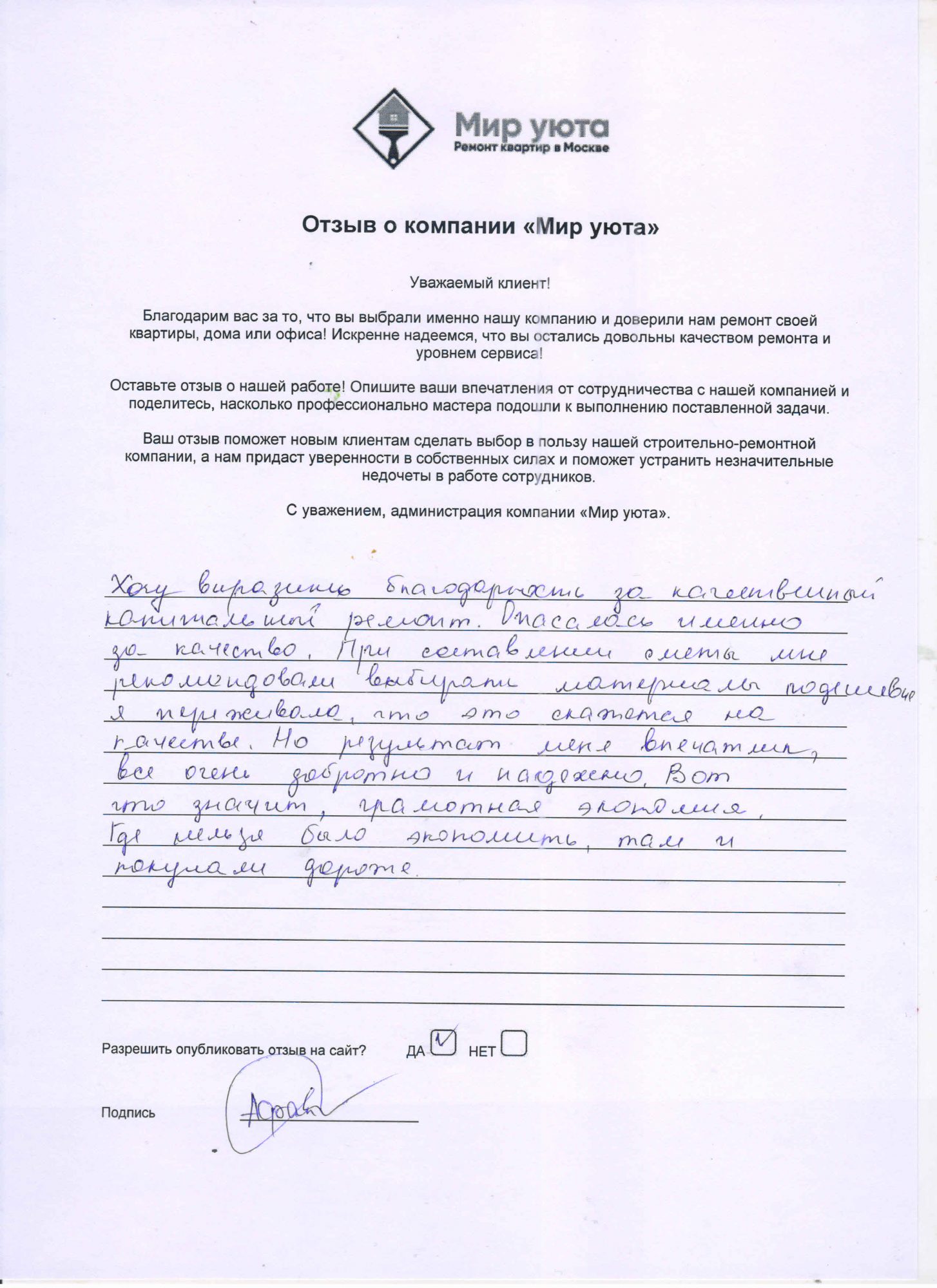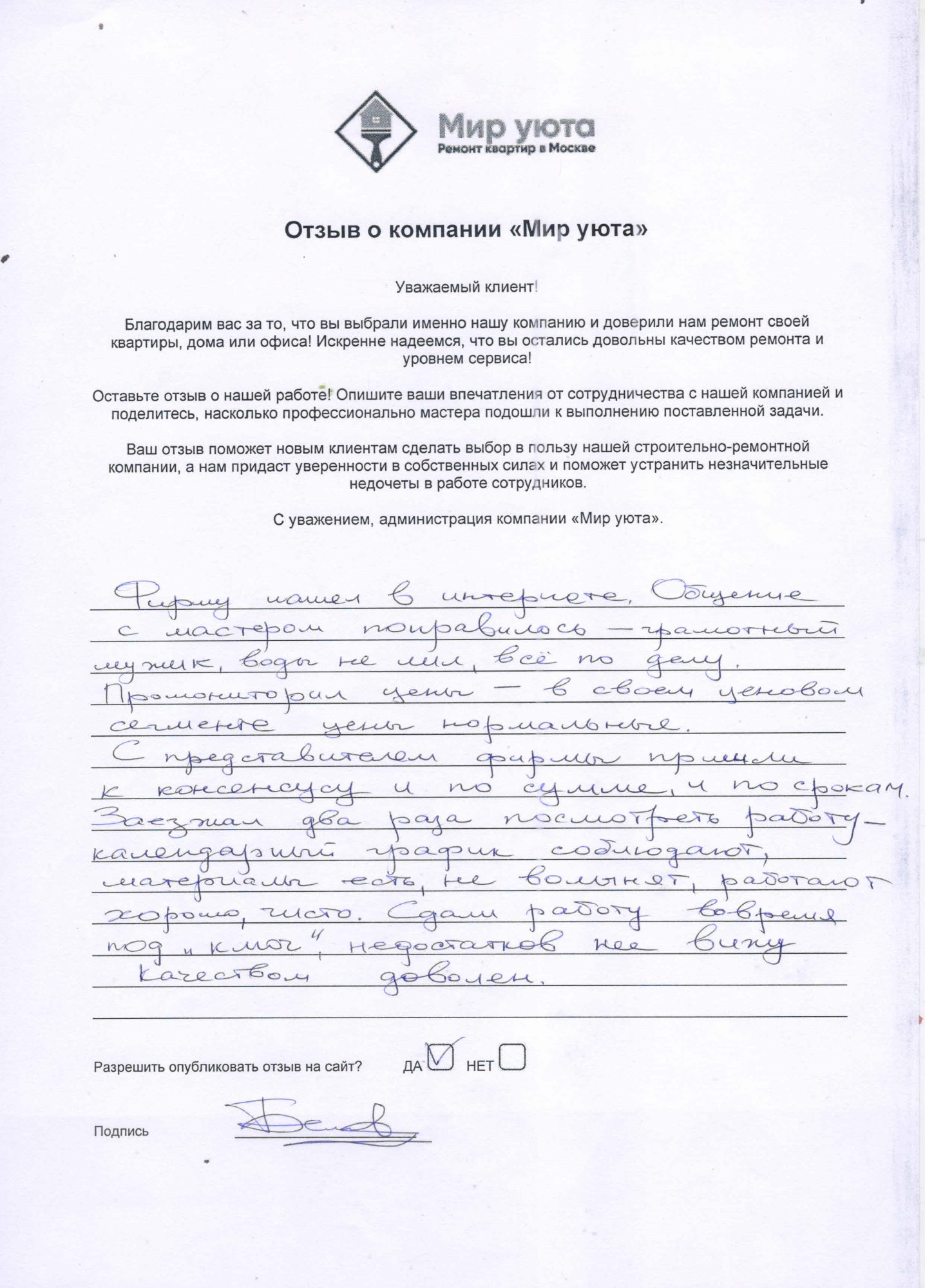 В данном разделе размещены отзывы наших клиентов, пожелавшим поделиться своими впечатлениями о качестве ремонта, профессионализме мастеров компании и уровне обслуживания. Мы еженедельно проводим опросы заказчиков, измеряя Индекс Удовлетворенности. Для нас важно мнение каждого, кто выбрал нашу ремонтно-строительную организацию в качестве исполнителя. Отзывы будут интересны и потенциальным заказчикам. Возможно, именно ваша оценка деятельности компании поможет потенциальным клиентам выбрать нас для выполнения будущего ремонта.