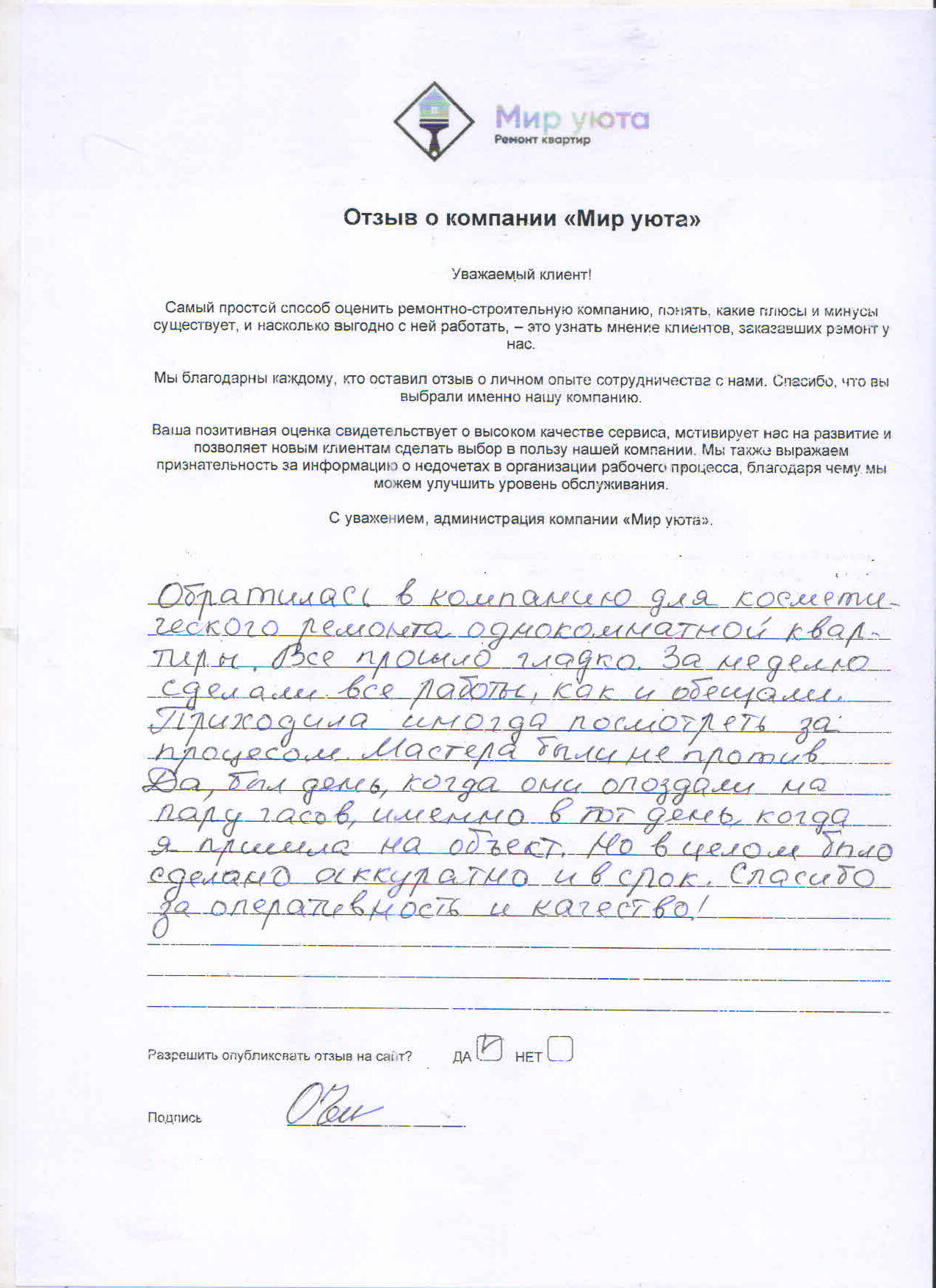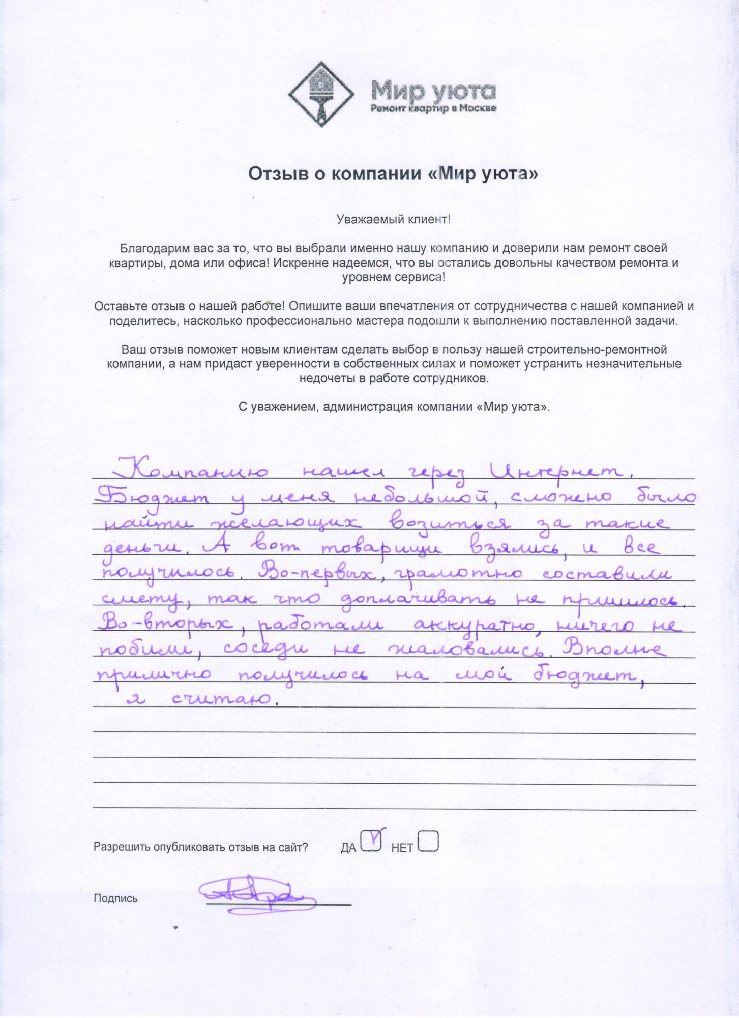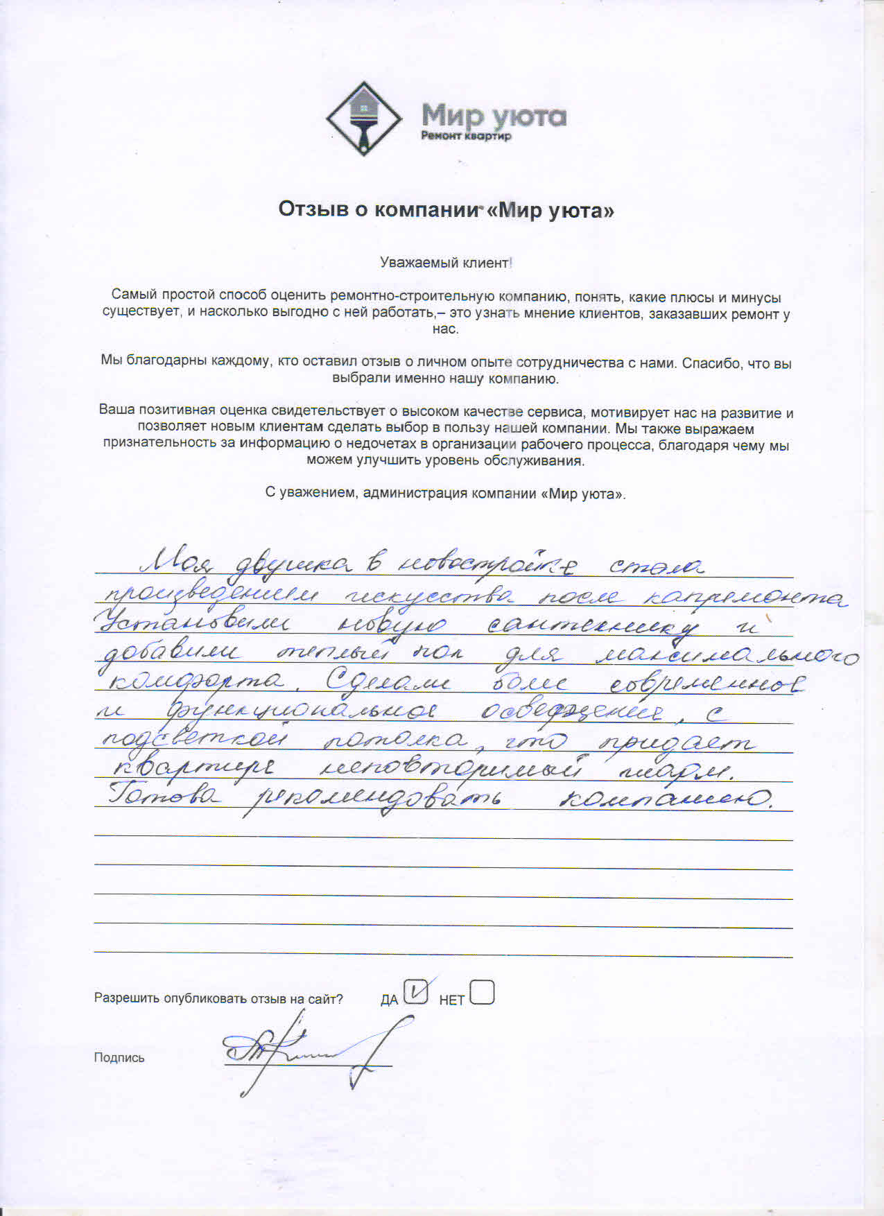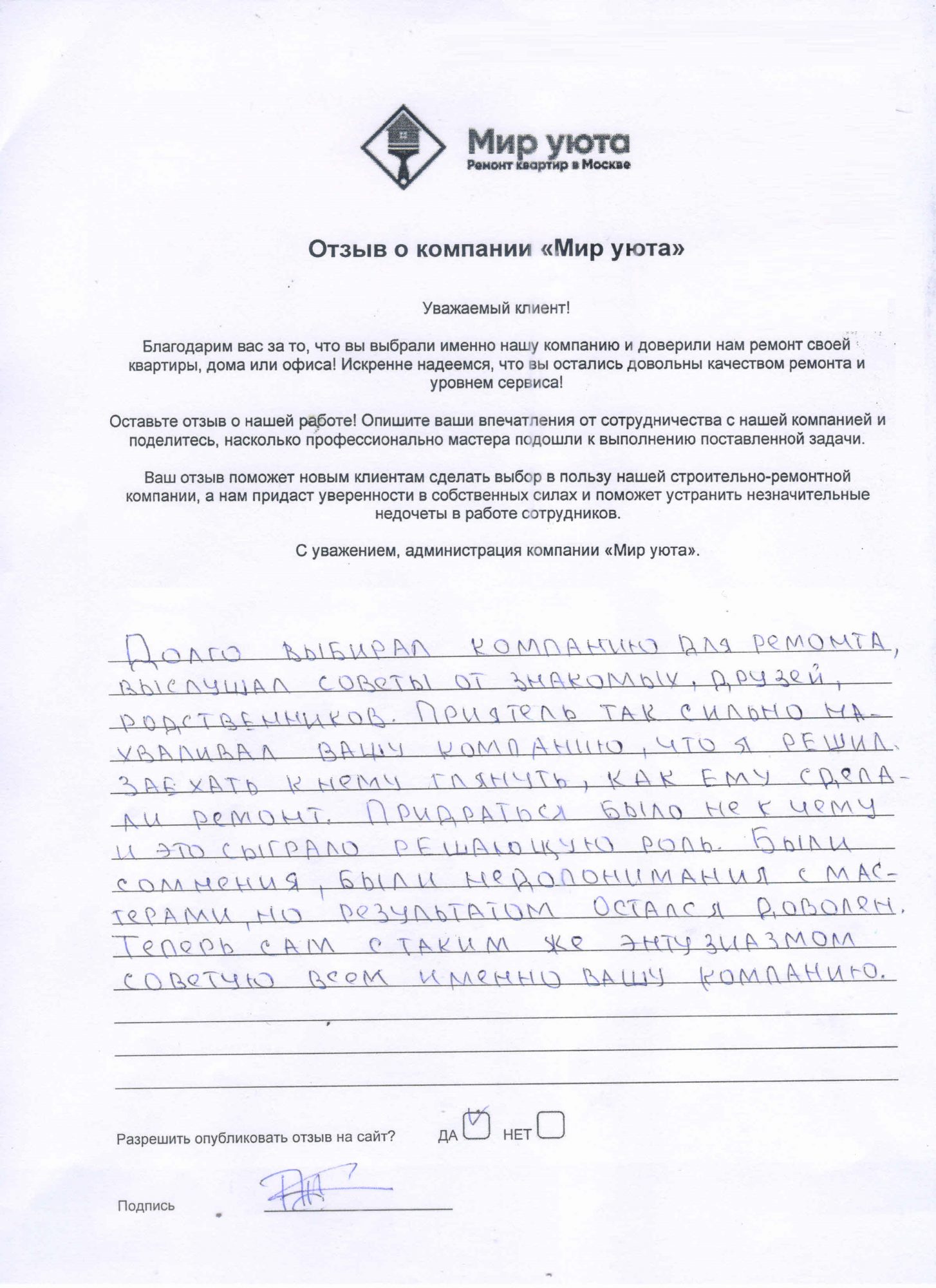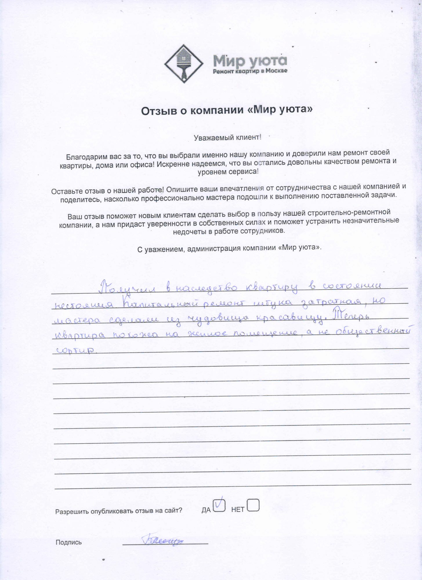 В данном разделе размещены отзывы наших клиентов, пожелавшим поделиться своими впечатлениями о качестве ремонта, профессионализме мастеров компании и уровне обслуживания. Мы еженедельно проводим опросы заказчиков, измеряя Индекс Удовлетворенности. Для нас важно мнение каждого, кто выбрал нашу ремонтно-строительную организацию в качестве исполнителя. Отзывы будут интересны и потенциальным заказчикам. Возможно, именно ваша оценка деятельности компании поможет потенциальным клиентам выбрать нас для выполнения будущего ремонта.