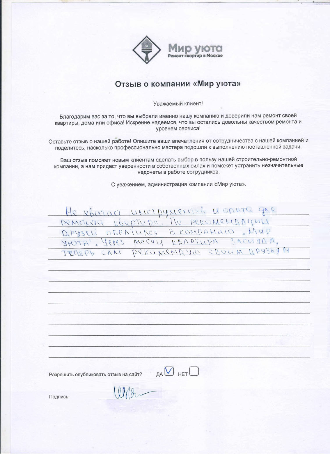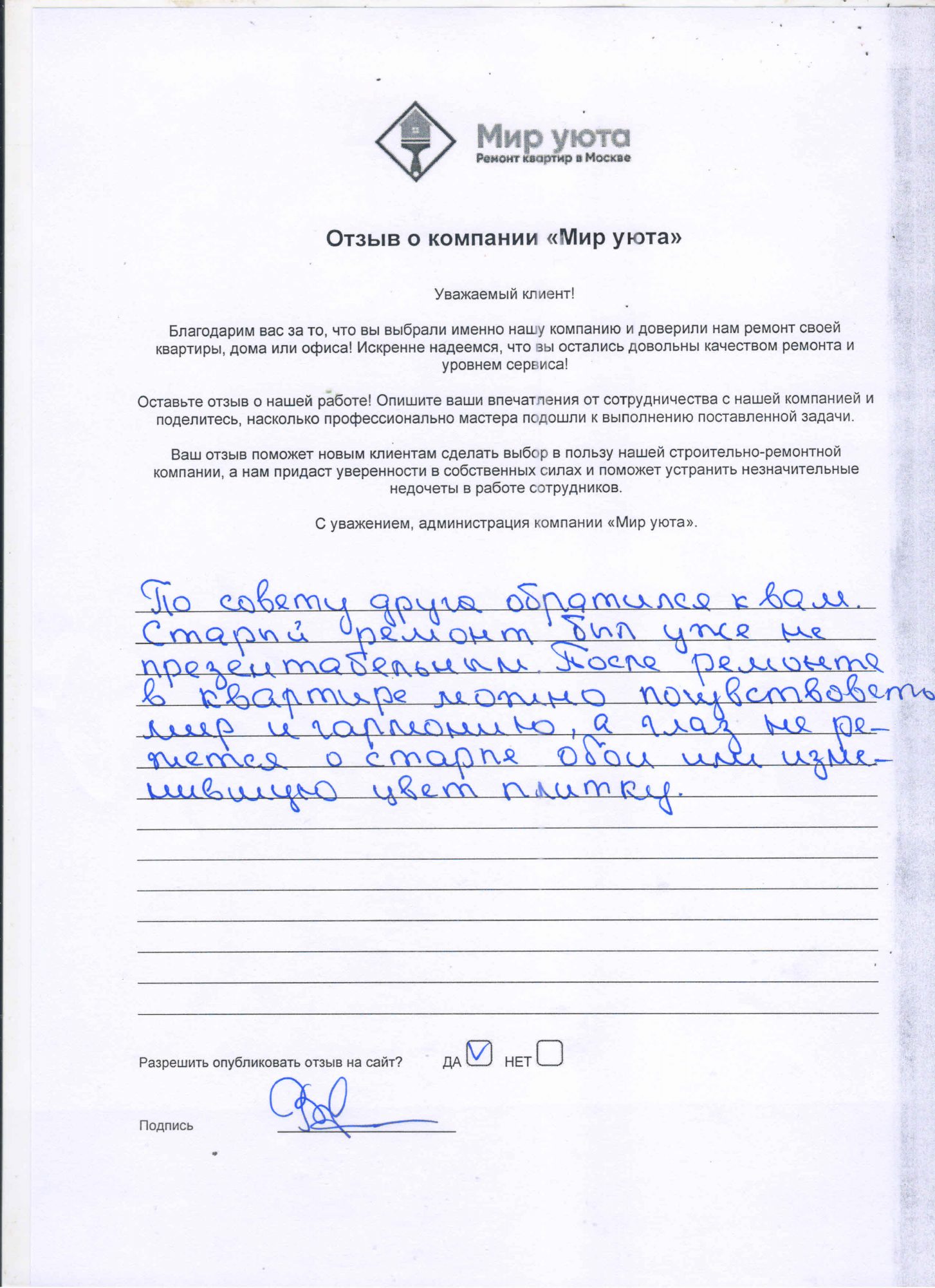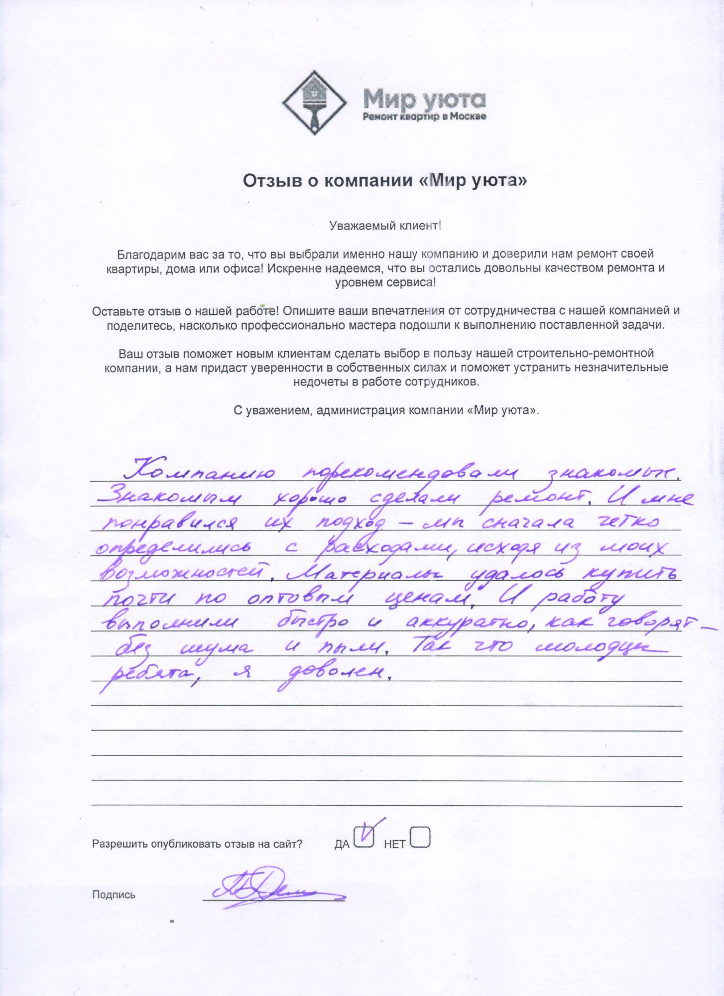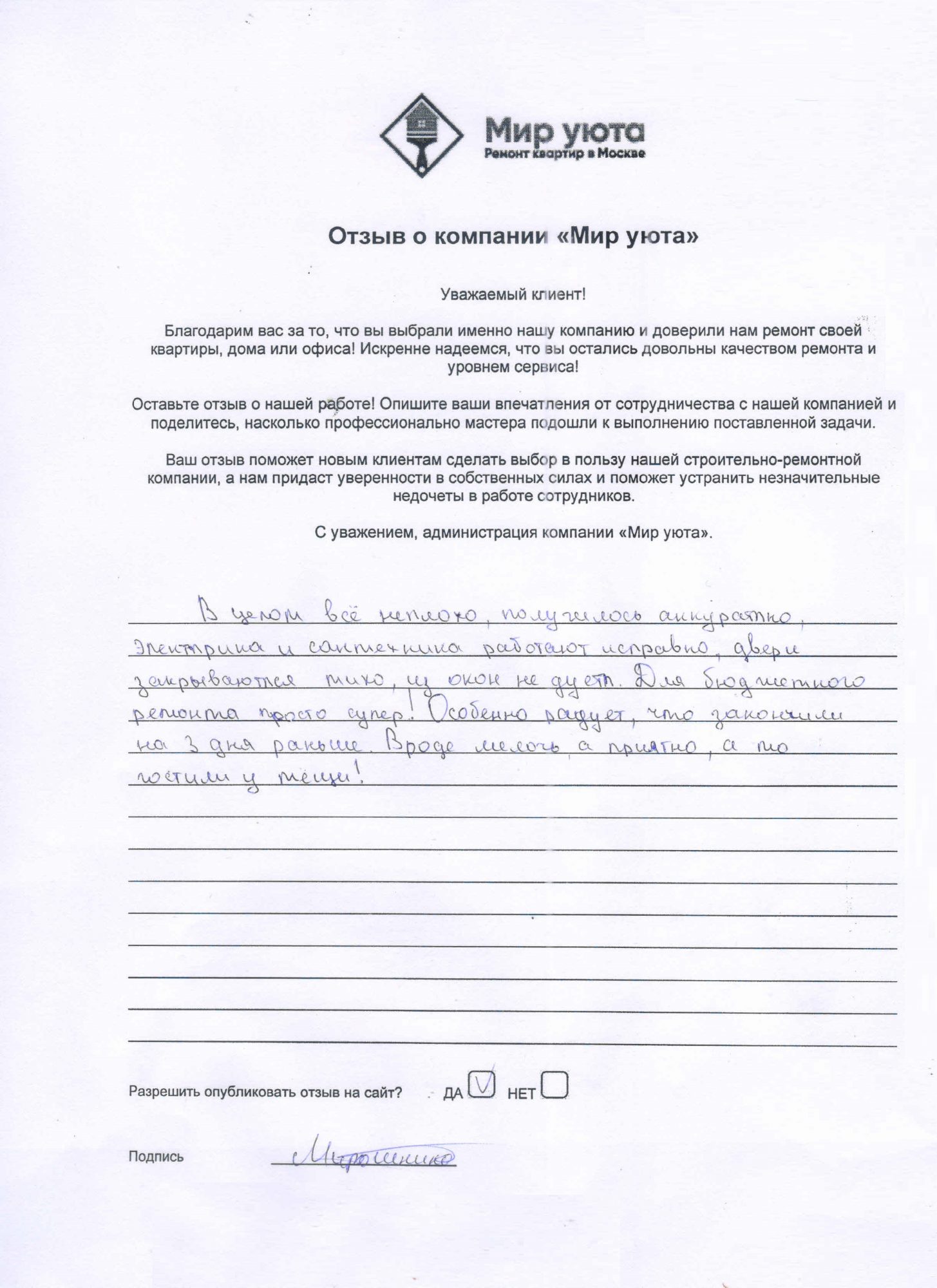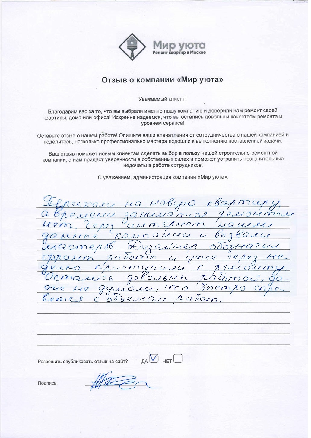 В данном разделе размещены отзывы наших клиентов, пожелавшим поделиться своими впечатлениями о качестве ремонта, профессионализме мастеров компании и уровне обслуживания. Мы еженедельно проводим опросы заказчиков, измеряя Индекс Удовлетворенности. Для нас важно мнение каждого, кто выбрал нашу ремонтно-строительную организацию в качестве исполнителя. Отзывы будут интересны и потенциальным заказчикам. Возможно, именно ваша оценка деятельности компании поможет потенциальным клиентам выбрать нас для выполнения будущего ремонта.