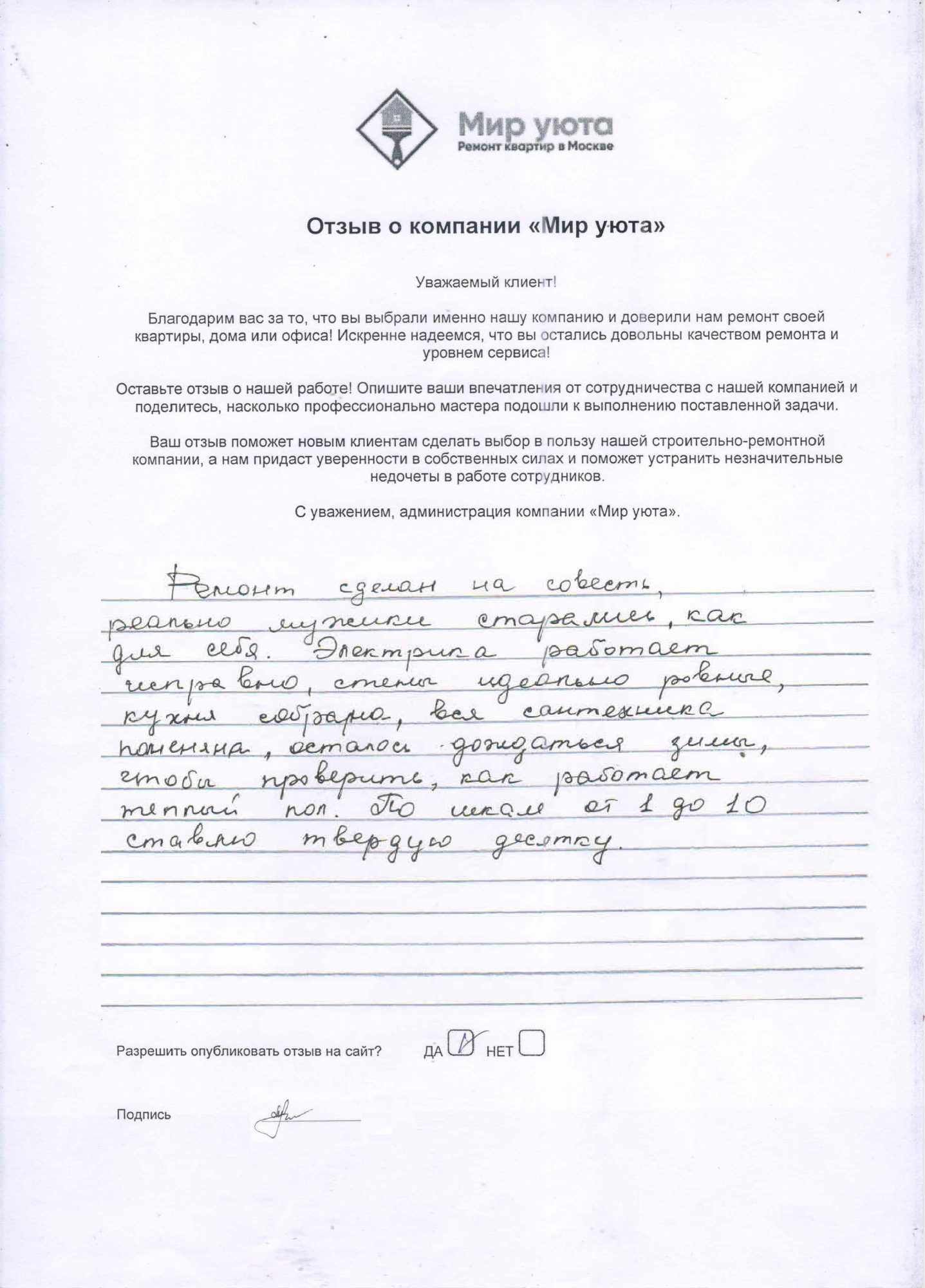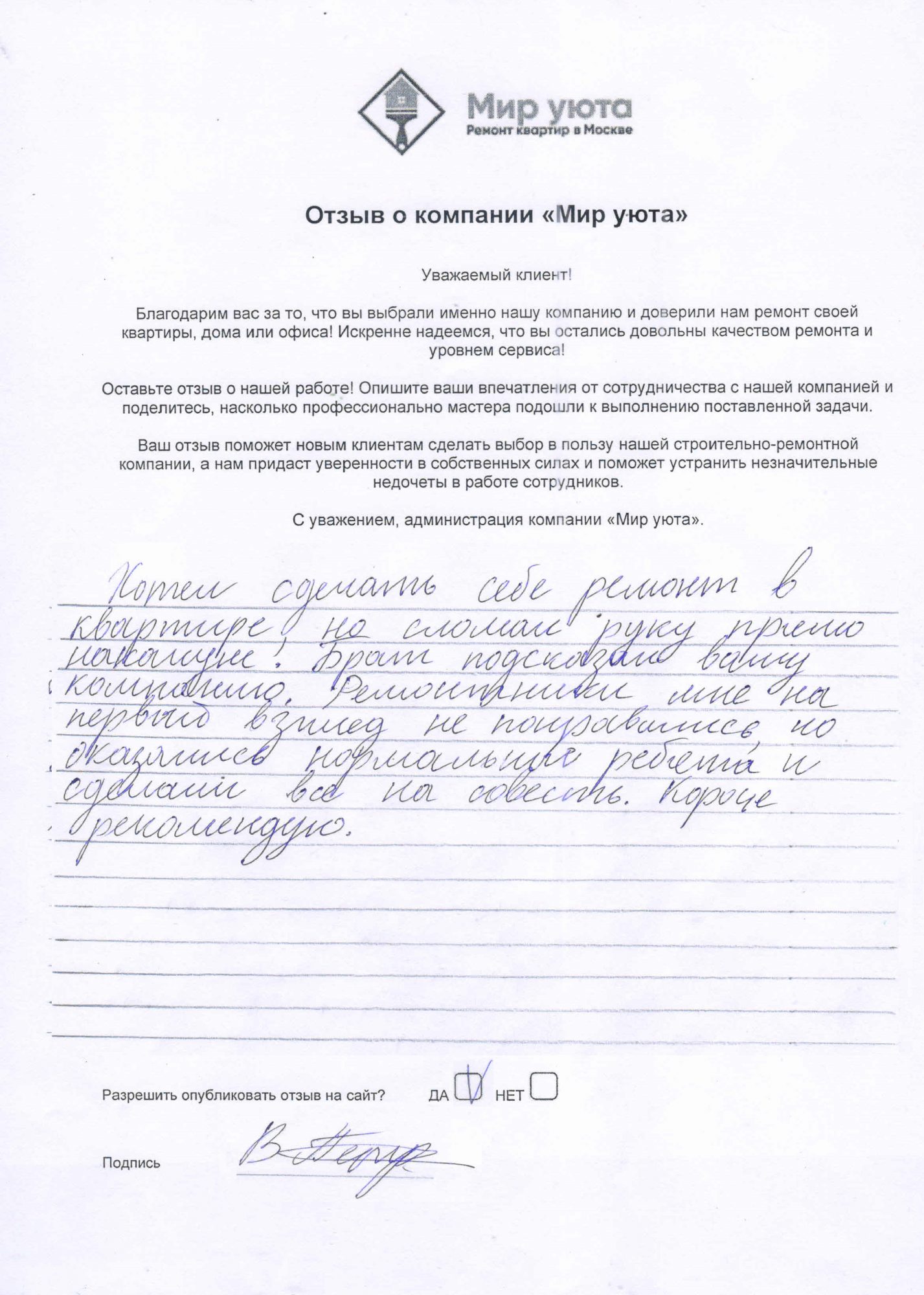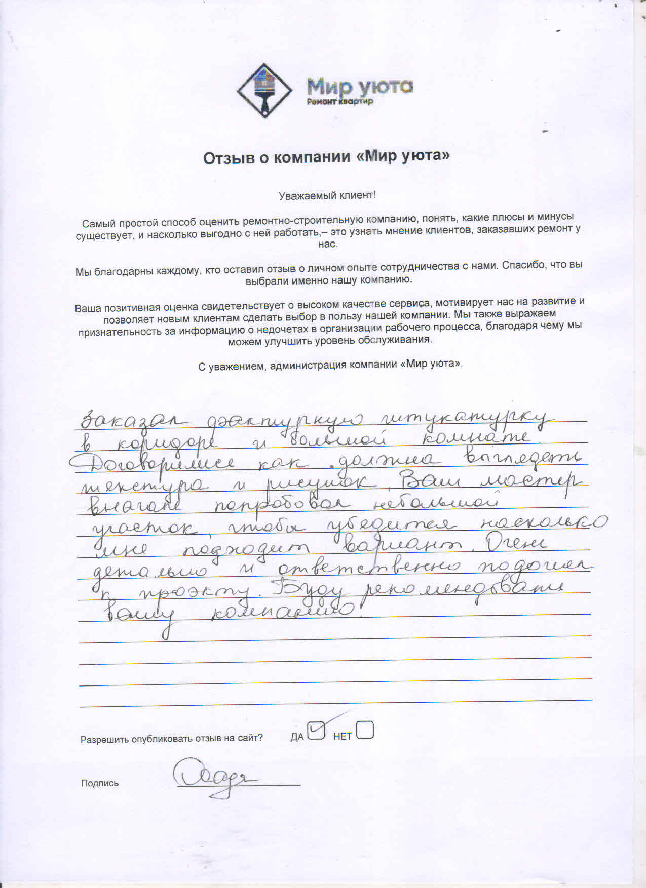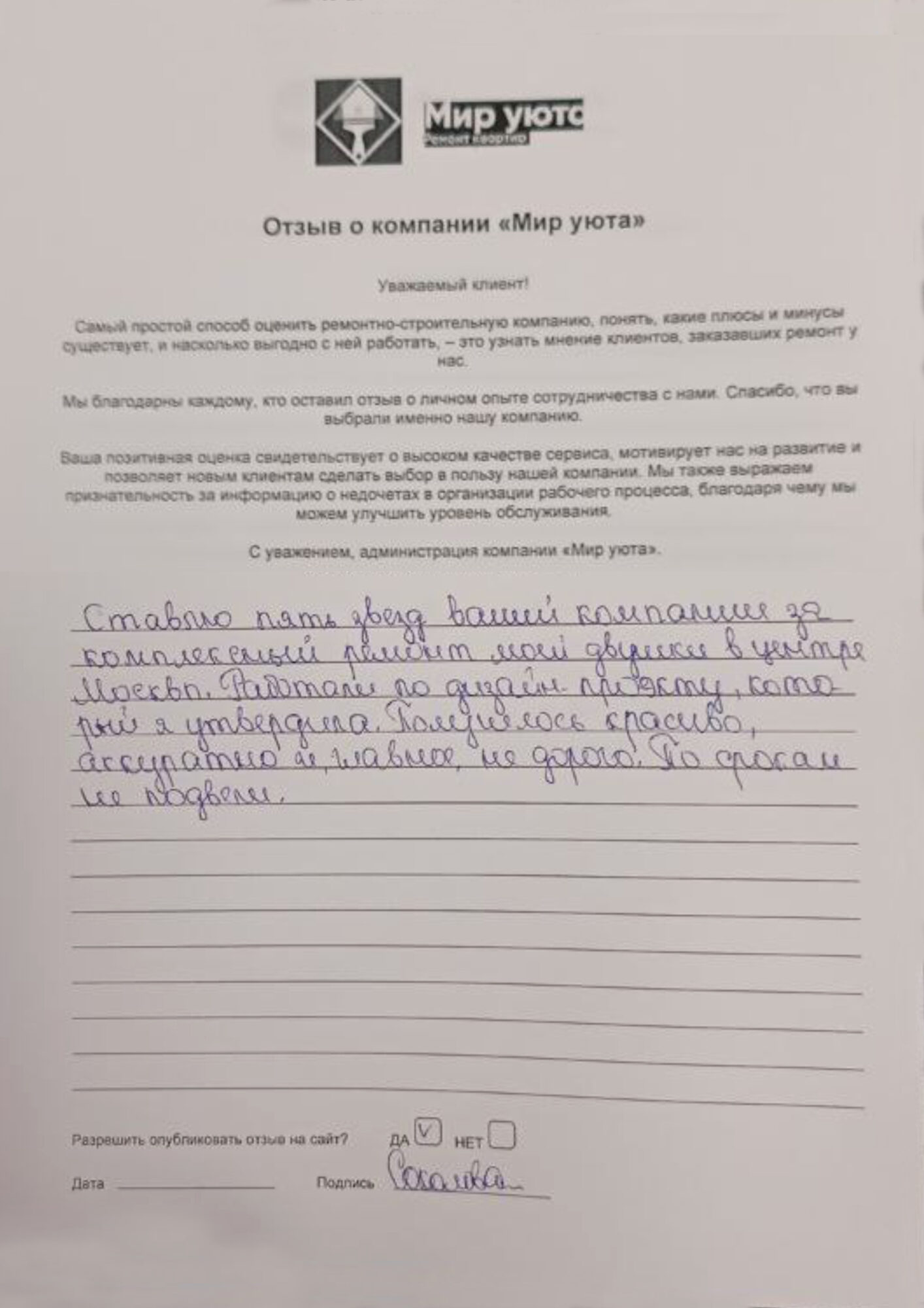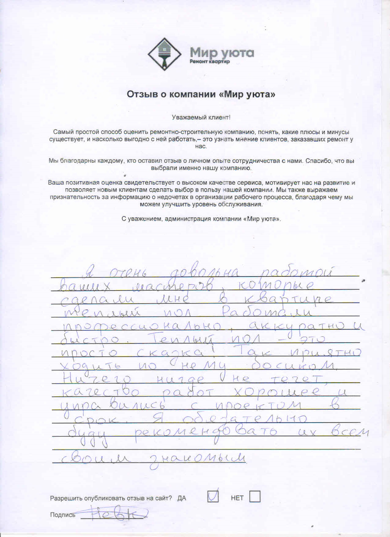 В данном разделе размещены отзывы наших клиентов, пожелавшим поделиться своими впечатлениями о качестве ремонта, профессионализме мастеров компании и уровне обслуживания. Мы еженедельно проводим опросы заказчиков, измеряя Индекс Удовлетворенности. Для нас важно мнение каждого, кто выбрал нашу ремонтно-строительную организацию в качестве исполнителя. Отзывы будут интересны и потенциальным заказчикам. Возможно, именно ваша оценка деятельности компании поможет потенциальным клиентам выбрать нас для выполнения будущего ремонта.