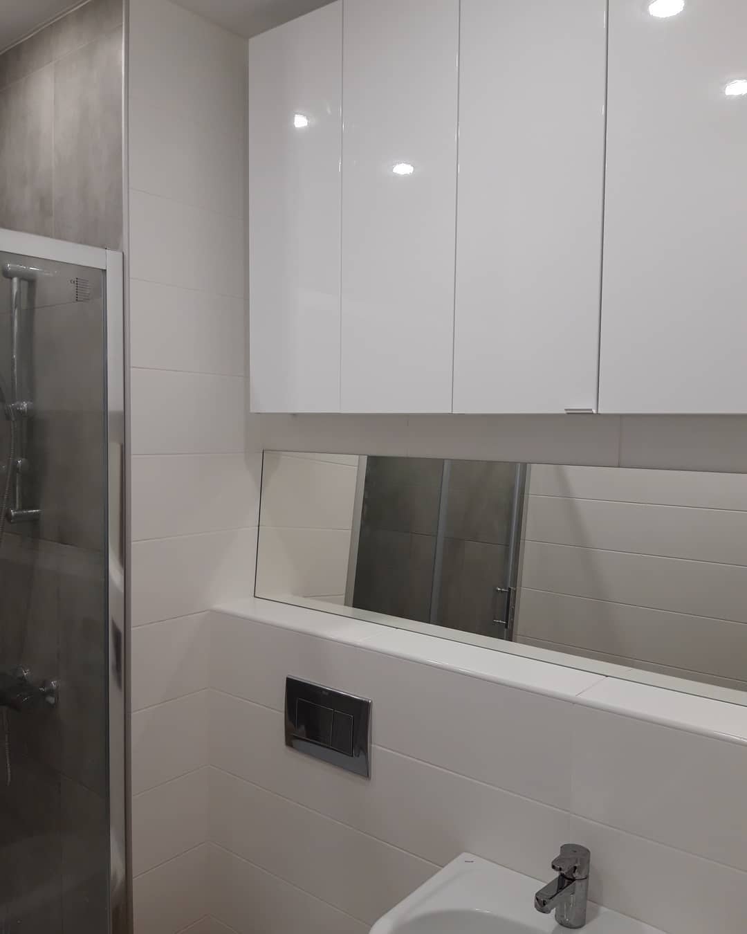 Наша компания выполнила капремонт совмещенного санузла в квартире на улице Фестивальная. При разработке дизайн-проекта дизайнер сделал упор на нестандартную планировку и расположил душевую кабину в глубокой боковой нише. Благодаря стеклянным дверцам и возведению невысокого подиума конструкция буквально сливается с общим интерьером и визуально не загромождает пространство. Модули для хранения банных принадлежностей размещены в верхней части стены над подвесным унитазом и мойдодыром и растворяются в плоскости за счет узких полок и монтажа глянцевых фасадов.