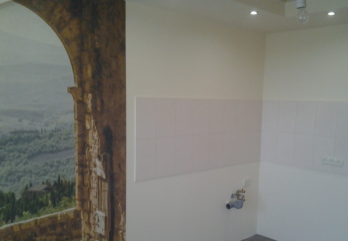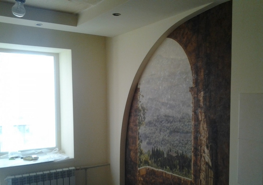 Просторная комната с широкой лоджией в однокомнатной квартире на улице Салтыковская оформлены в едином дизайне со стилизацией под старину. Стена визуально напоминают объемную арку с изображением кирпичной кладки и видами природы. На пол мастера уложили крупноформатную керамогранитную плитку, выложив уникальный узор в виде персидского ковра. В ходе ремонта на лоджии были смонтированы новые металлопластиковые окна. Дополнительно были смонтированы подвесной потолок со встроенными светильниками, выложен белоснежный фартук под будущую кухню, а также установлен кондиционер и заменены батареи отопления.