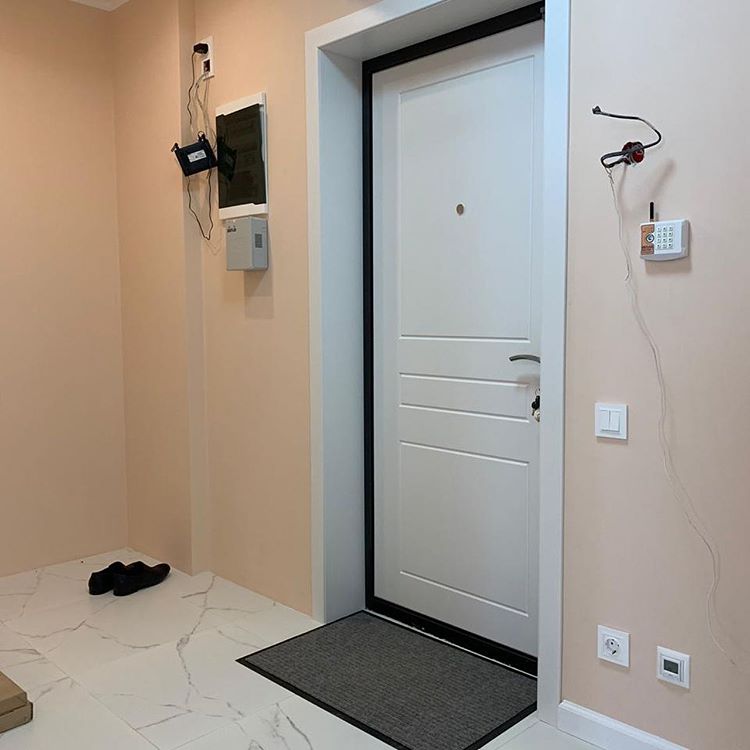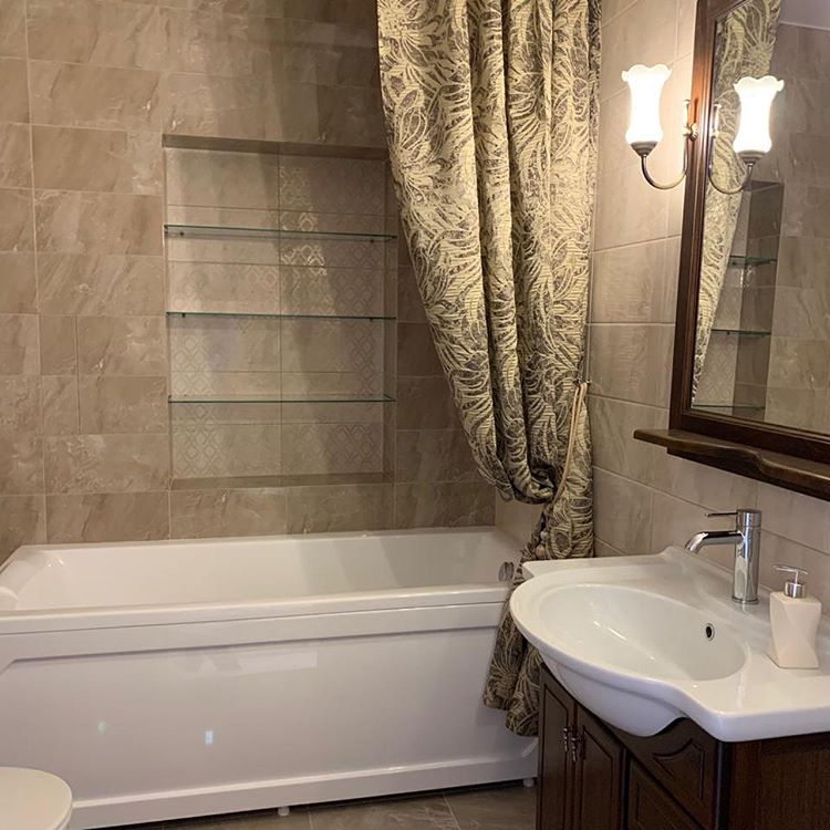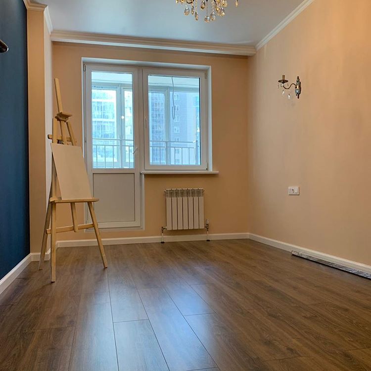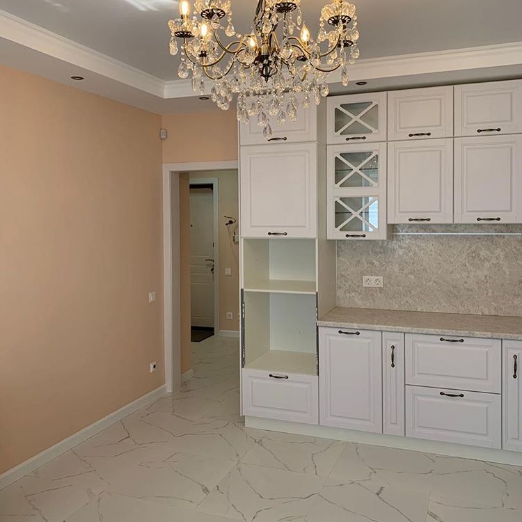 Наша компания выполнила дизайнерский ремонт однокомнатной квартиры на улице Новопетровской. Для придания интерьеру эксклюзивности мы уложили на пол кафельную плитку с имитацией мраморной кладки и навесили роскошные люстры в дворцовом стиле. Стены комнаты окрашены в персиковый и синий цвета. Напольное покрытие – ламинат с имитацией среза дерева. В кухне установлен кухонный гарнитур, а в ванной – массивная мебель, стилизованная под старину. Изысканности ванной комнате придают боковые бра с люстрами и тканевая штора. Дополнительно мастера смонтировали системы освещения, видеонаблюдения и поставили домофон.