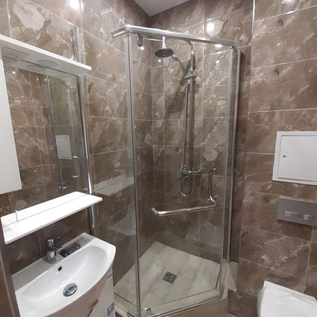 В ходе выполнения капремонта двухкомнатной квартиры на улице Планерная по дизайн-проекту мастера установили панорамные окна, стильно оформили балконную дверь, смонтировали подвесные потолки во всех помещениях со встроенными светильниками и задекорировали стены светлыми обоями (голубой, розовый, бежевый). Для оформления совмещенного санузла мы выбрали роскошный кафель с имитацией под мрамор. В помещении возведен подиум под душевую со стеклянными дверцами, подвесной унитаз, широкий умывальник с тумбой и ящиками, а также навесной шкаф с зеркалом.