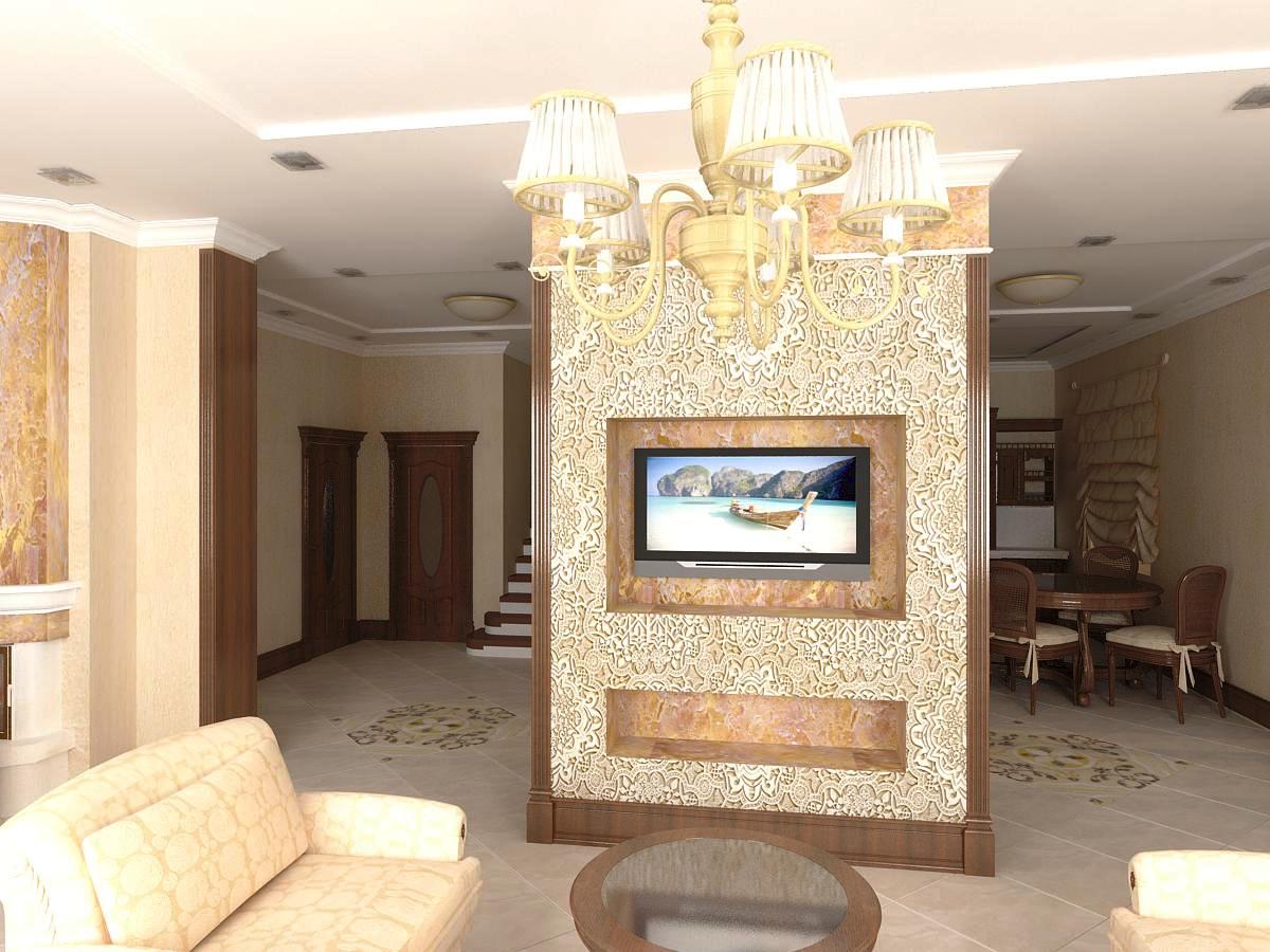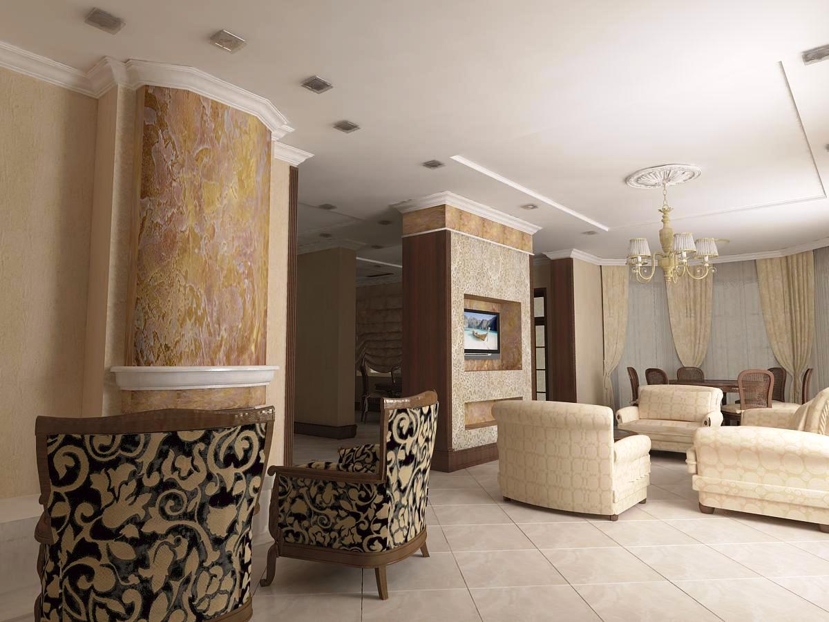 Для зонирования пространства в квартире, расположенной в новостройке на проспекте Маршала Жукова, мы выбрали монтаж декоративных простенков. За счет такого решения удалось создать уникальную роскошную атмосферу в духе неоклассицизма. Аристократичности интерьеру придают стилизованные под старину колонны, карнизы, лепнина и другие элементы дворцового декора. Общее впечатление усиливают светло-бежевые, бронзовые и светло-коричневые цвета, используемые в отделке поверхностей. В тон заданному классическому стилю оформлен санузел, стены и полы которого облицованы крупноформатным кафелем под мрамор.