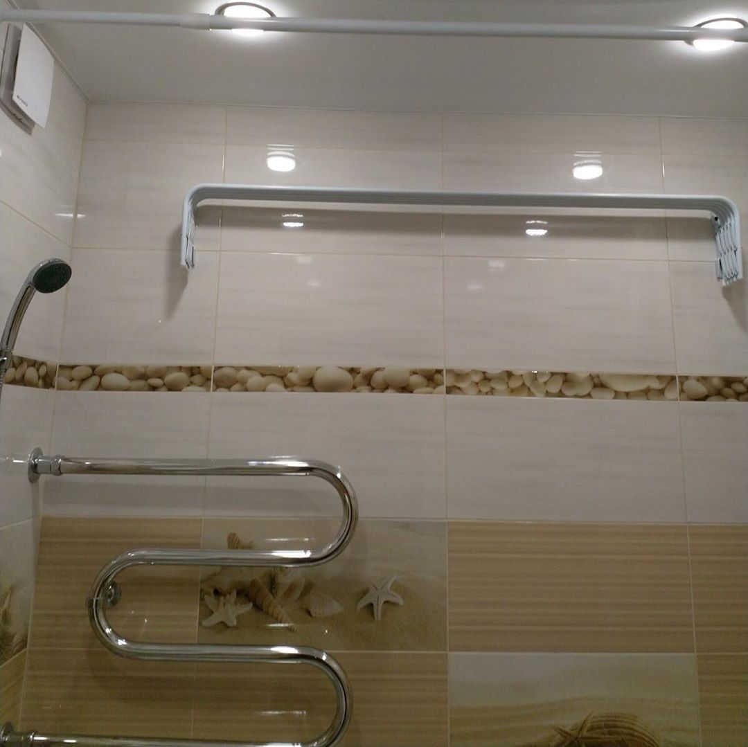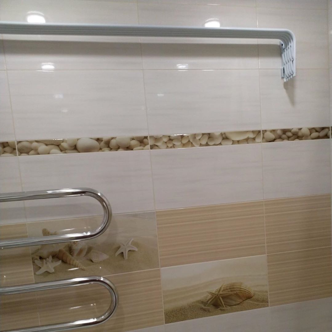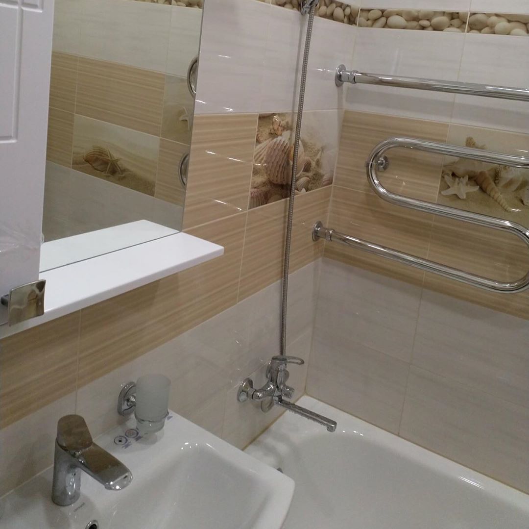 Наша компания выполнила капитальный ремонт ванной комнаты и туалета в квартире на улице Вучетича. Мастера выровняли все поверхности, уложили на пол светлый кафель, облицевали стены керамической плиткой белого, бежевого и коричневого оттенков, а на потолке установили подвесные конструкции со встроенными светильниками. В туалете смонтирован унитаз, коммуникации скрыты за защитным экраном. Эффект пребывания на пляже усиливается за счет украшения стен декоративными вставками с изображением морских камней и ракушек. В ванной комнате мы установили ванну, умывальник с тумбой, шкафчик с зеркалом, полотенцесушитель и сушилку для белья.