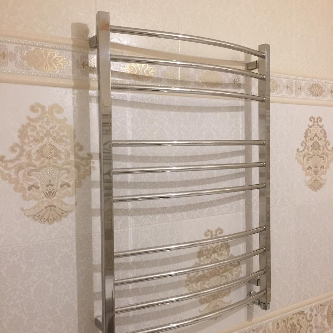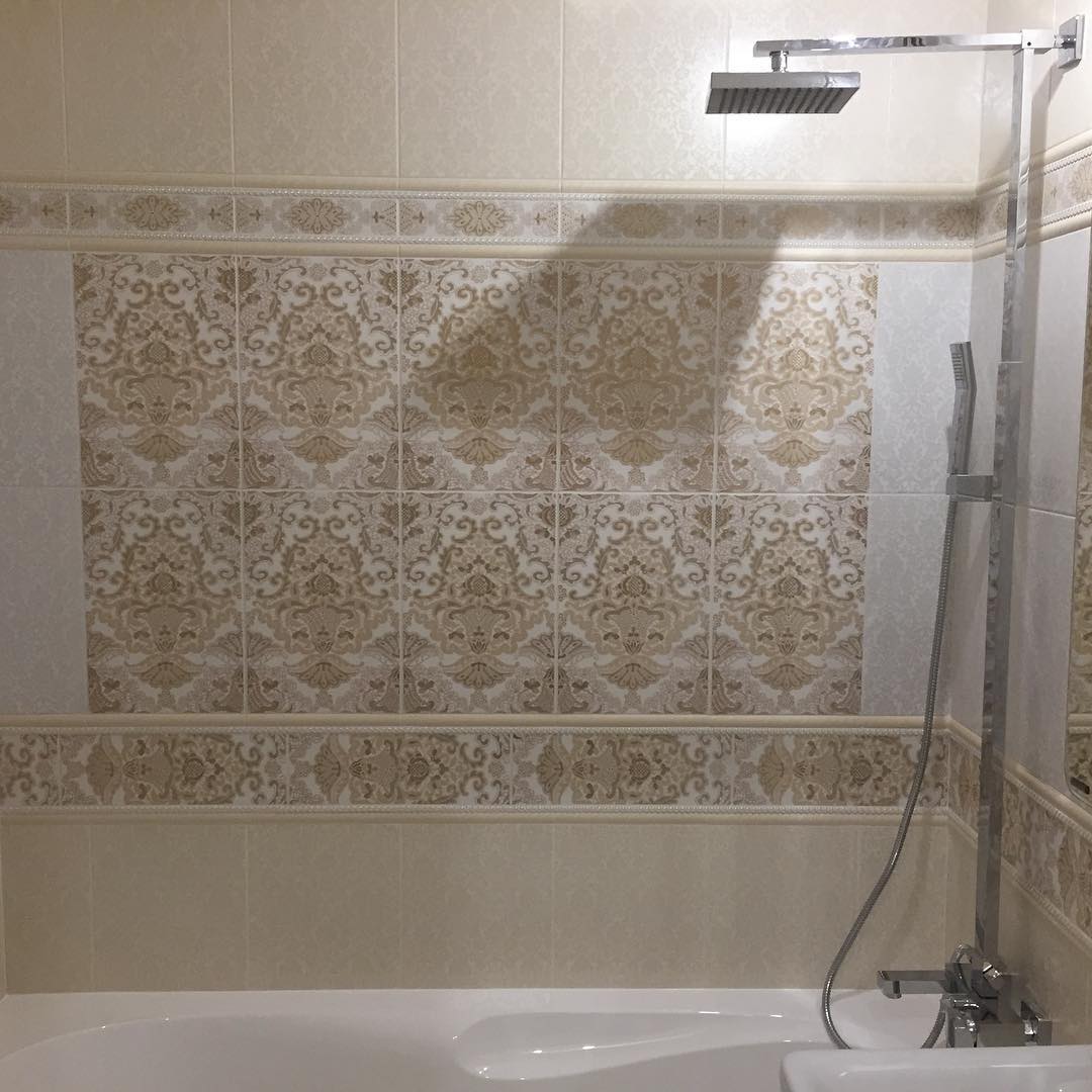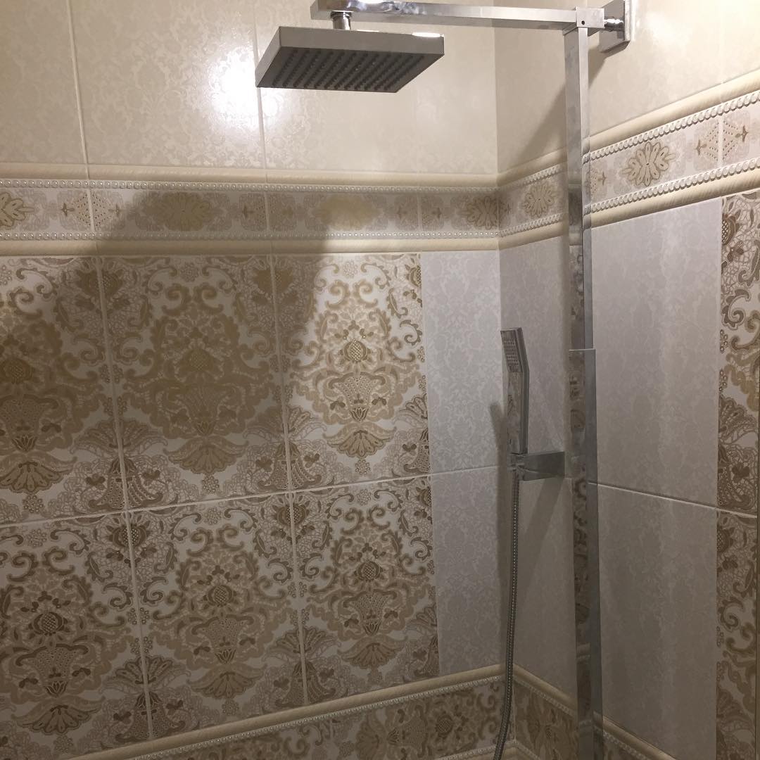 Наша компания сделала капитальный ремонт ванной комнаты в квартире на Варшавском шоссе в дворцовом стиле. Для придания интерьеру нарядности мы выложили на стенах панно из кафеля с имитацией под роскошный настенный ковер. Самобытности помещению придают ванна квадратной формы с поручнями для рук, небольшой умывальник с тумбой, оснащенный боковым смесителем рычажного типа, и массивный душевой шланг «тропический ливень». Также в комнате установлены полотенцесушитель и стеклянная раздвижная дверца на ванной.