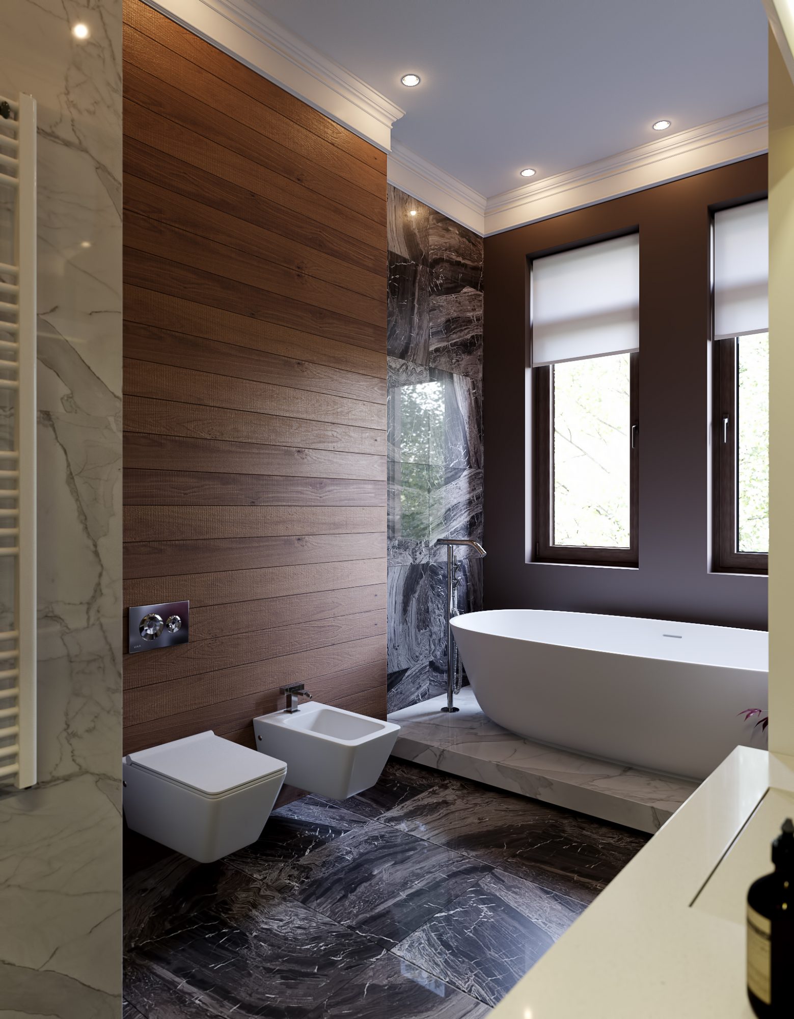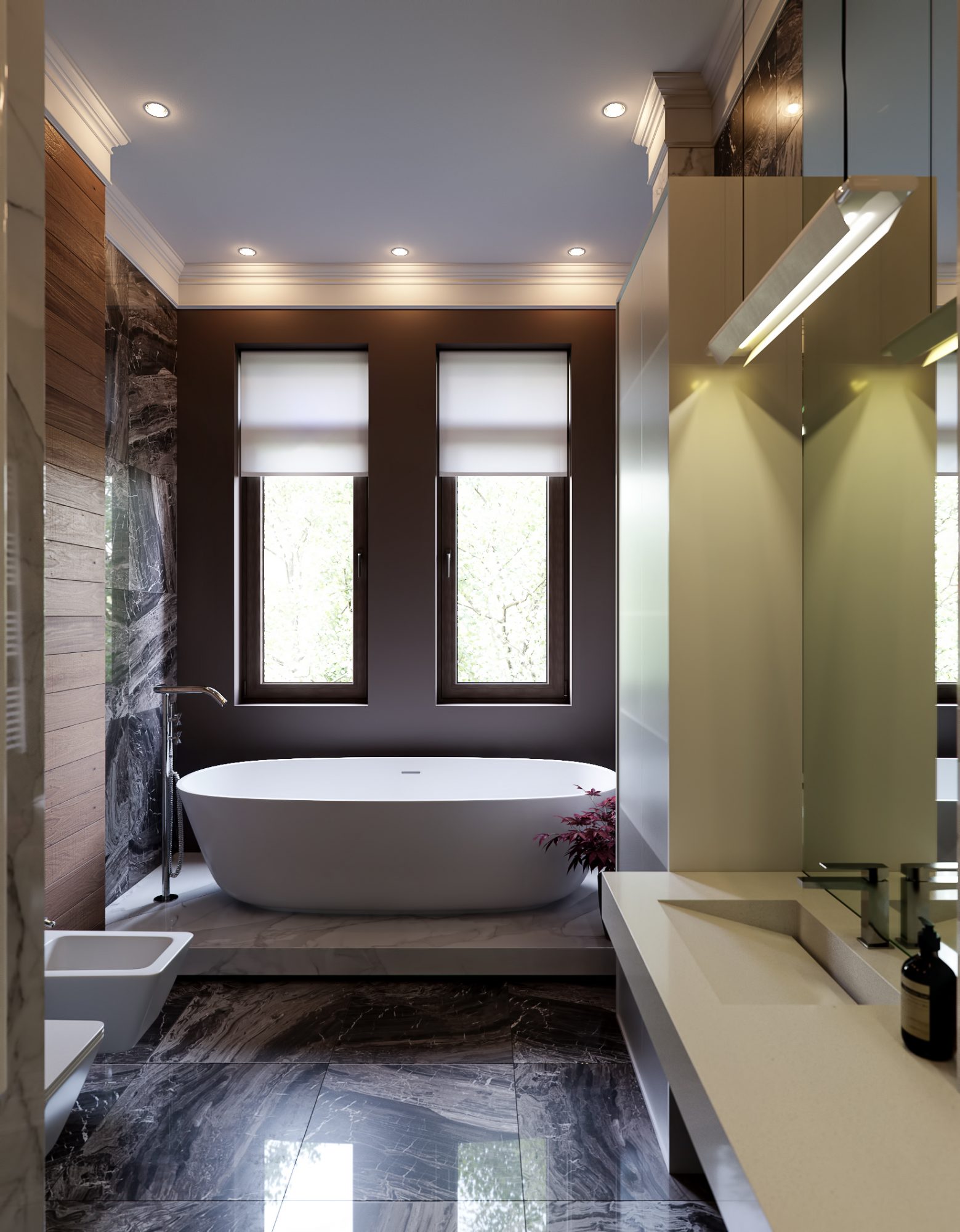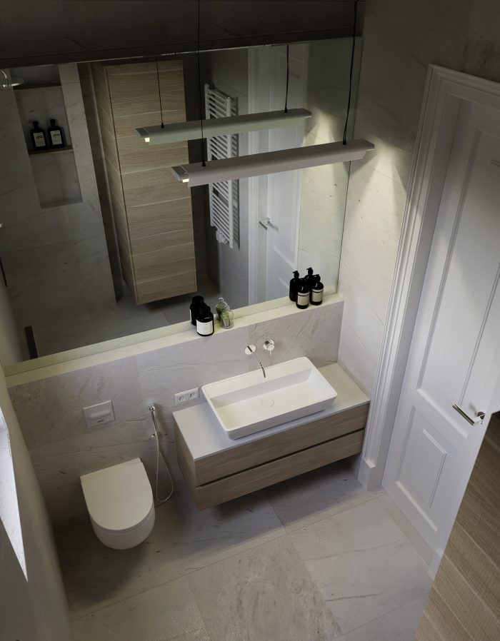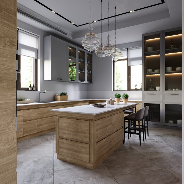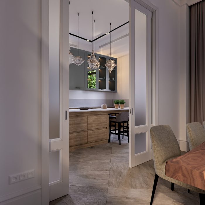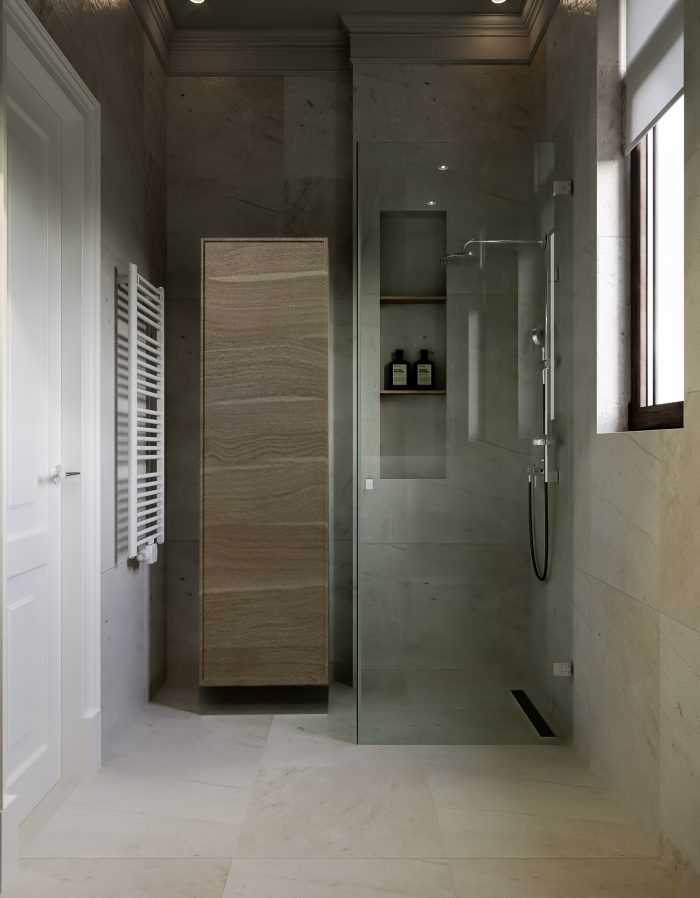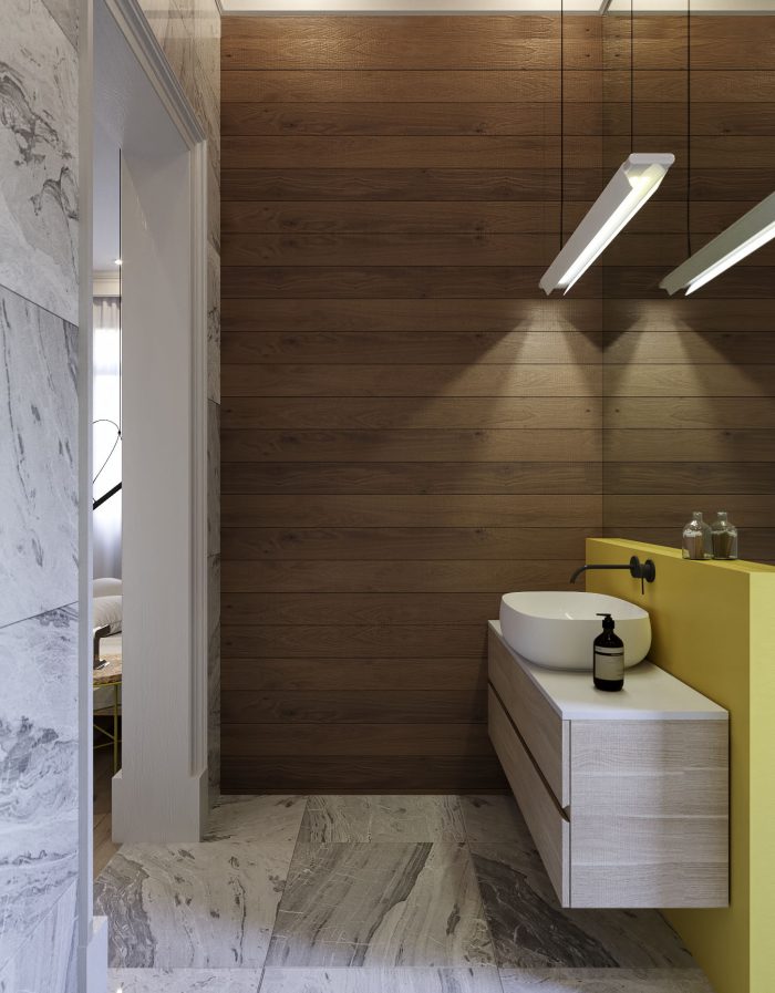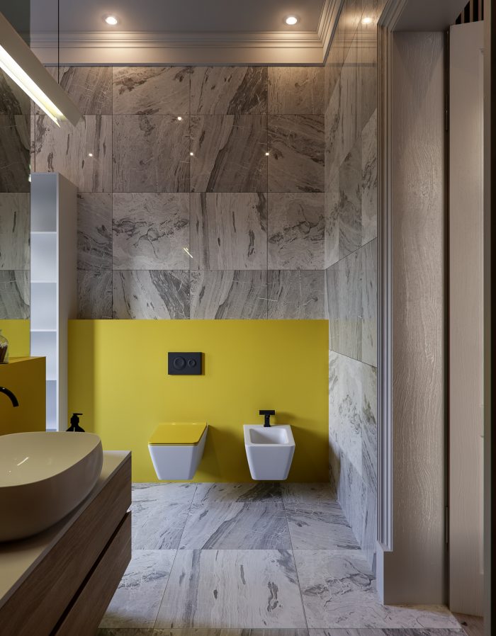 Два холла и две кухни оформлены в тон общему стилю с преобладанием мягких тонов и декорированием фасадов мебели покрытием с имитацией среза натурального дерева. Три санузла выполнены в необычных цветовых решениях, в одном установлена яркая желтая сантехника, во втором – аристократическая отдельно стоящая ванна под старину, подвесные рукомойник, унитаз и биде, а в третьем – ультрасовременные белоснежные модели сантехнических устройств.