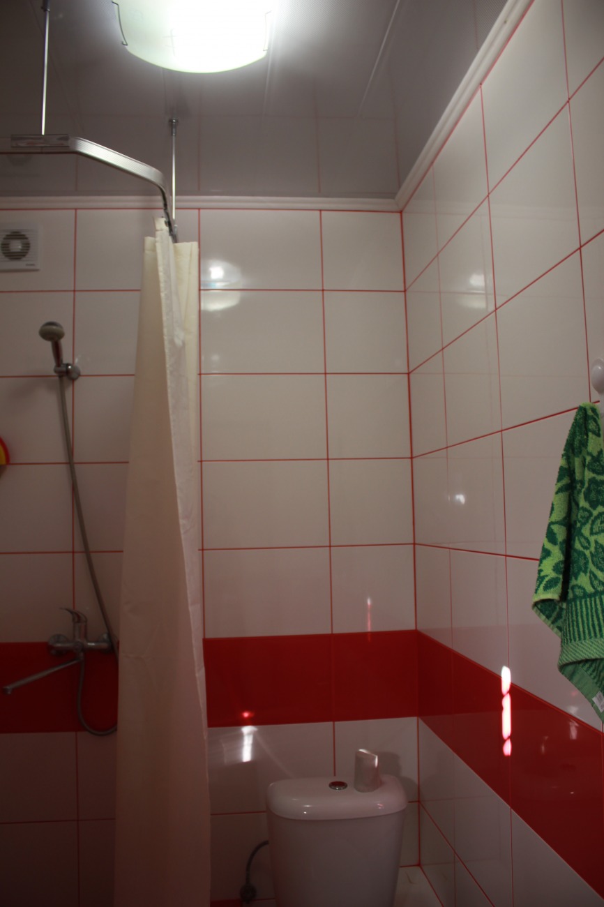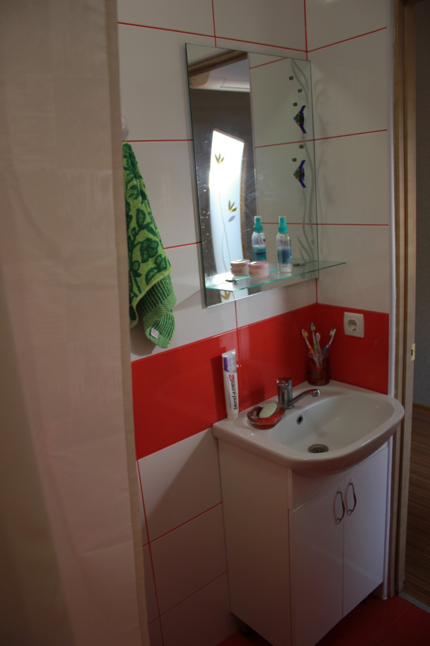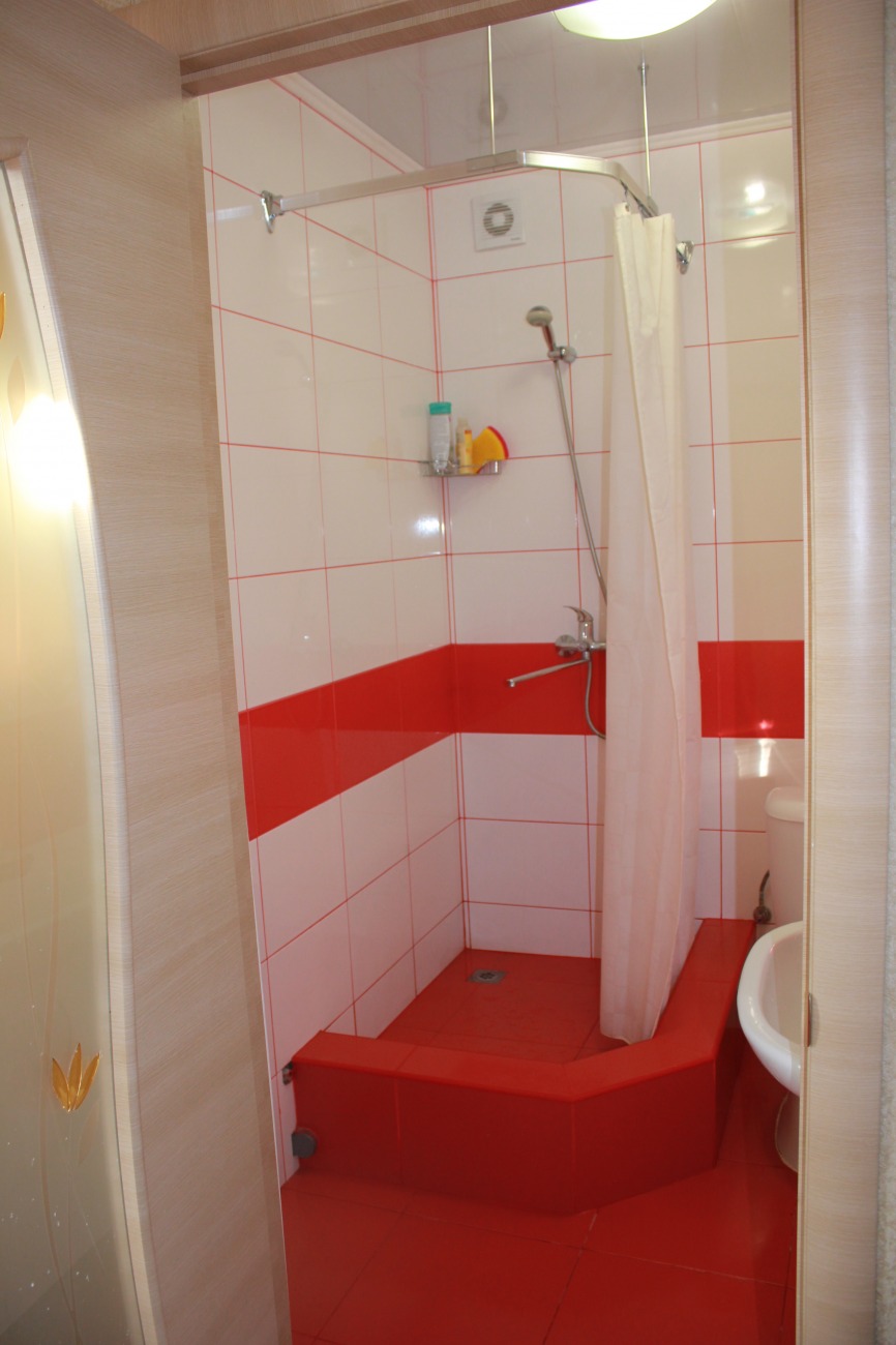 Наша компания выполнила комплексный ремонт малогабаритной квартиры на улице Гарибальди по дизайнерскому проекту. Для отделки поверхностей мы выбрали темный ламинат, рельефные обои бежевого цвета, а также ярко-красный и белый кафель. Красная керамическая плитка уложена в рабочей зоне кухни и на полу в санузле. Сантехники установили унитаз, тумбу с умывальником и оформили подиум с высокими бортиками под душевую кабину. На кухне мы собрали и смонтировали кухонный гарнитур.