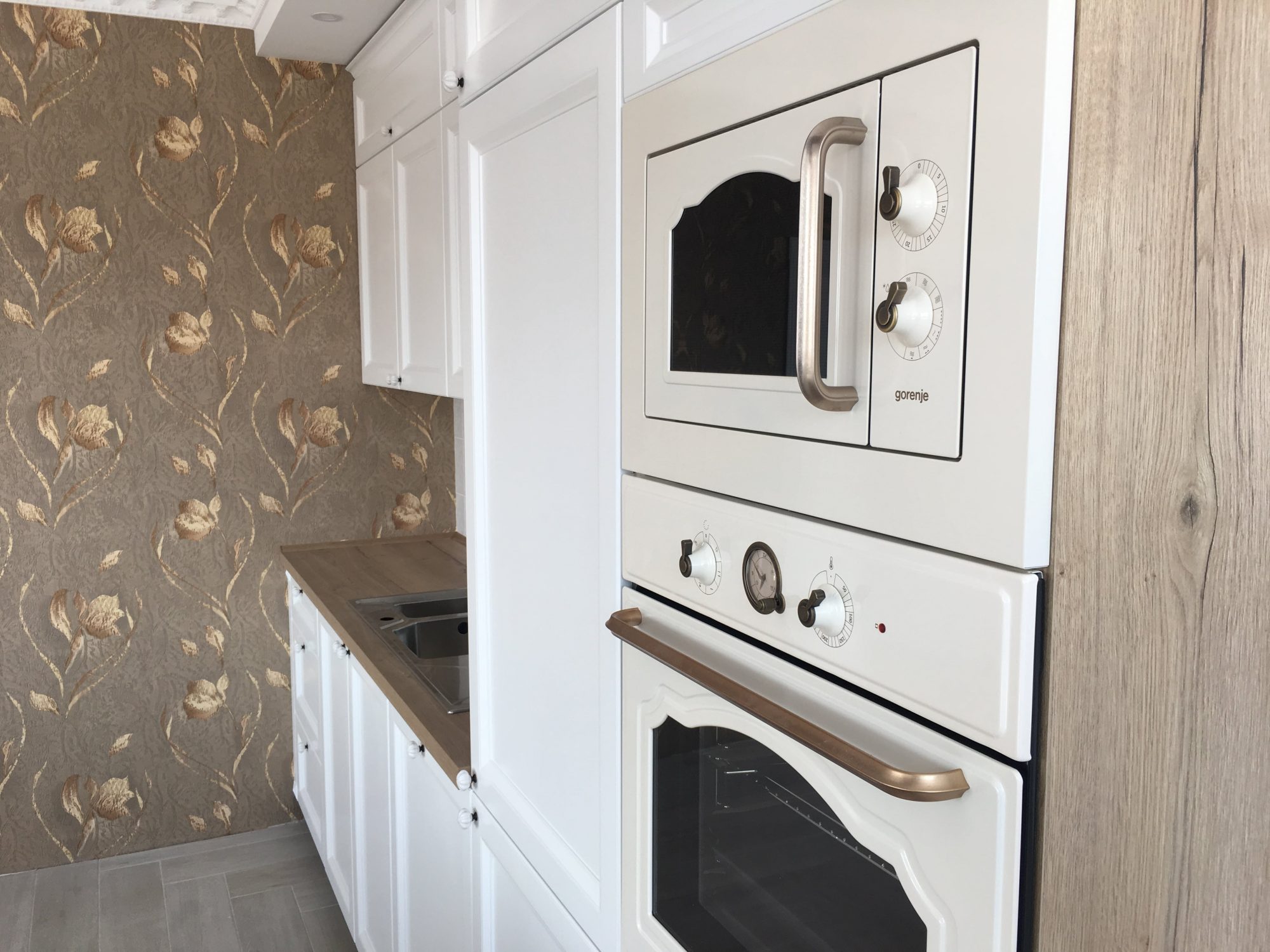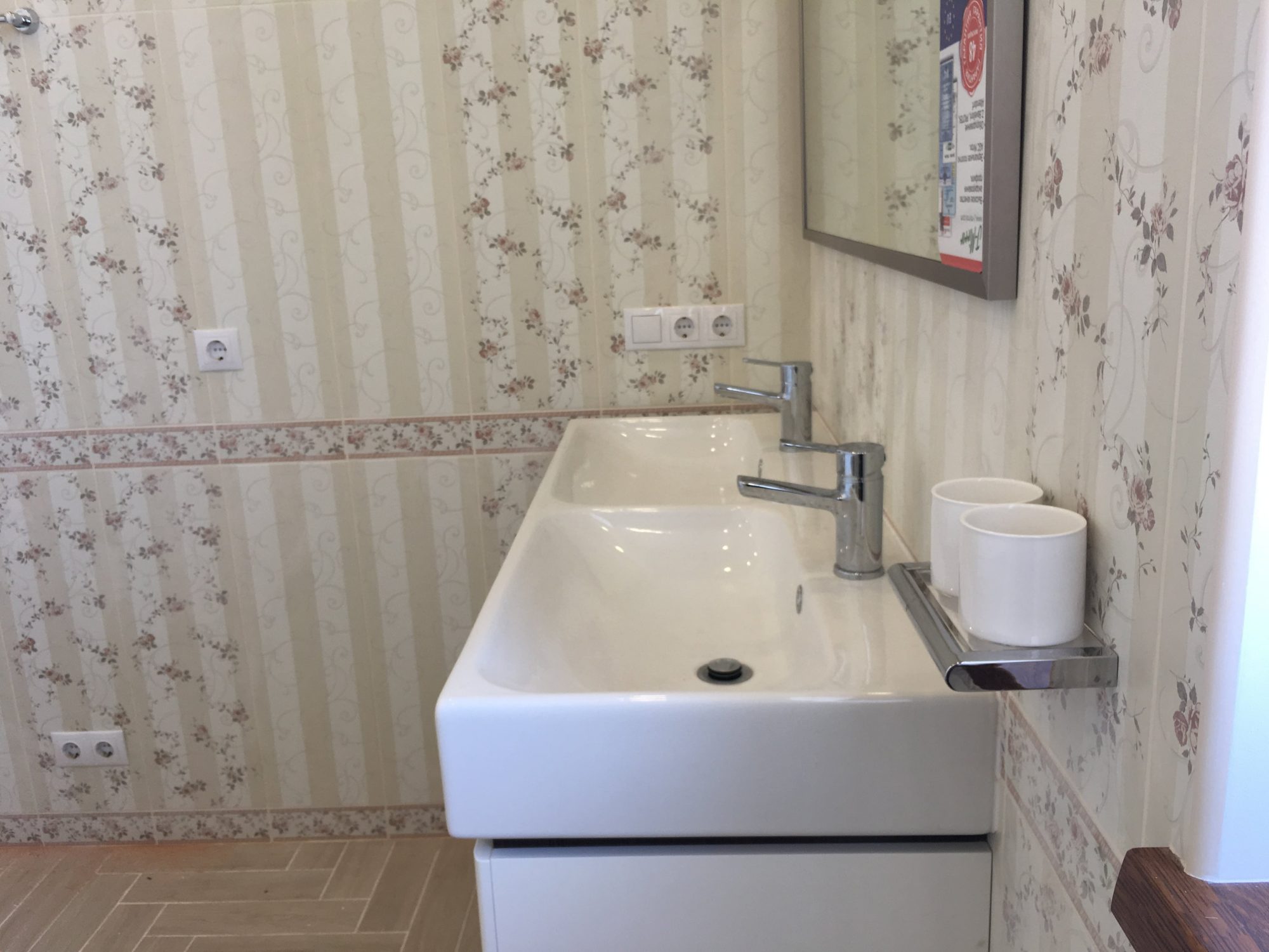 В доме была проложена новая система отопления, смонтированы распределительная гребенка и электрощитовая, а во всех комнатах – кондиционеры и новые розетки. В санузле установлена необходимая сантехника: подвесные унитаз и биде, ванна, тумба с двумя умывальниками, зеркало, а на кухне – мебельный гарнитур. Цветовая гамма: белая, черная, бронзовый.