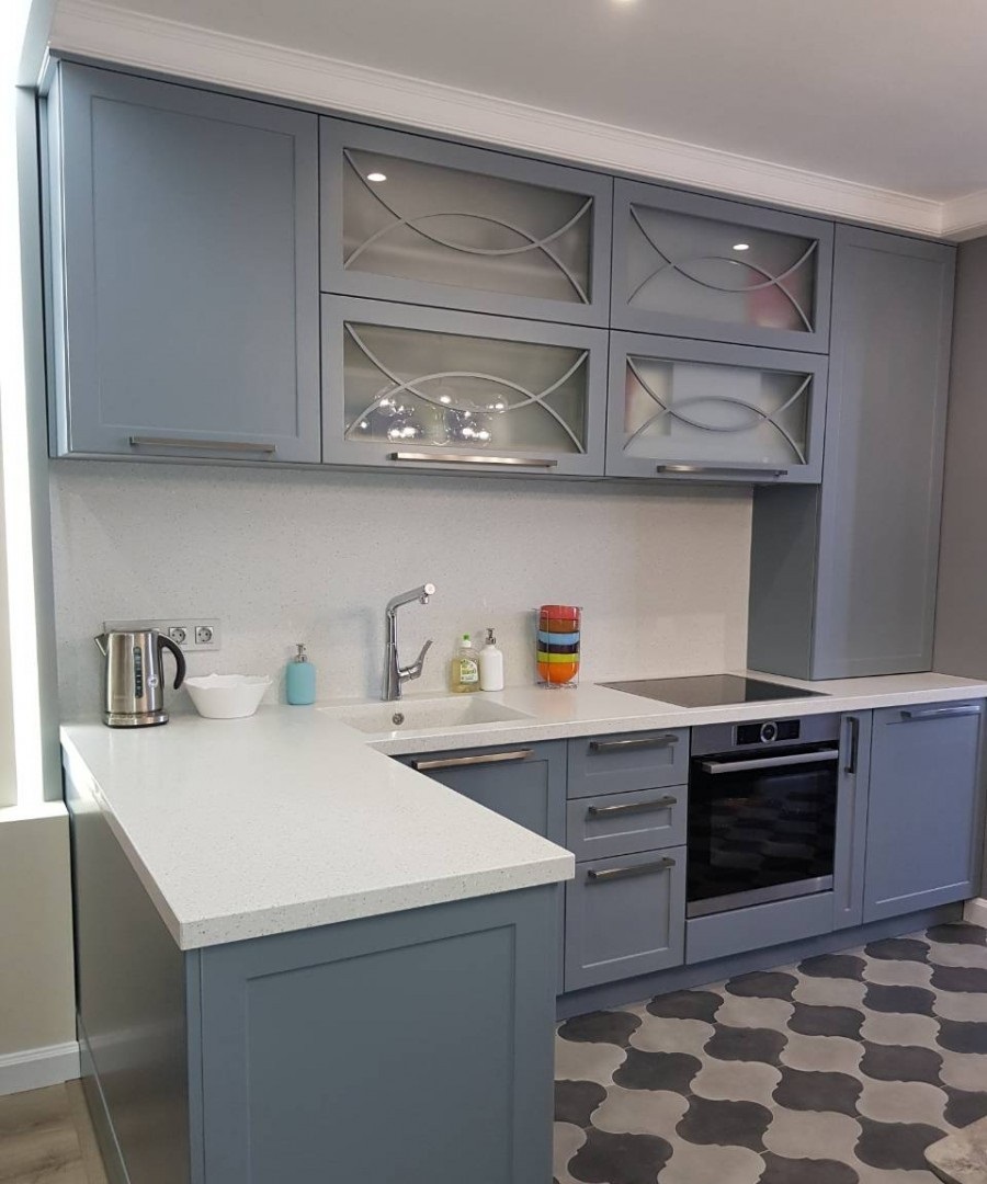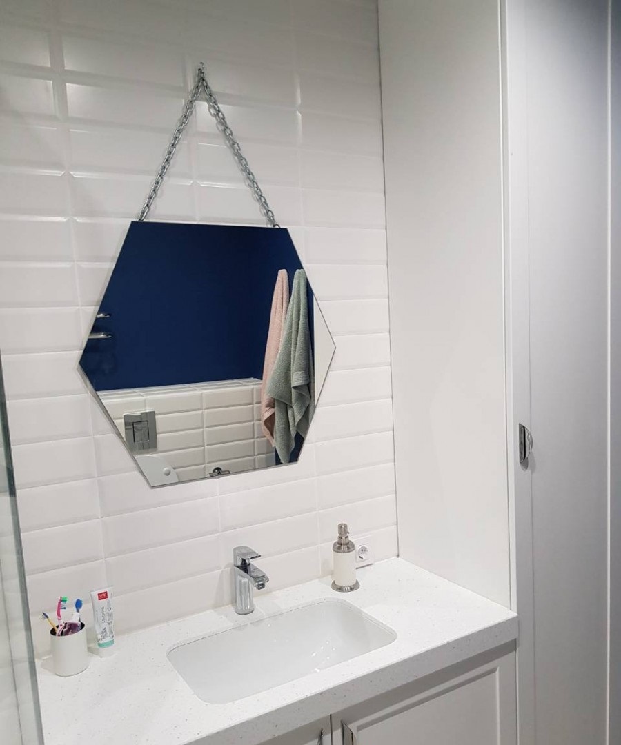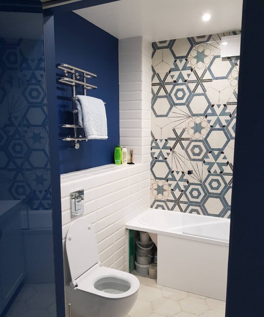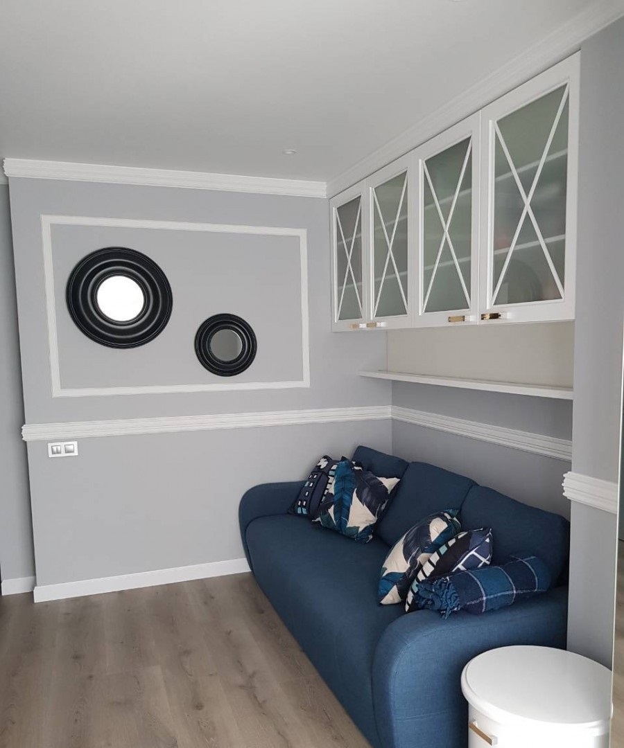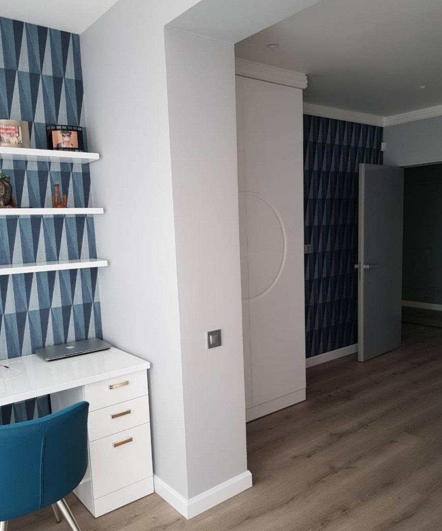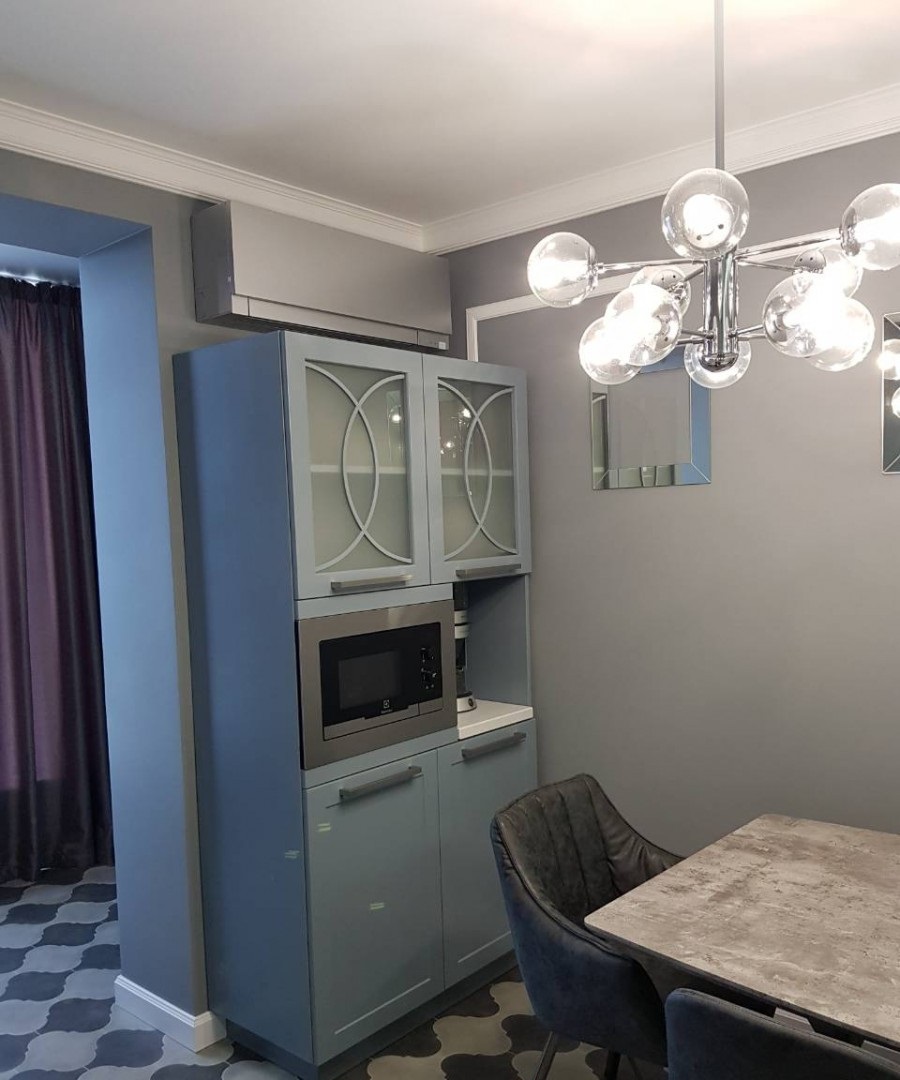 Оживить интерьер трехкомнатной квартиры, выполненной в трендовых бело-серых тонах, удалось за счет ярких акцентов в отделке поверхностей и нестандартного декора. Нарядности помещениям добавляют сочные принты на обоях, которыми украшены часть стены в детской, гостиной и прихожей. Классическая кухня с мебелью строгих геометрических форм роскошно смотрится на фоне рельефного узора на полу. Мерцающий свет от дизайнерского светильника отражается в стеклянных витражах с нестандартной раскладкой решетки. Для отделки ванной комнаты выбраны белоснежная и синяя плитка. Акцентирующие элементы – восьмиугольное зеркало и оригинальный орнамент на стене.