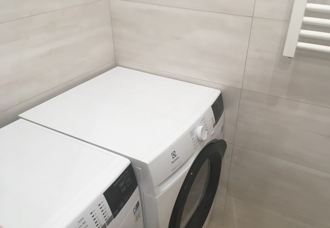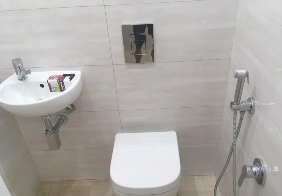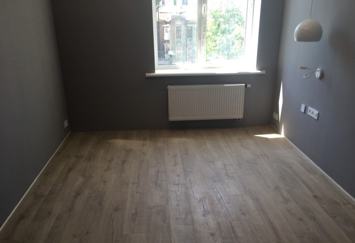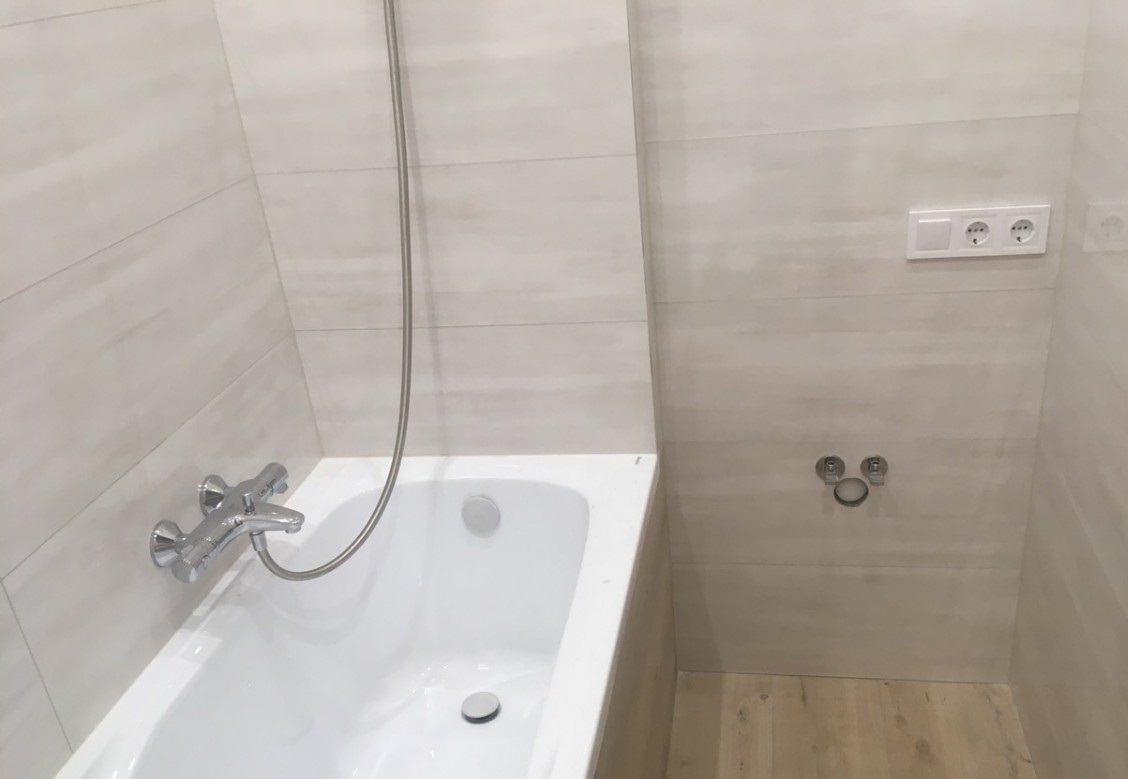 Для косметического обновления поверхностей мастера нашей компании выровняли потолки и стены, выкрасили их в светлые тона и застелили пол ламинатом с имитацией дерева. Также мы заменили оконный и дверной блок, смонтировали электрощитовую с выведением отдельных автоматов УЗО для бытовой техники, установили подвесную раковину и унитаз, после чего провели новую систему освещения. Для облицовки стен санузла использовалась крупногабаритная кафельная плитка под натуральный камень.