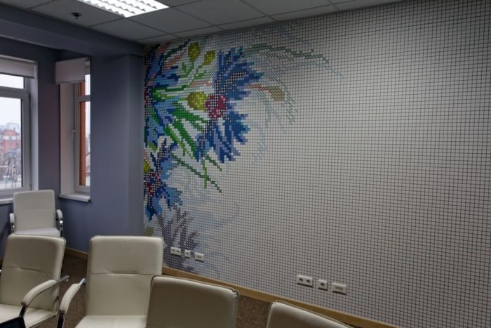 Основные цвета в интерьере: все оттенки серого и коричневый. Изюминки дизайна: роскошное мозаичное панно с цветочным орнаментом во всю стену в конференц-зале и небольшие перегородки, предназначенные для разделения помещения на автономные зоны.