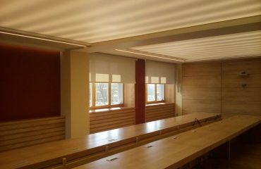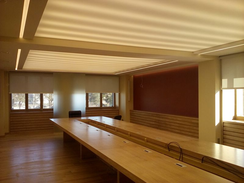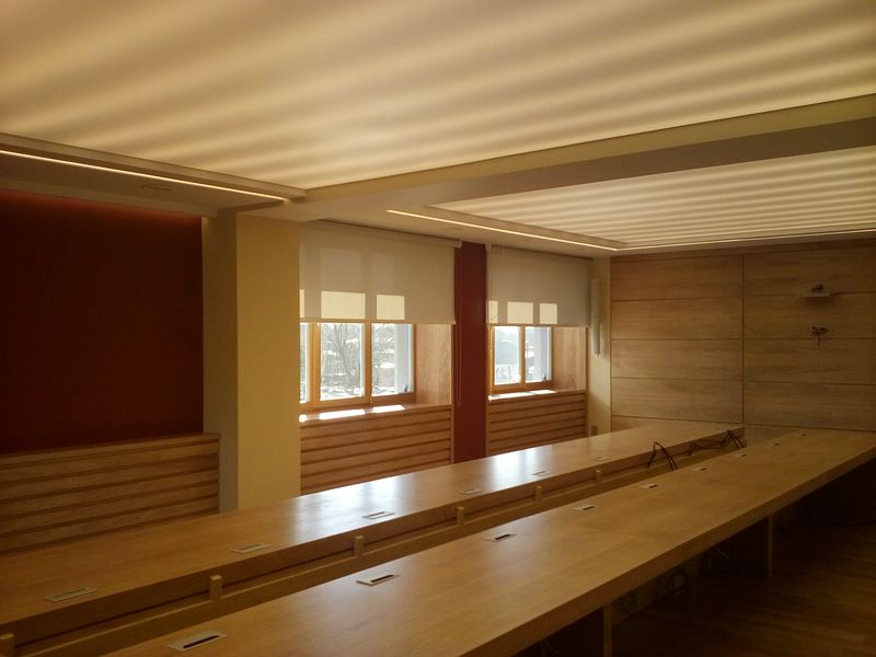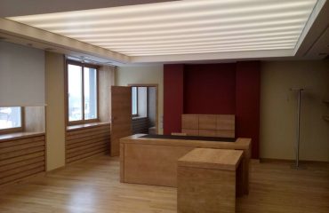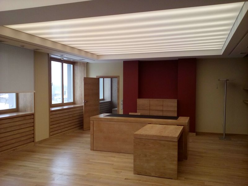 Наша компания выполнила косметический ремонт офиса на Варшавском шоссе. При разработке дизайна всех офисных помещений дизайнер выбрал светлые оттенки в отделке и сделал упор на придание объема помещениям. С этой целью на потолке мастера установили необычную подвесную конструкцию с встроенными полосами точечными светильниками.