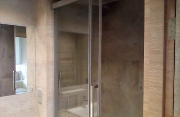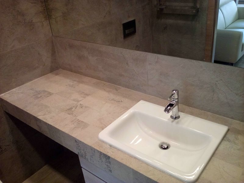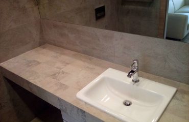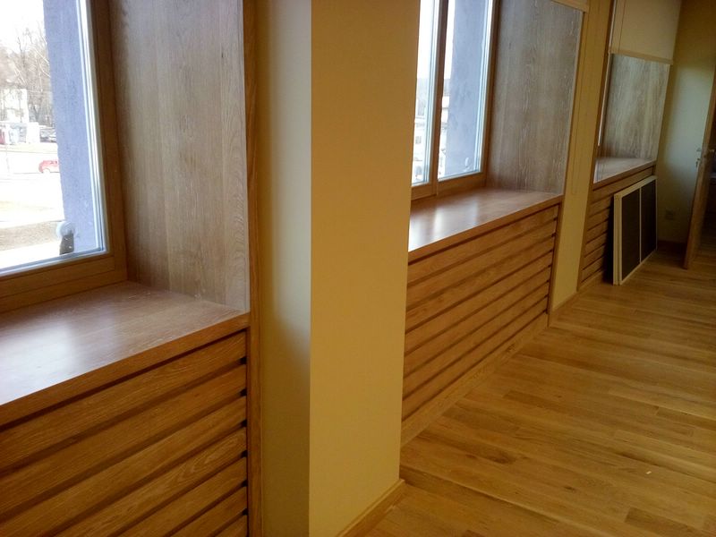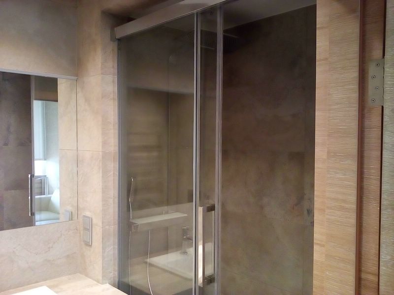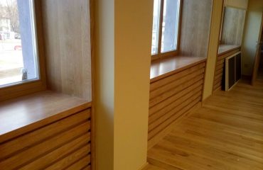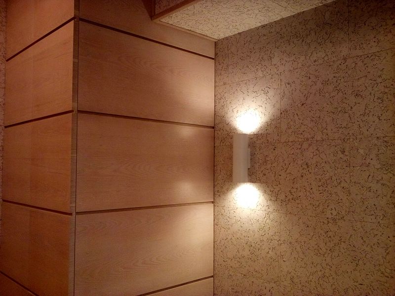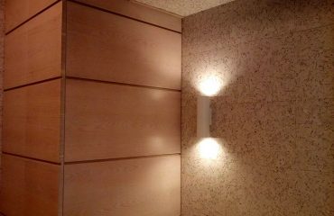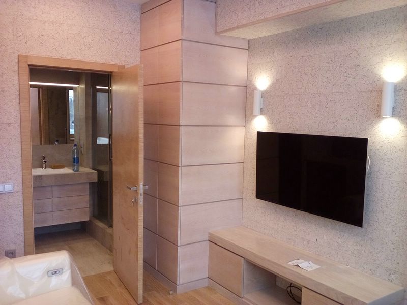 Основные достоинства интерьера: много дерева, стекла, зеркал, солидная мебель и декорирование окон элегантными римскими шторами. Уютной и одновременно респектабельной обстановки удалось добиться за счет монтажа деревянных панелей на стенах, укладке паркетной доски светло-коричневого цвета на пол и облицовке поверхностей в санузле плиткой с имитацией под натуральный камень. Электрики сделали новую проводку, смонтировали розетки, повесили эксклюзивные осветительные приборы и дополнительно проложили линии оптоволоконного кабеля для создания локальной сети.
