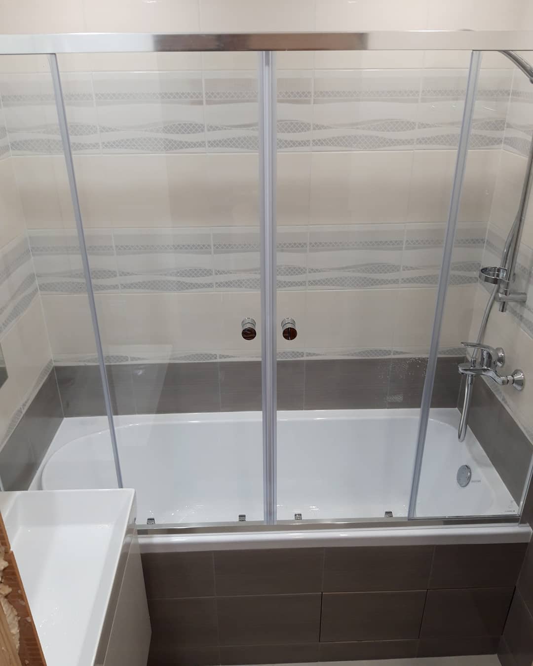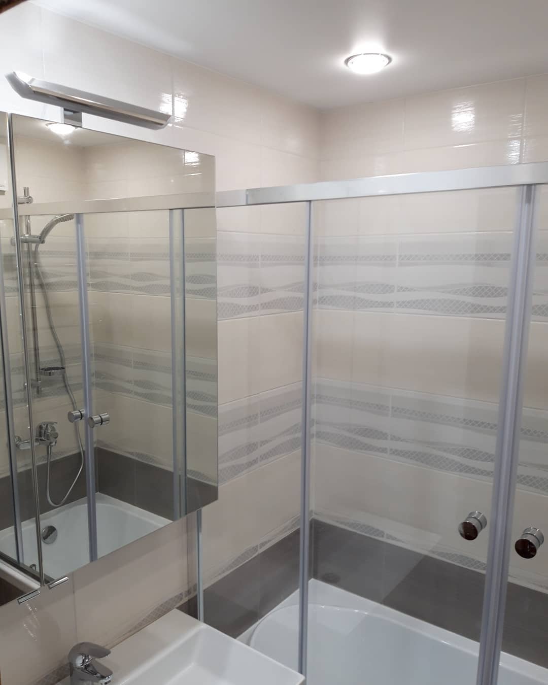При выполнении капремонта ванной комнаты в квартире на улице Кастанаевская мастера демонтировали старую отделку и устаревшую сантехнику, облицевали поверхности кафелем трех видов в трендовой серой расцветке, а также установили подвесной потолок с вмонтированными точечными светильниками. Изюминки интерьера – раздвижные стеклянные панели над ванной, современная модель подвесного умывальника с глубокой квадратной мойкой и стильное панно в центре экспозиции на стене. Из сантехники смонтированы также душ и полотенцесушитель.